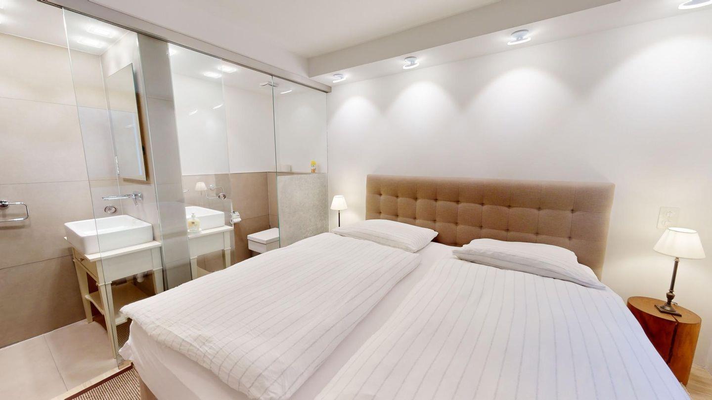 Grosszügige 4.5-Zimmerwohnung mit modernem Wohnkomfort. Der helle Wohn- und Essbereich mit Kamin überzeugt durch seine elegante Einrichtung und bietet direkten Zugang zur Terrasse mit herrlichem Blick über das Tal. Geschlossene, gut ausgestattete Küche. 1 Schlafzimmer mit Doppelbett, eigenem Bad (Dusche/ WC), 1 Schlafzimmer mit Doppelbett, grosszügiges Badezimmer (Badewanne/ Dusche/ WC), 1 Schlafzimmer mit Doppelbett, separates Badezimmer (Dusche/WC). Lift und 1 Doppelgarage (1 Ladestation für Elektroautos steht zur Verfügung).