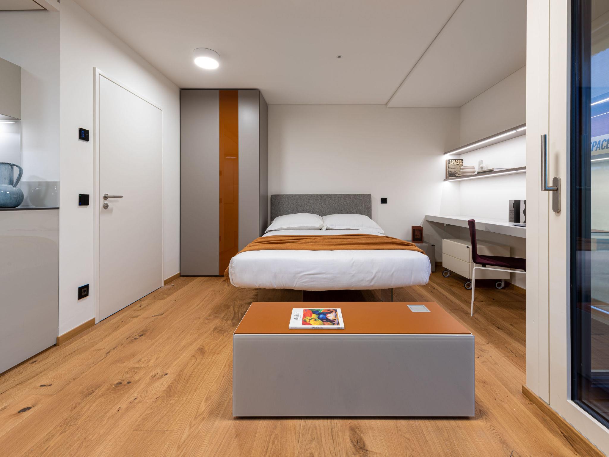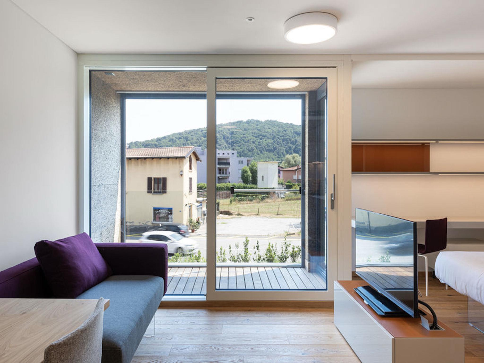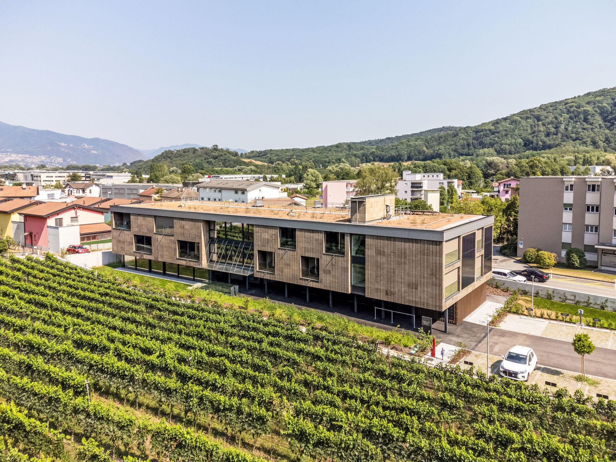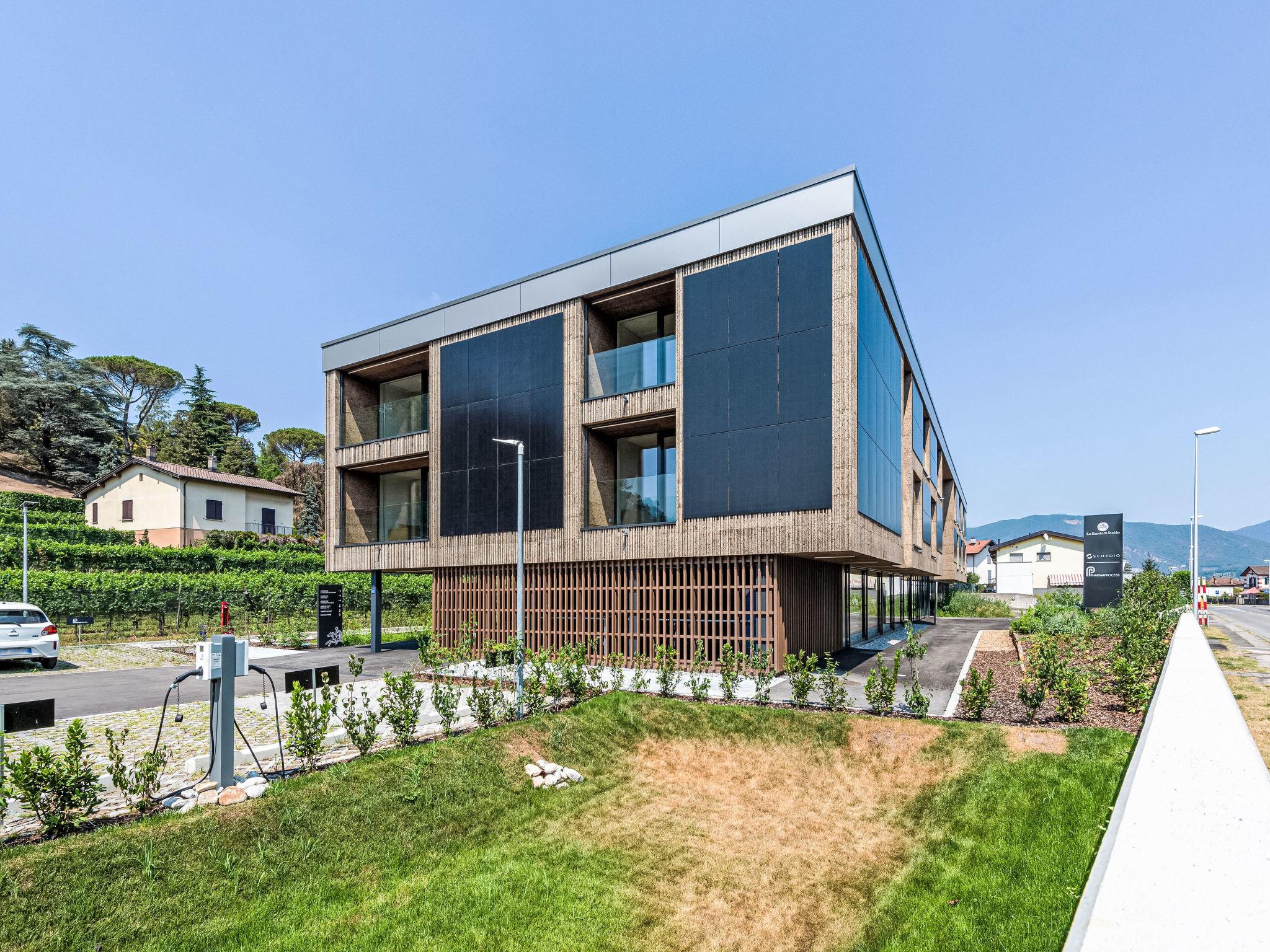 Stabio 20 km von Lugano Centro: Modernes, freistehendes, komfortables Apart-Hotel "Lo Scudo di Stabio", 350 m.ü.M., auf 2 Stockwerken, Baujahr 2022, umgeben von Wiesen und Weinbergen. 15 Wohnungen in der Residenz. Im Ort, 1 km vom Zentrum von Stabio, an einer Hauptstrasse, Richtung Nordosten. Zur Mitbenutzung: Grundstück 1'000 m2, grosser, schöner Garten Rasen und Pflanzen. Im Hause: Empfang, Aufenthaltsraum mit TV, Wireless LAN, Fahrstuhl, Einstellraum für Fahrräder, Zentralheizung, Klimaanlage. Wäschewechsel täglich (zusätzlich extra). Handtuchwechsel täglich (zusätzlich extra). Wohnungsreinigung täglich möglich (extra). Zufahrt bis zum Haus. Parkplatz auf dem Grundstück. E-Ladestation. Supermarkt 1 km, Bar 550 m, Bushaltestelle 1 m, Bahnstation "Stabio" 1.2 km. Nahe gelegene Sehenswürdigkeiten: Fossilienmuseum Arzo 4.8 km, Chicco d'Oro Kaffee Museum 5 km, Villa Braghenti 8 km, La Vecchia Stazione 8 km, Torre Pezza 9 km, Madonna di San Bernardino 9 km. Bekannte Seen in der Umgebung sind gut erreichbar: Lago di Lugano 5 km. Wandergebiete: Monte San Giorgio 9 km, Monte Generoso, Valle di Muggio. Aussenbereich : Picknickbereich, Gartenmöbel, Garten. Allgemeiner Bereich mit Gemeinschaftslounge/TV Bereich, Snackautomaten, Getränkeautomaten, Kaffe- und Teezubehör. Businessausstattung: Konferenz- und Veranstaltungsräume Lo Scudo di Stabio verbindet flexible Gastfreundschaft mit konsequenter Nachhaltigkeit: 22 möblierte Apartments (35–50 m²), ergänzt durch gemeinschaftliche Bereiche wie einen 130 m² grossen Community-Raum und einen 26 m² Meetingraum. Der Ansatz ist ganzheitlich nachhaltig: überwiegendes Holztragwerk in vorgefertigter Rahmenbauweise, natürliche Dämmstoffe, Gründach sowie hocheffiziente Haustechnik, um Energiebedarf und Emissionen über den gesamten Lebenszyklus zu senken. Die Sichtkork-Fassaden integrieren Photovoltaikmodule an den Süd- und Westseiten und verbinden Energiegewinnung mit architektonischer Identität. Sanfte Mobilität wird durch E-Auto-Ladestationen, eine Fahrrad-Service-Station und einen gesicherten Fahrradraum im Erdgeschoss unterstützt. Das Ensemble ist das erste Gebäude im Tessin mit SNBS-Zertifizierung, verfügt über Minergie-P-ECO (Nr. TI-011-P-ECO) sowie das Label Swisstainable – Level II – Belege für die ökologische, soziale und wirtschaftliche Qualität, zudem wurde es bei den Active House Awards 2022 ausgewählt/gewürdigt, was den Fokus auf Nutzerkomfort (Licht, Luft, Wohlbefinden) neben der Energieeffizienz unterstreicht.
