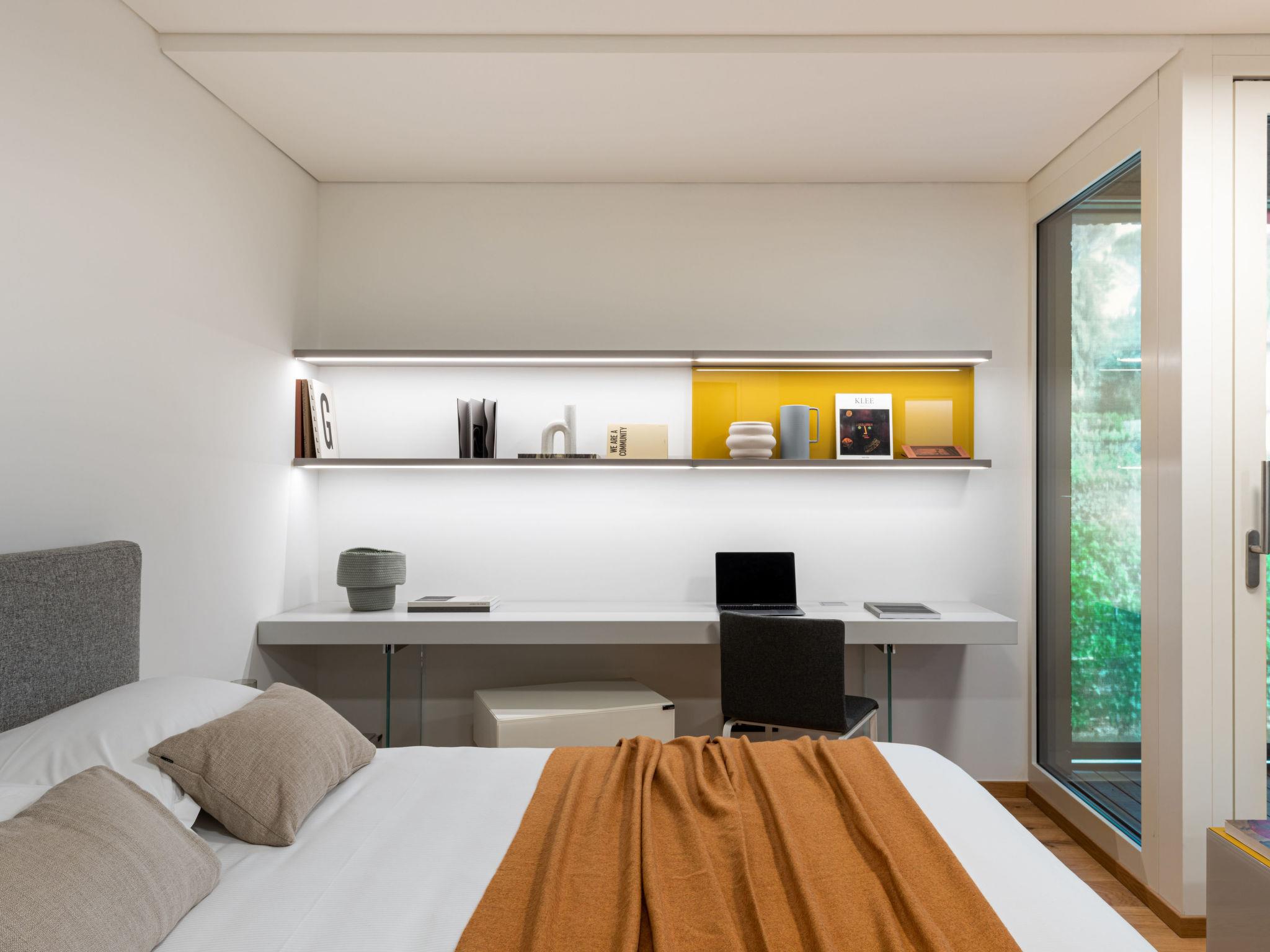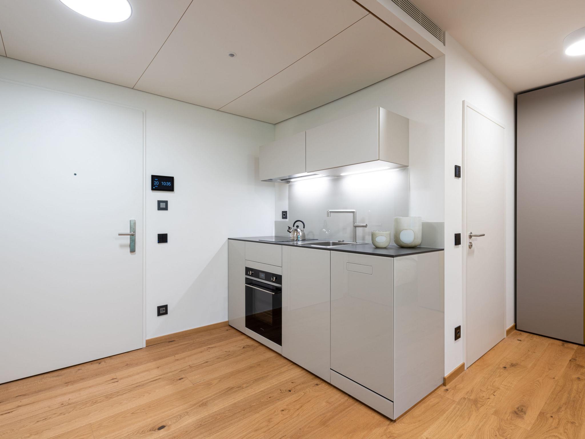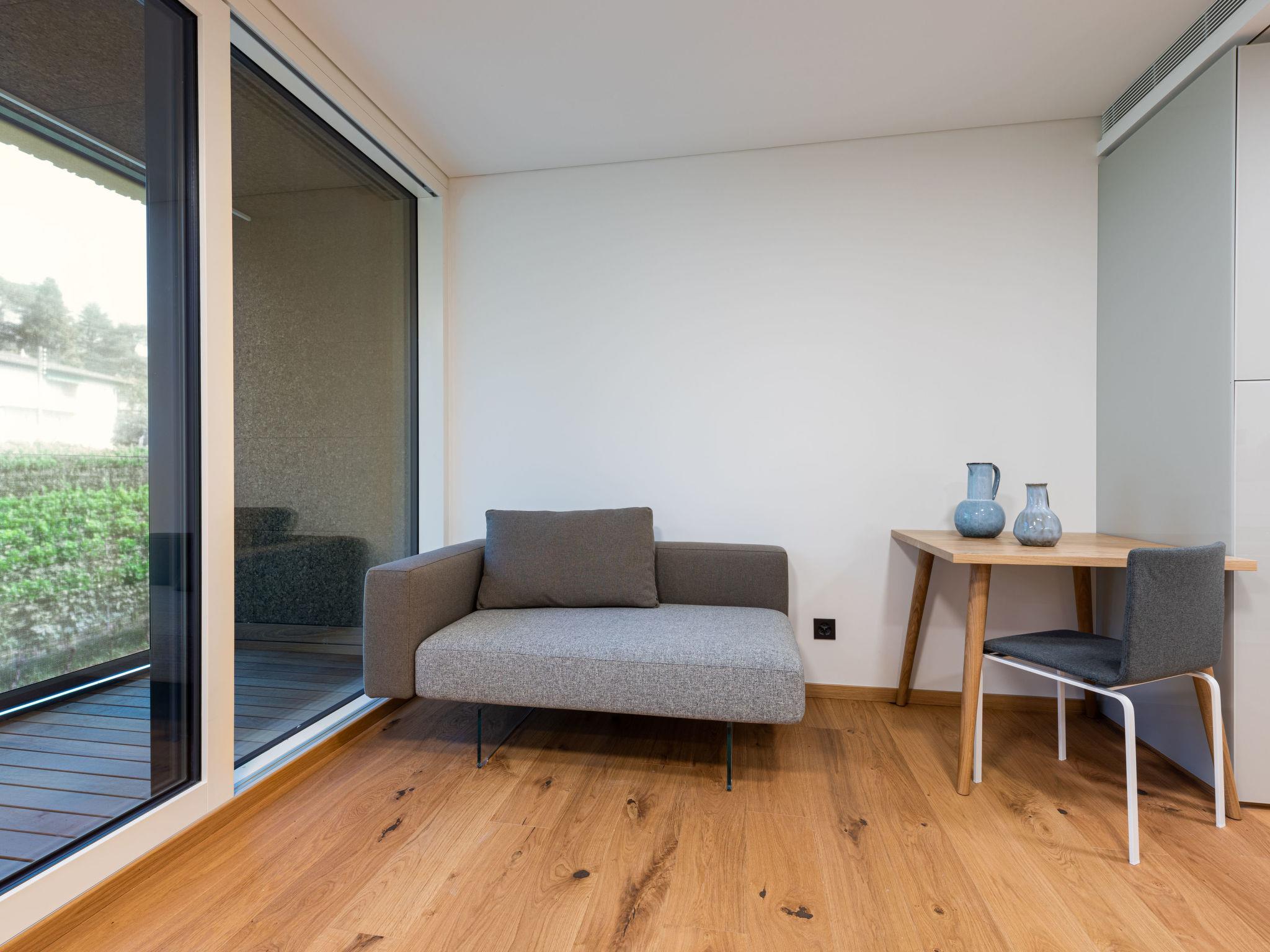Stabio 20 km von Lugano Centro: Modernes, freistehendes, komfortables Apart-Hotel "Lo Scudo di Stabio", 350 m.ü.M., auf 2 Stockwerken, Baujahr 2022, umgeben von Wiesen und Weinbergen. 15 Wohnungen in der Residenz. Im Ort, 1 km vom Zentrum von Stabio, an einer Hauptstrasse, Richtung Nordosten. Zur Mitbenutzung: Grundstück 1'000 m2, grosser, schöner Garten Rasen und Pflanzen. Im Hause: Empfang, Aufenthaltsraum mit TV, Wireless LAN, Fahrstuhl, Einstellraum für Fahrräder, Zentralheizung, Klimaanlage. Wäschewechsel täglich (zusätzlich extra). Handtuchwechsel täglich (zusätzlich extra). Wohnungsreinigung täglich möglich (extra). Zufahrt bis zum Haus. Parkplatz auf dem Grundstück. E-Ladestation. Supermarkt 1 km, Bar 550 m, Bushaltestelle 1 m, Bahnstation "Stabio" 1.2 km. Nahe gelegene Sehenswürdigkeiten: Fossilienmuseum Arzo 4.8 km, Chicco d'Oro Kaffee Museum 5 km, Villa Braghenti 8 km, La Vecchia Stazione 8 km, Torre Pezza 9 km, Madonna di San Bernardino 9 km. Bekannte Seen in der Umgebung sind gut erreichbar: Lago di Lugano 5 km. Wandergebiete: Monte San Giorgio 9 km, Monte Generoso, Valle di Muggio. Aussenbereich : Picknickbereich, Gartenmöbel, Garten. Allgemeiner Bereich mit Gemeinschaftslounge/TV Bereich, Snackautomaten, Getränkeautomaten, Kaffe- und Teezubehör. Businessausstattung: Konferenz- und Veranstaltungsräume Lo Scudo di Stabio verbindet flexible Gastfreundschaft mit konsequenter Nachhaltigkeit: 22 möblierte Apartments (35–50 m²), ergänzt durch gemeinschaftliche Bereiche wie einen 130 m² grossen Community-Raum und einen 26 m² Meetingraum. Der Ansatz ist ganzheitlich nachhaltig: überwiegendes Holztragwerk in vorgefertigter Rahmenbauweise, natürliche Dämmstoffe, Gründach sowie hocheffiziente Haustechnik, um Energiebedarf und Emissionen über den gesamten Lebenszyklus zu senken. Die Sichtkork-Fassaden integrieren Photovoltaikmodule an den Süd- und Westseiten und verbinden Energiegewinnung mit architektonischer Identität. Sanfte Mobilität wird durch E-Auto-Ladestationen, eine Fahrrad-Service-Station und einen gesicherten Fahrradraum im Erdgeschoss unterstützt. Das Ensemble ist das erste Gebäude im Tessin mit SNBS-Zertifizierung, verfügt über Minergie-P-ECO (Nr. TI-011-P-ECO) sowie das Label Swisstainable – Level II – Belege für die ökologische, soziale und wirtschaftliche Qualität, zudem wurde es bei den Active House Awards 2022 ausgewählt/gewürdigt, was den Fokus auf Nutzerkomfort (Licht, Luft, Wohlbefinden) neben der Energieeffizienz unterstreicht.