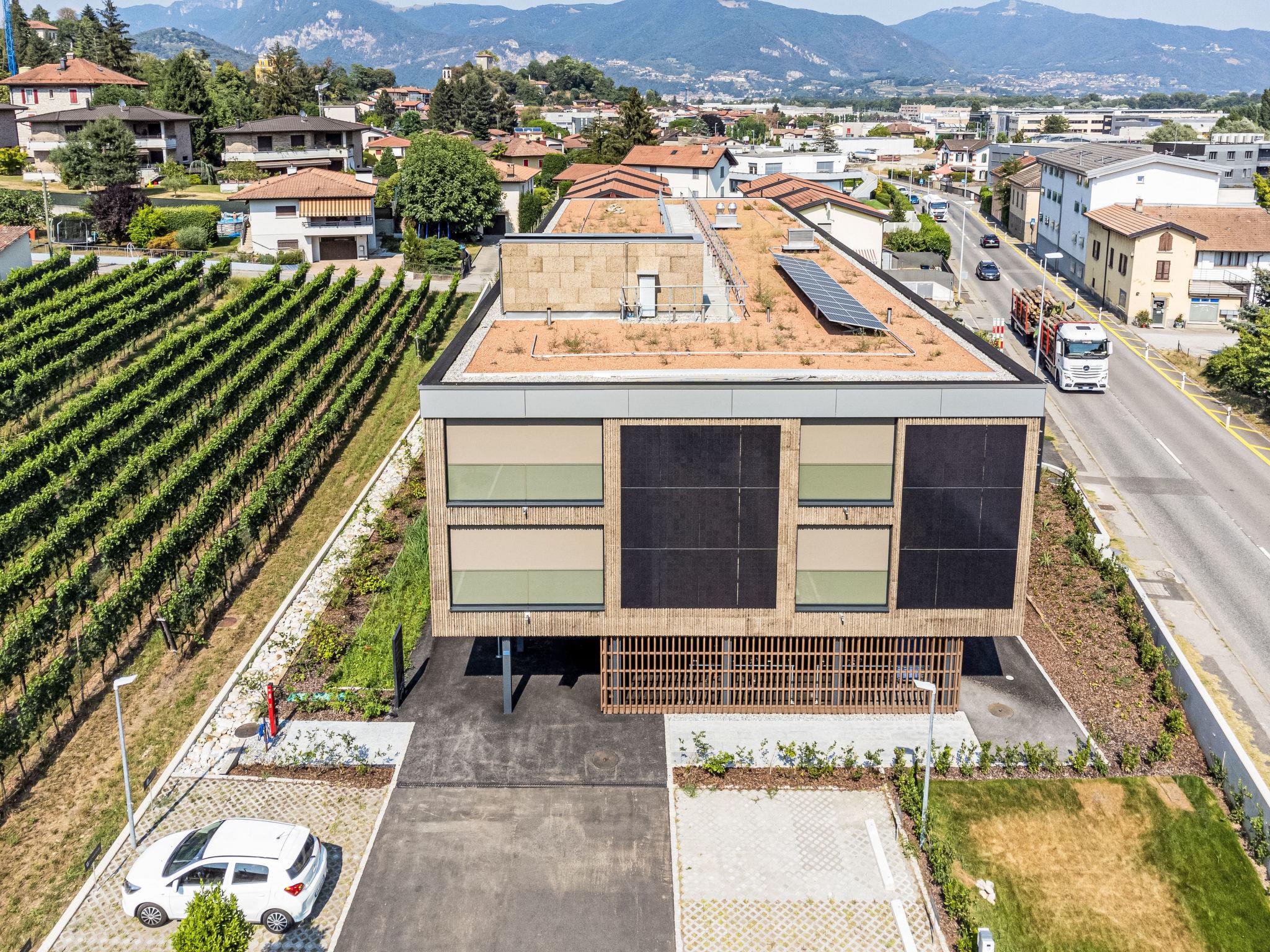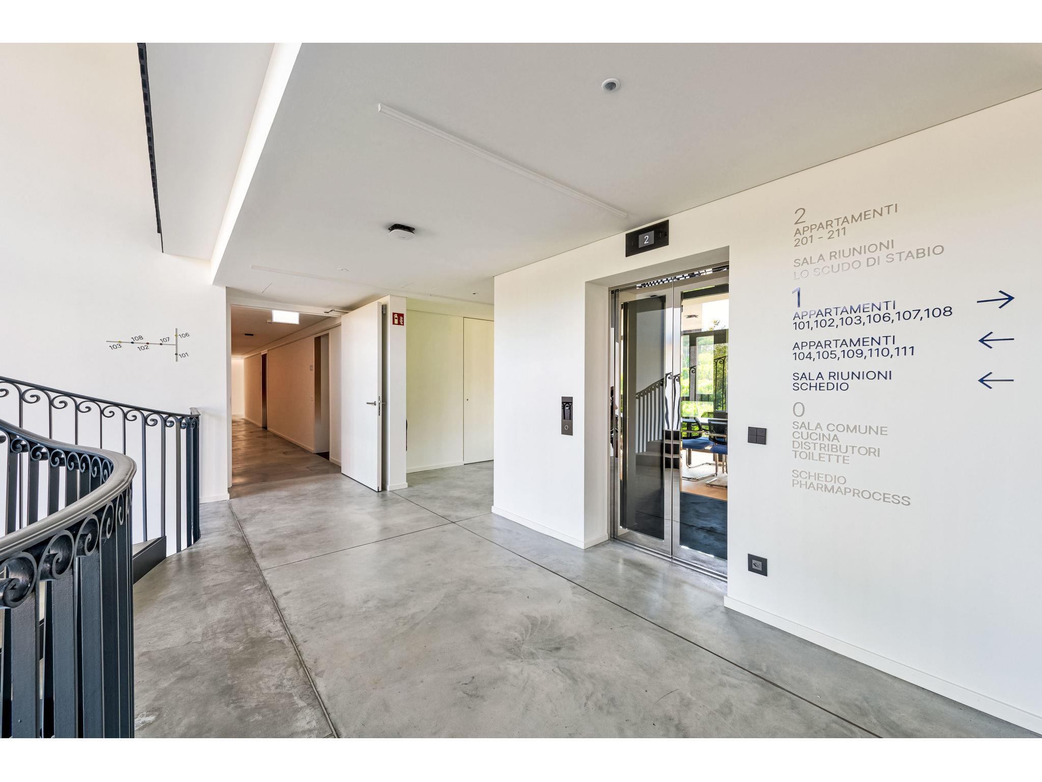 Stabio 20 km von Lugano Centro: Modernes, freistehendes, komfortables Apart-Hotel "Lo Scudo di Stabio", 350 m.ü.M., auf 2 Stockwerken, Baujahr 2022, umgeben von Wiesen und Weinbergen. 15 Wohnungen in der Residenz. Im Ort, 1 km vom Zentrum von Stabio, an einer Hauptstrasse, Richtung Nordosten. Zur Mitbenutzung: Grundstück 1'000 m2, grosser, schöner Garten Rasen und Pflanzen. Im Hause: Empfang, Aufenthaltsraum mit TV, Wireless LAN, Fahrstuhl, Einstellraum für Fahrräder, Zentralheizung, Klimaanlage. Wäschewechsel täglich (zusätzlich extra). Handtuchwechsel täglich (zusätzlich extra). Wohnungsreinigung täglich möglich (extra). Zufahrt bis zum Haus. Parkplatz auf dem Grundstück. E-Ladestation. Supermarkt 1 km, Bar 550 m, Bushaltestelle 1 m, Bahnstation "Stabio" 1.2 km. Nahe gelegene Sehenswürdigkeiten: Fossilienmuseum Arzo 4.8 km, Chicco d'Oro Kaffee Museum 5 km, Villa Braghenti 8 km, La Vecchia Stazione 8 km, Torre Pezza 9 km, Madonna di San Bernardino 9 km. Bekannte Seen in der Umgebung sind gut erreichbar: Lago di Lugano 5 km. Wandergebiete: Monte San Giorgio 9 km, Monte Generoso, Valle di Muggio. Aussenbereich : Picknickbereich, Gartenmöbel, Garten. Allgemeiner Bereich mit Gemeinschaftslounge/TV Bereich, Snackautomaten, Getränkeautomaten, Kaffe- und Teezubehör. Businessausstattung: Konferenz- und Veranstaltungsräume Lo Scudo di Stabio verbindet flexible Gastfreundschaft mit konsequenter Nachhaltigkeit: 22 möblierte Apartments (35–50 m²), ergänzt durch gemeinschaftliche Bereiche wie einen 130 m² grossen Community-Raum und einen 26 m² Meetingraum. Der Ansatz ist ganzheitlich nachhaltig: überwiegendes Holztragwerk in vorgefertigter Rahmenbauweise, natürliche Dämmstoffe, Gründach sowie hocheffiziente Haustechnik, um Energiebedarf und Emissionen über den gesamten Lebenszyklus zu senken. Die Sichtkork-Fassaden integrieren Photovoltaikmodule an den Süd- und Westseiten und verbinden Energiegewinnung mit architektonischer Identität. Sanfte Mobilität wird durch E-Auto-Ladestationen, eine Fahrrad-Service-Station und einen gesicherten Fahrradraum im Erdgeschoss unterstützt. Das Ensemble ist das erste Gebäude im Tessin mit SNBS-Zertifizierung, verfügt über Minergie-P-ECO (Nr. TI-011-P-ECO) sowie das Label Swisstainable – Level II – Belege für die ökologische, soziale und wirtschaftliche Qualität, zudem wurde es bei den Active House Awards 2022 ausgewählt/gewürdigt, was den Fokus auf Nutzerkomfort (Licht, Luft, Wohlbefinden) neben der Energieeffizienz unterstreicht.