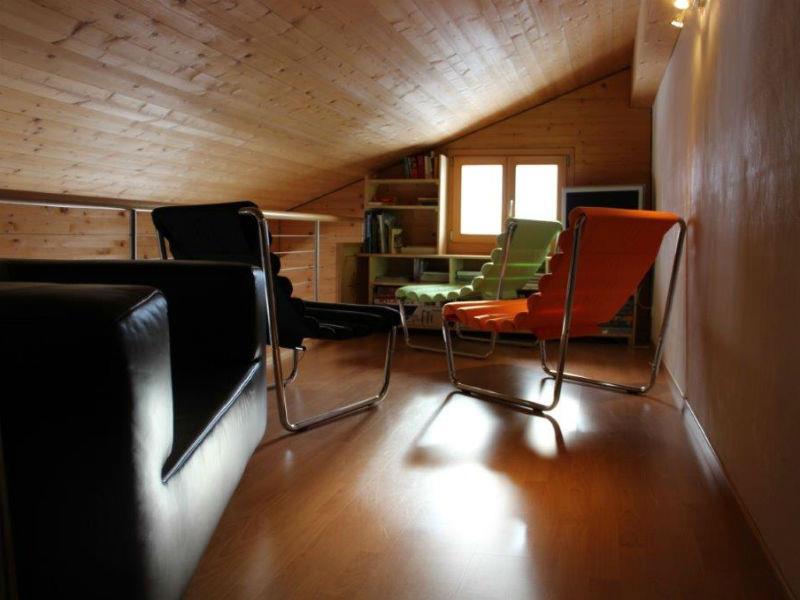 Eine offene Gallerie mit Sitzmöglichkeiten lädt zum lesen und erholen ein. Ein grosses Fenster bietet eine unverbaute Sicht ins Safiental. Badezimmer: