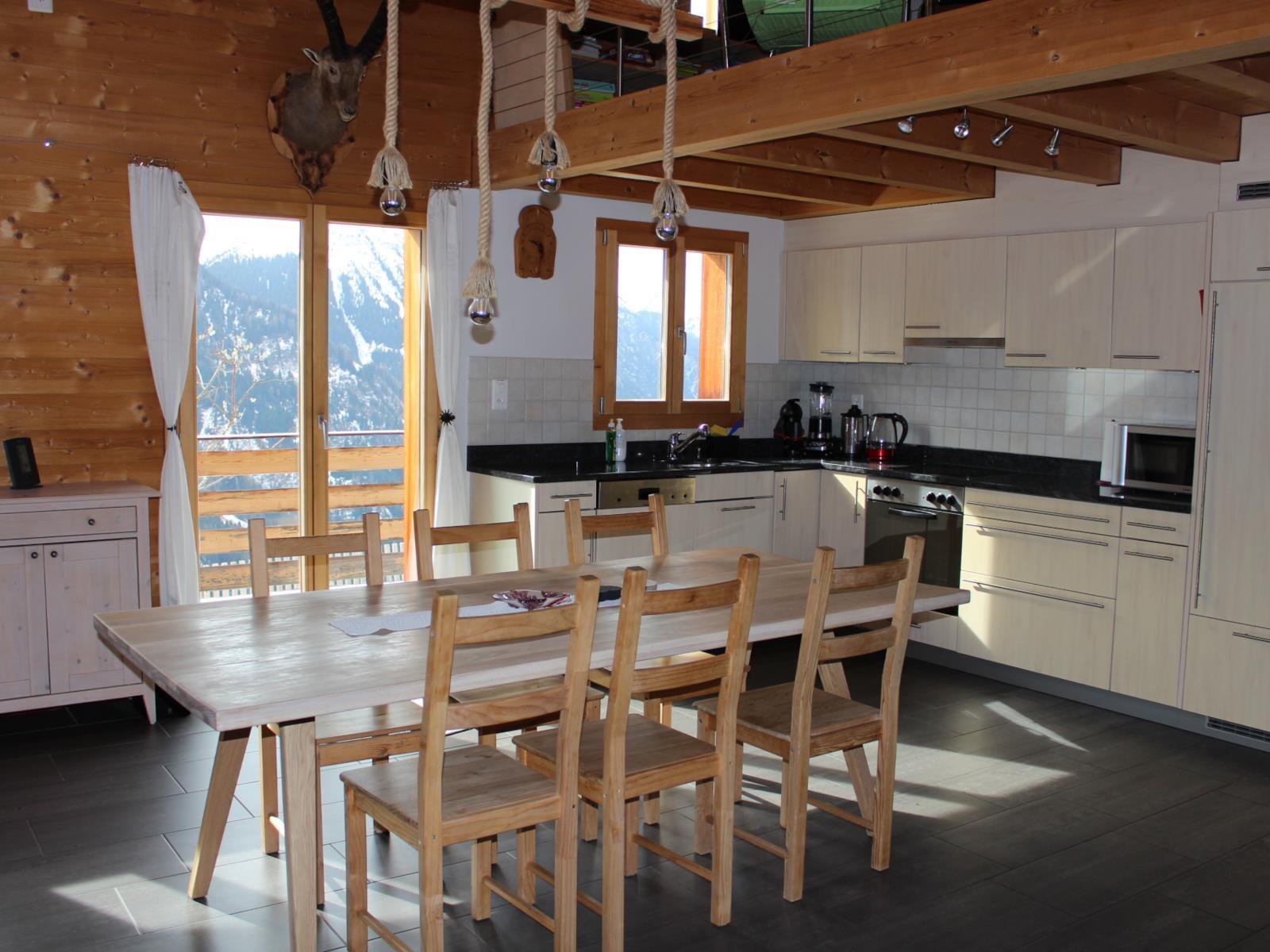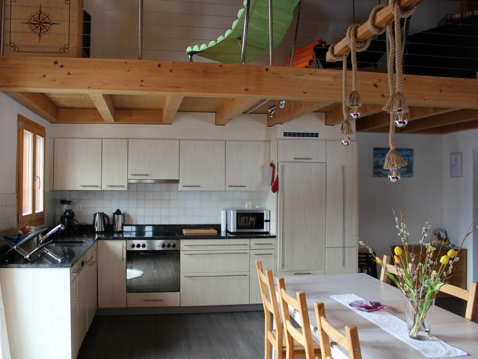 Die Küche ist komplett ausgestattet und verfügt über einen Kochherd, Backofen, grosser Kühlschrank mit Gefrierfach, Geschirrspühlmaschine, Kaffemaschine sowie einem Fondue Caquelon und einem Raclette-Set. Gallerie: