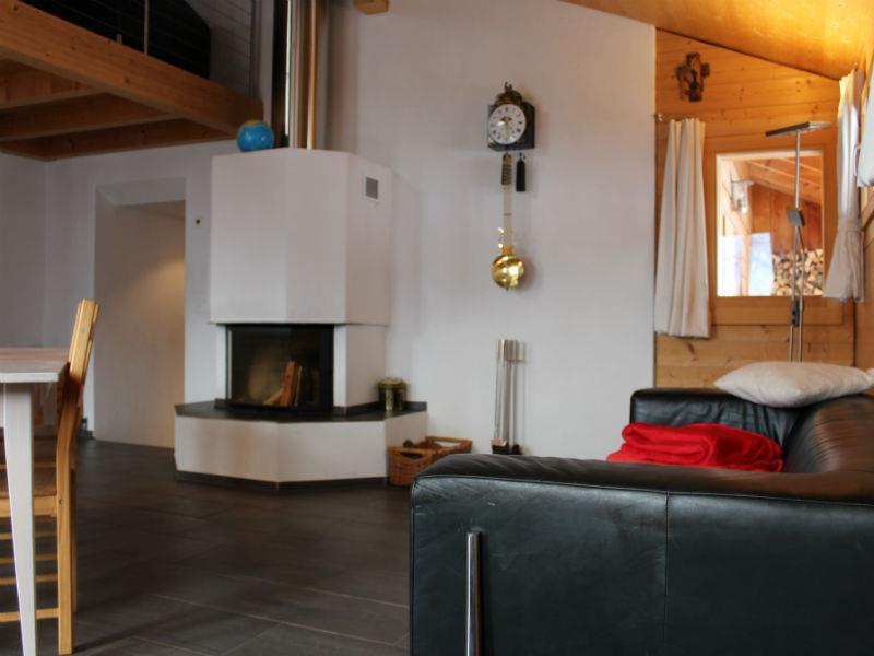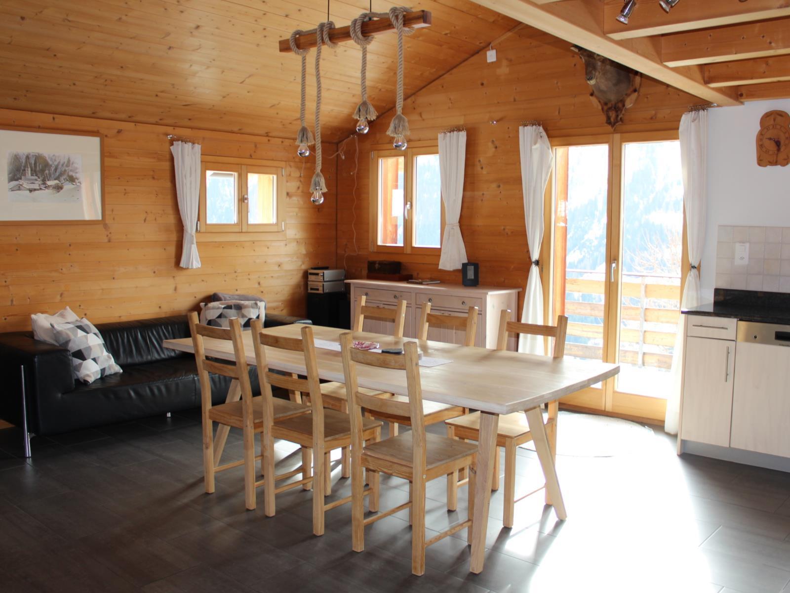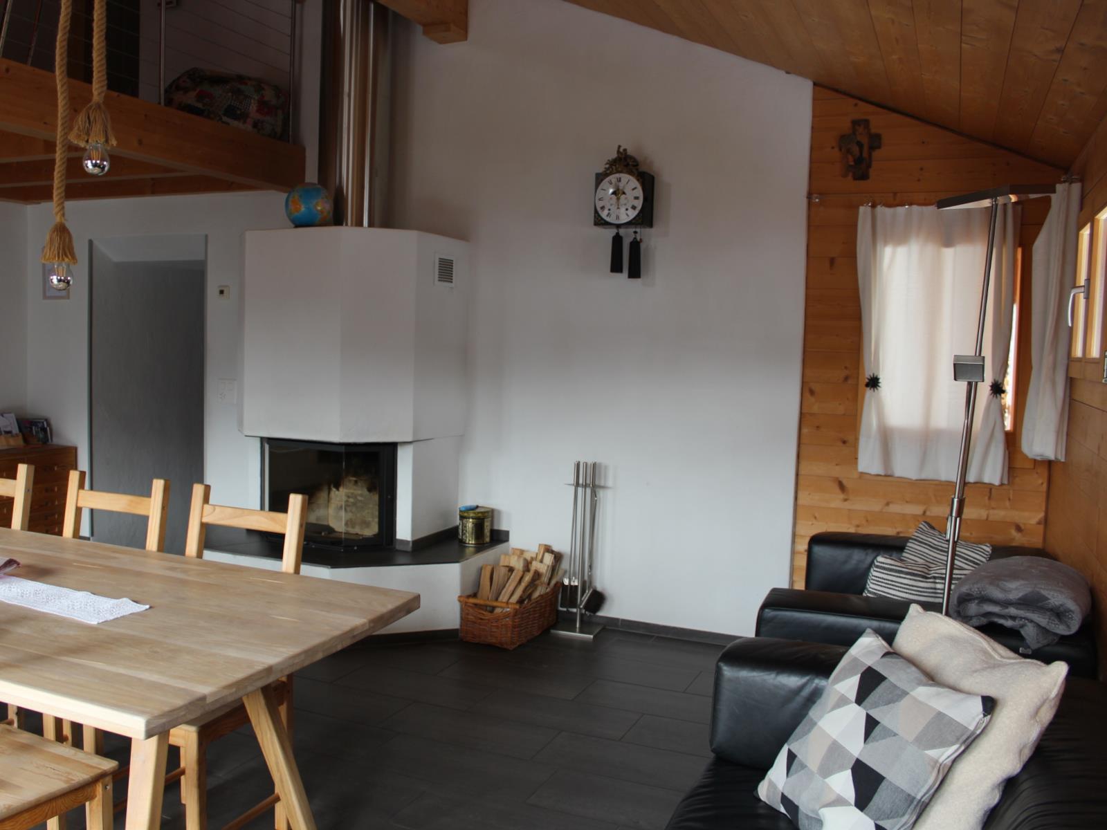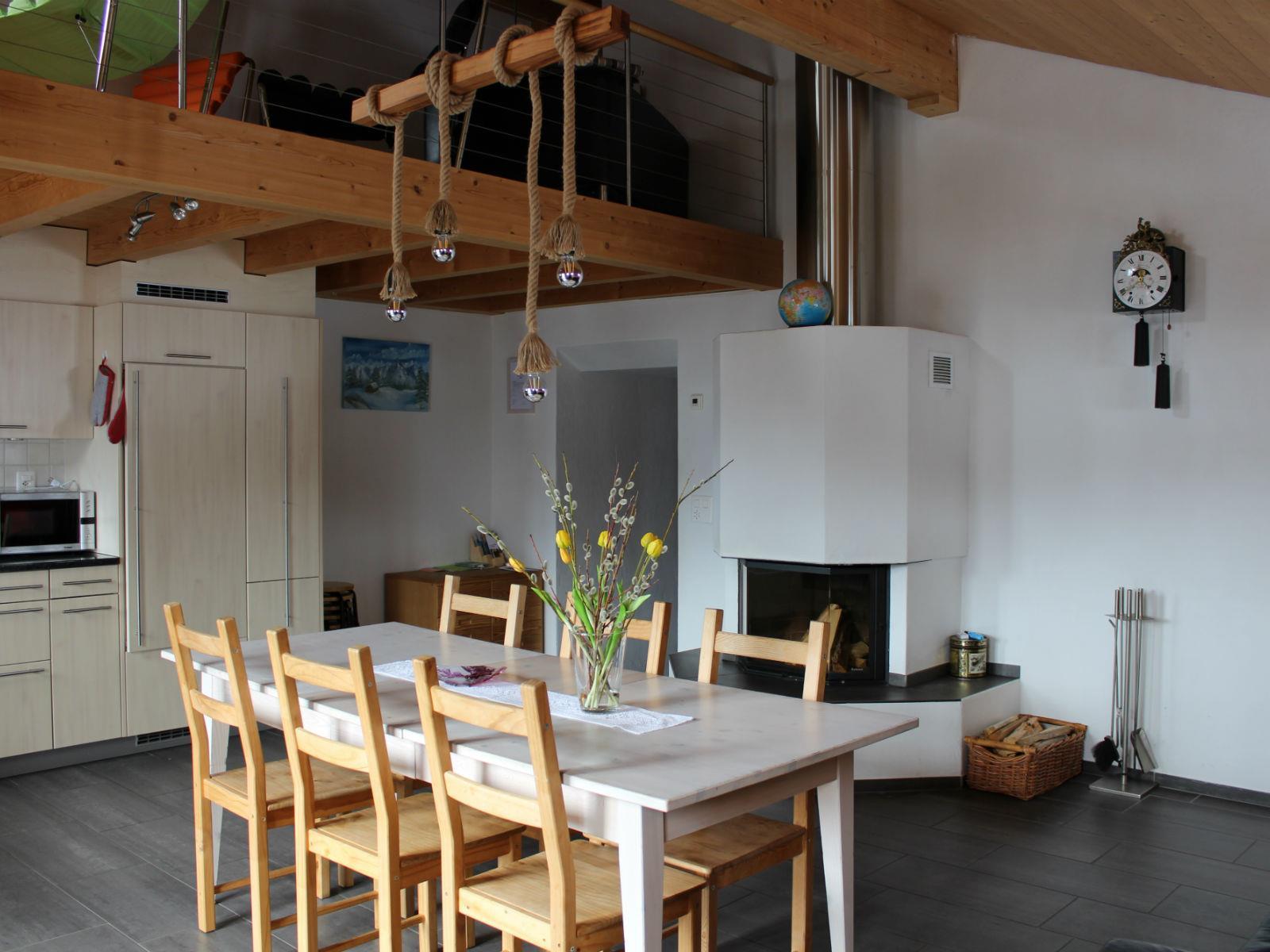 Ein offener Wohnraum mit Küchen-/Essbereich. Im Wohnzimmer befindet sich ein offener Kamin (Holz wird kostenlos zur Verfügung gestellt), Esstisch mit 6 Stühlen, eine Couch, Flatscreen-TV sowie ein grosser Balkon mit herrlicher Aussicht ins Safiental. WLAN ist in der ganzen Wohnung kostenlos. Küche: