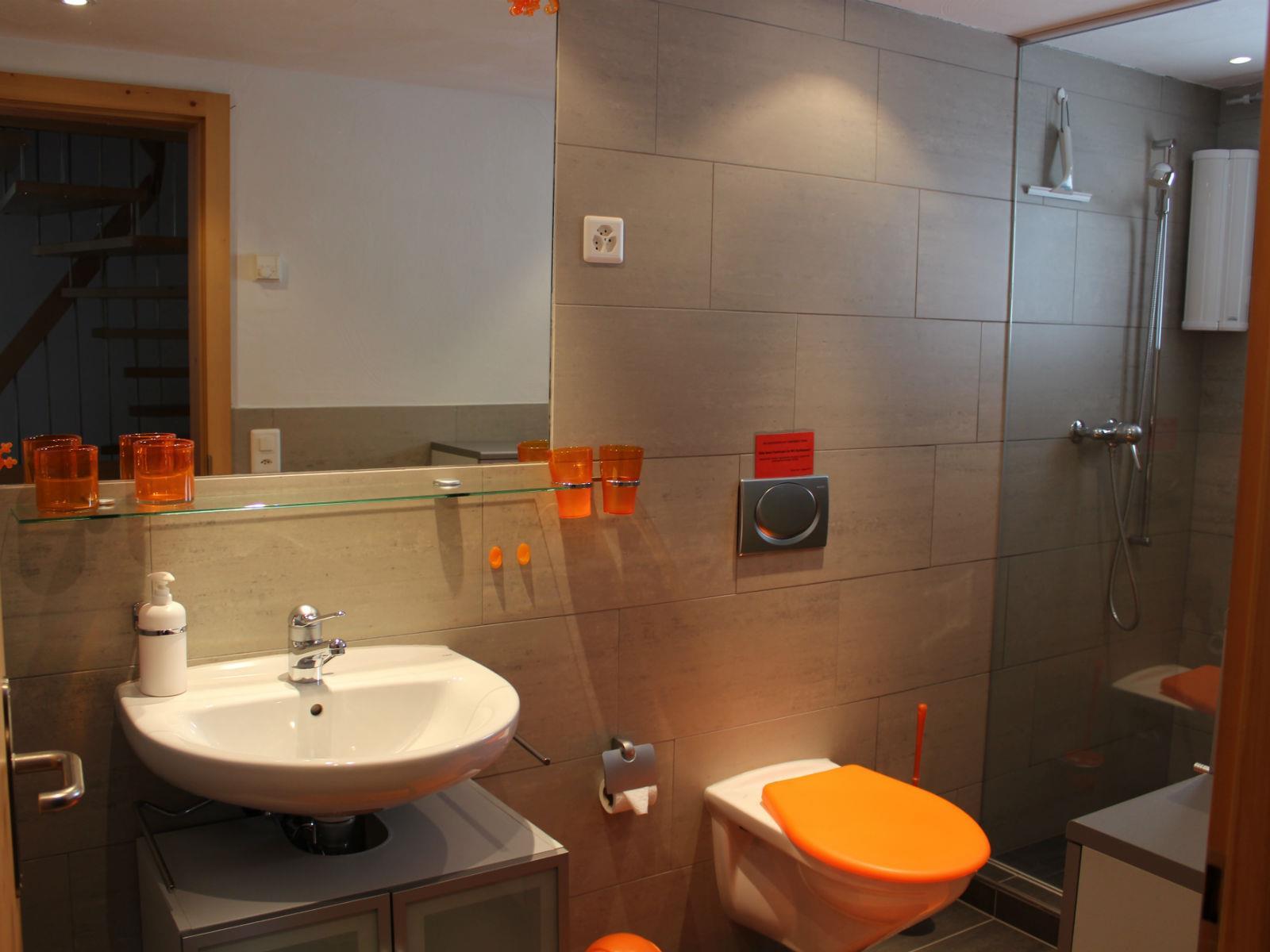 Ein Badezimme rmit Dusche und WC/Lavabo. Inneneinrichtung: