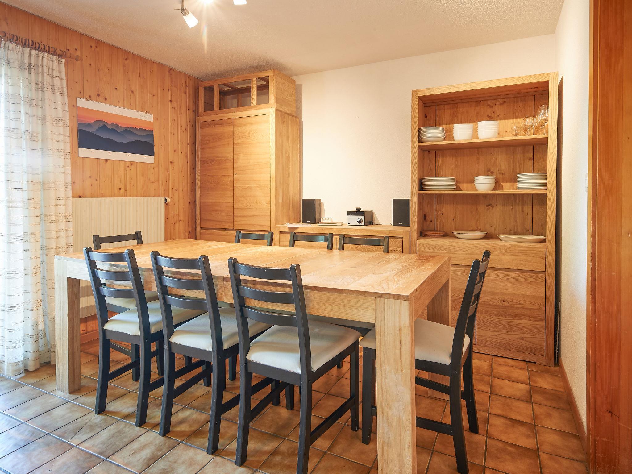 "Lilas", 5-Zimmer-Reihenhaus 100 m2 auf 2 Stockwerken. Komfortabel und geschmackvoll eingerichtet: Wohn-/Esszimmer mit Schwedenofen, Sat-TV, Internationale TV-Sender und DVD. Ausgang zur Terrasse. 1 kleines Zimmer mit 2 Betten. Ausgang zur Terrasse. Offene Küche (Backofen, Geschirrspüler, 4 Glaskeramikplatten, Mikrowelle, elektrische Kaffeemaschine, Fondue Set (Käse)). Dusche/WC. Ölheizung. Obergeschoss: 1 Zimmer mit 2 Betten. Ausgang zum Balkon. 1 Zimmer mit 1 Bett und 1 x 2 Etagenbetten. 1 Zimmer mit 2 Betten. Bad/WC. Ölheizung. Balkon, Terrasse. Terrassenmöbel. Panoramasicht. Zur Verfügung: Internet (Wireless LAN). Bitte beachten: Nichtraucher-Unterkunft. Das Chalet befindet sich auf der Trabanta Piste. Ein Schlitten wird für das Gespäck zur Verfügung gestellt.