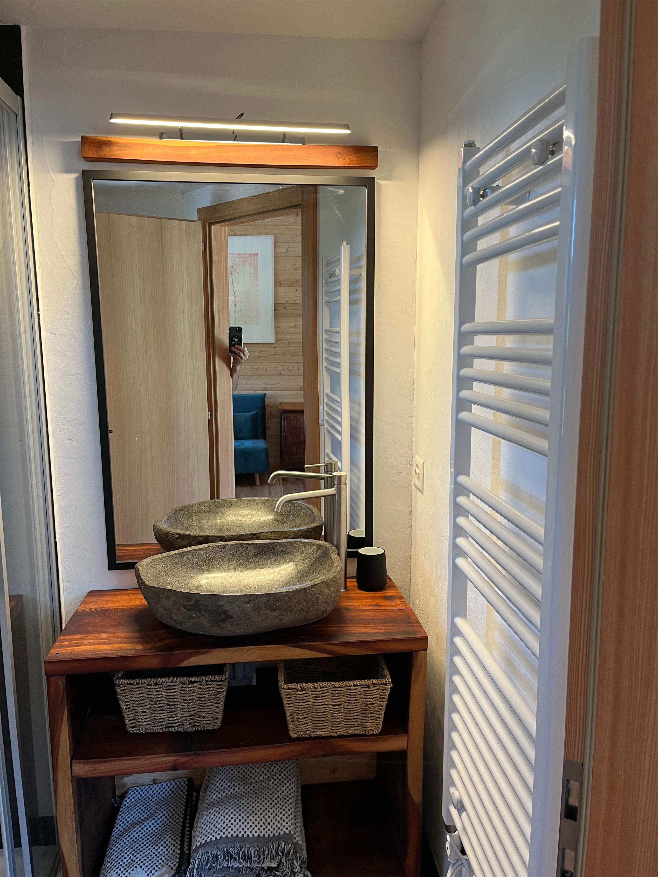La rénovation récente a privilégié les matériaux naturels pour respecter l'Geist dieses alten Gebäudes. Wir haben so viel wie möglich der bereits vor Ort vorhandenen Materialien wiederverwendet. Ein großes Schlafzimmer für zwei Personen kann durch eine feste Wand, die von uns vor Ihrer Ankunft auf Ihren Wunsch hin installiert wird, in zwei kleinere Zimmer getrennt werden. Das Badezimmer ist mit'une douche à effet pluie, vous permet de vous relaxer et de vous revigorer dans une ambiance sereine. Un système solaire thermique vous assure une eau chaude sanitaire et un chauffage écologique. Les chambres et la salle de bain est chauffée au solaire thermique. Le salon-cuisine est chauffé par un poêle à bois à accumulation.