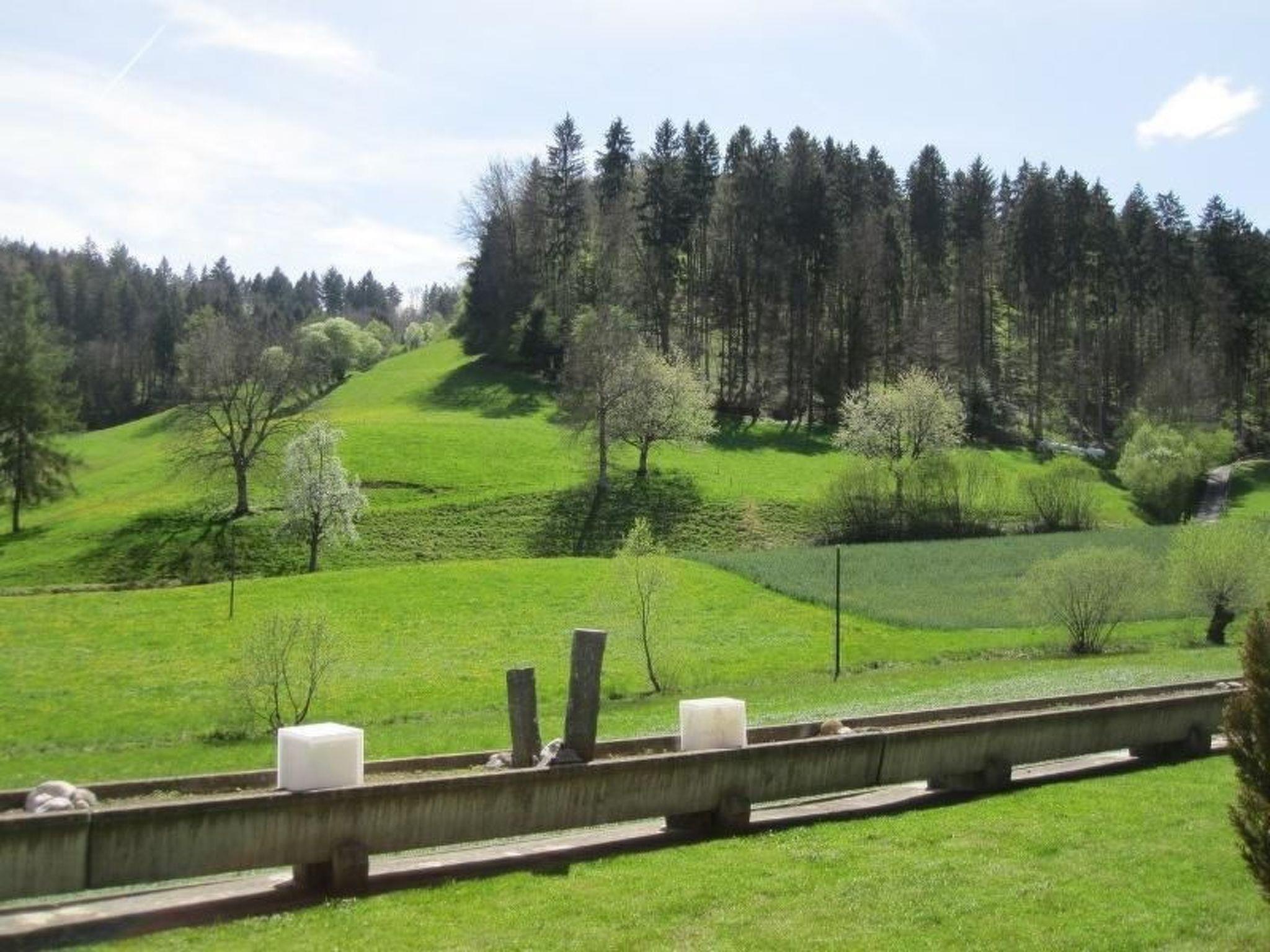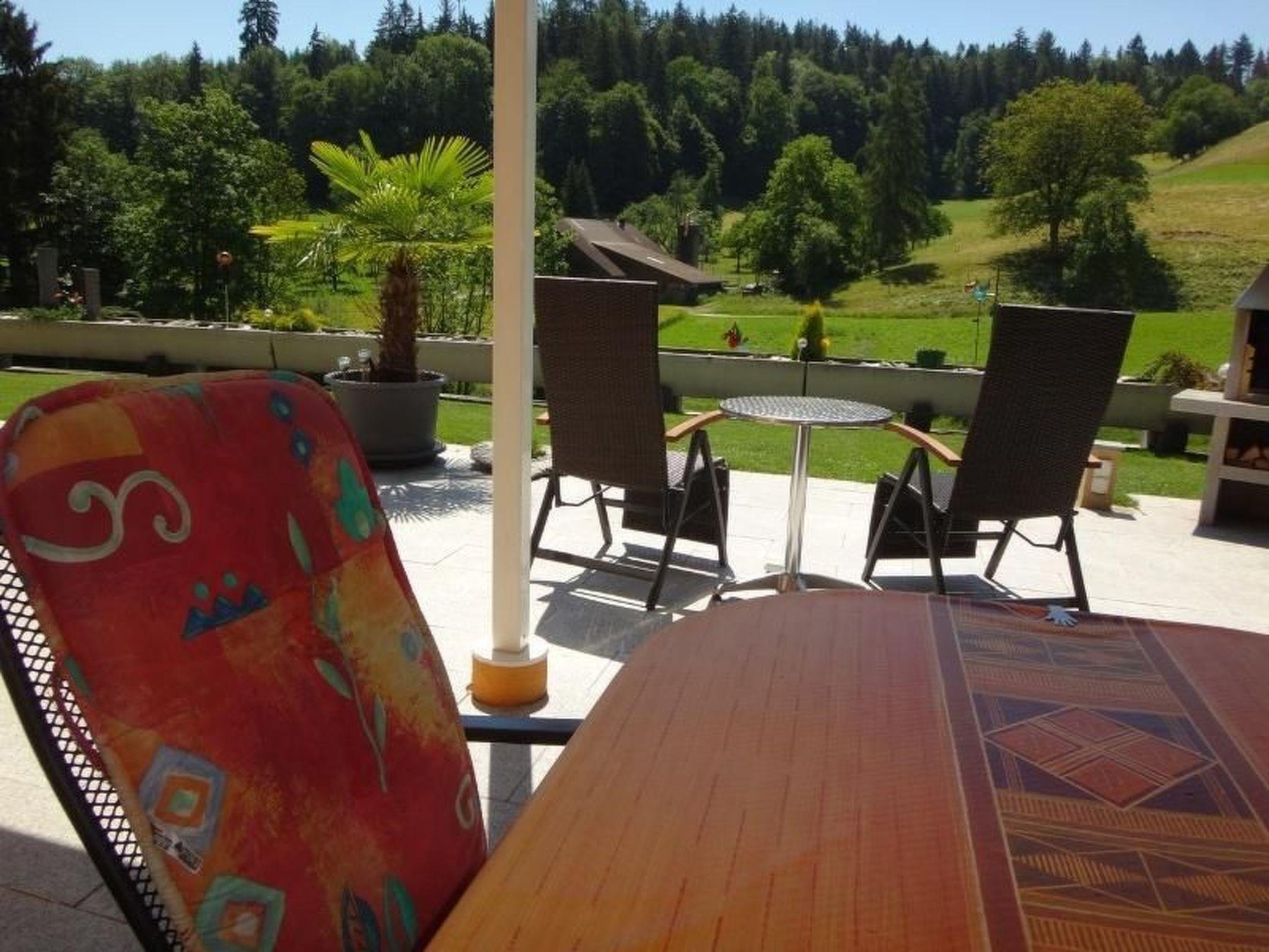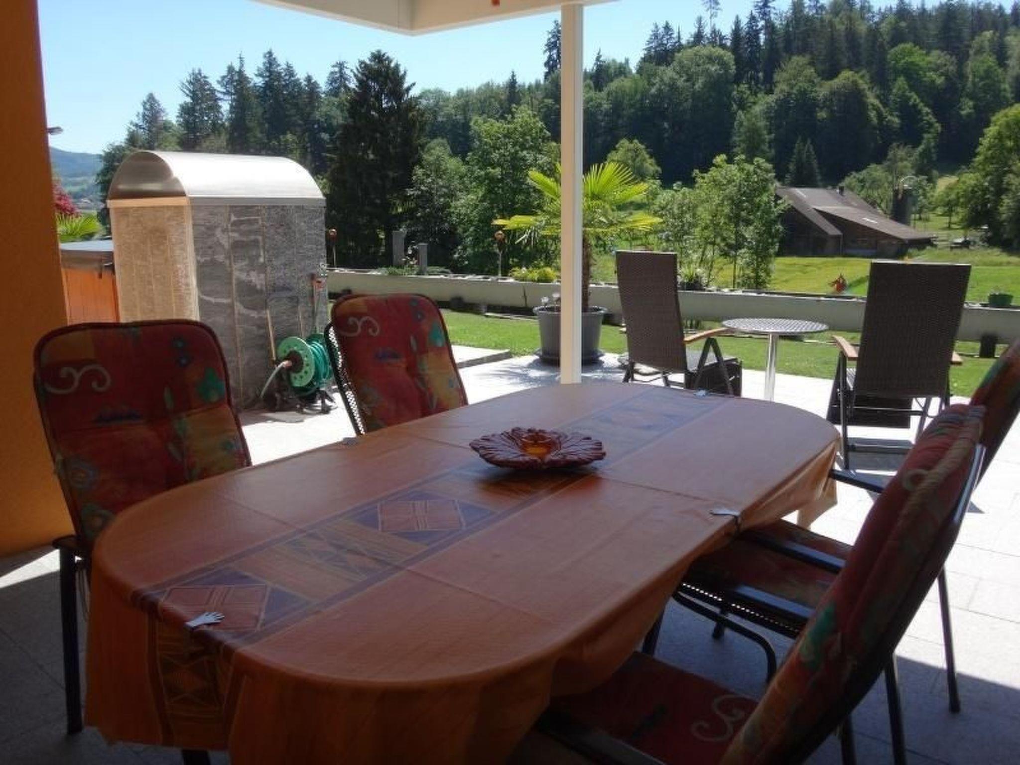 Moderne Ferienwohnung mit aussen Whirlpool (ganz jährig benutzbar - geheizt, von 8.00 bis 22.00 Uhr) und Erlebnis-Dusche (April - Oktober benutzbar) mit Sonnen-Terrasse gedeckter Sitplatz und herrlicher Aussicht auf Wald und Wiesen vom Schlafzimmer, Wohnzimmer, Sitzplatz oder vom Whirlpool aus. Eine richtige Wohlfühloase.