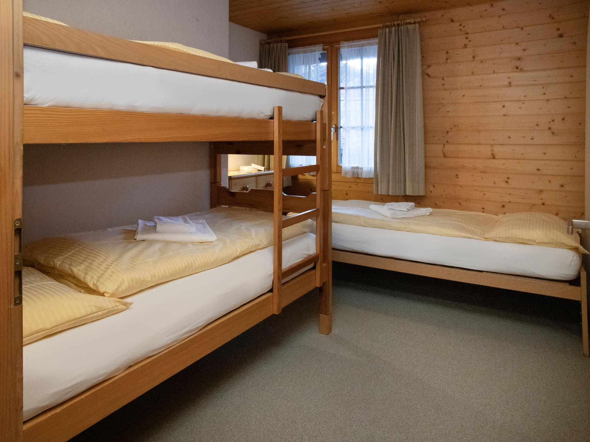 "Chäs Gruebi Apt.S", 4-Zimmer-Wohnung 108 m2 im 2. Stock. Komfortabel und gemütlich eingerichtet: Wohn-/Esszimmer mit 1 Diwanbett (80 cm, Länge 180 cm), 1 Doppeldiwanbett (140 cm, Länge 180 cm), offenem Kamin, Kabel-TV, Radio und DVD. 2 Zimmer, jedes Zimmer mit 1 Doppelbett (2 x 80 cm, Länge 200 cm), Dusche/WC. 1 Zimmer mit 1 Bett (90 cm, Länge 190 cm), 1 x 2 Etagenbetten (90 cm, Länge 190 cm). Kleine Küche (4 Kochplatten, Backofen, Geschirrspüler, Toaster, Wasserkocher, elektrische Kaffeemaschine, Kapseln für die Kaffeemaschine (Nespresso) extra, Fondue Set (Käse)). Bad/WC. Heizung. Balkon. Schöne Sicht auf die Berge. Zur Verfügung: Bügeleisen, Haartrockner, Holz (extra). Internet (Wireless LAN, gratis). Bitte beachten: Nichtraucher-Unterkunft.