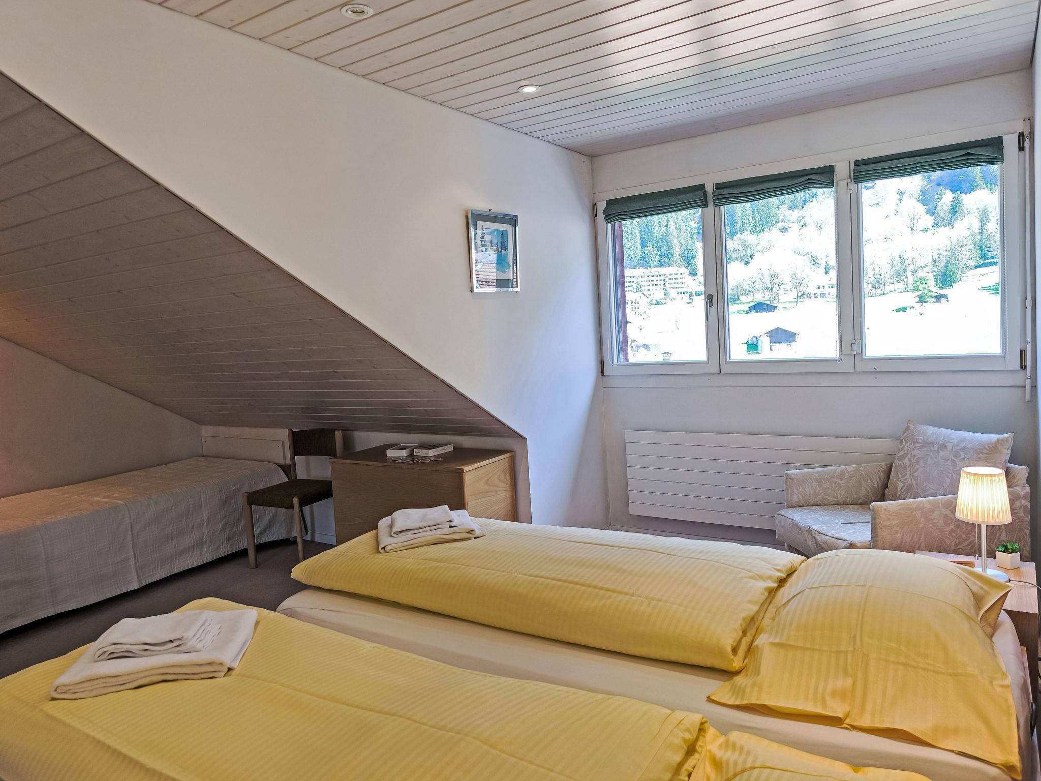"Eiger Residence Top Floor Apt P", 3-Zimmer-Wohnung 95 m2, im Dachgeschoss. Geräumig und hell, teilweise abgeschrägt, komfortabel und modern eingerichtet: offenes Wohn-/Esszimmer mit Panoramafenster mit Kabel-TV. 1 Zimmer mit 3 Betten (90 cm, Länge 200 cm). 1 Zimmer mit 2 Betten (90 cm, Länge 200 cm). Grosse, offene Küche (Backofen, Geschirrspüler, 4 Glaskeramikplatten, Wasserkocher, Mikrowelle, Tiefkühler, elektrische Kaffeemaschine, Kapseln für die Kaffeemaschine (Nespresso) extra, Racletteofen, Fondue Set (Chinoise)). Bad/WC, Dusche/WC. Herrliche Panoramasicht auf die Berge, das Tal und Jungfrau. Zur Verfügung: Waschmaschine, Wäschetrockner, Bügeleisen, Haartrockner. Internet (WLAN, gratis). Bitte beachten: geeignet für Familien. Nichtraucher-Unterkunft.