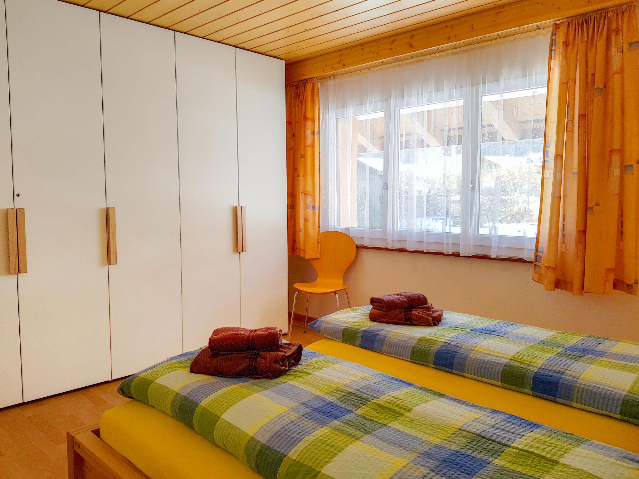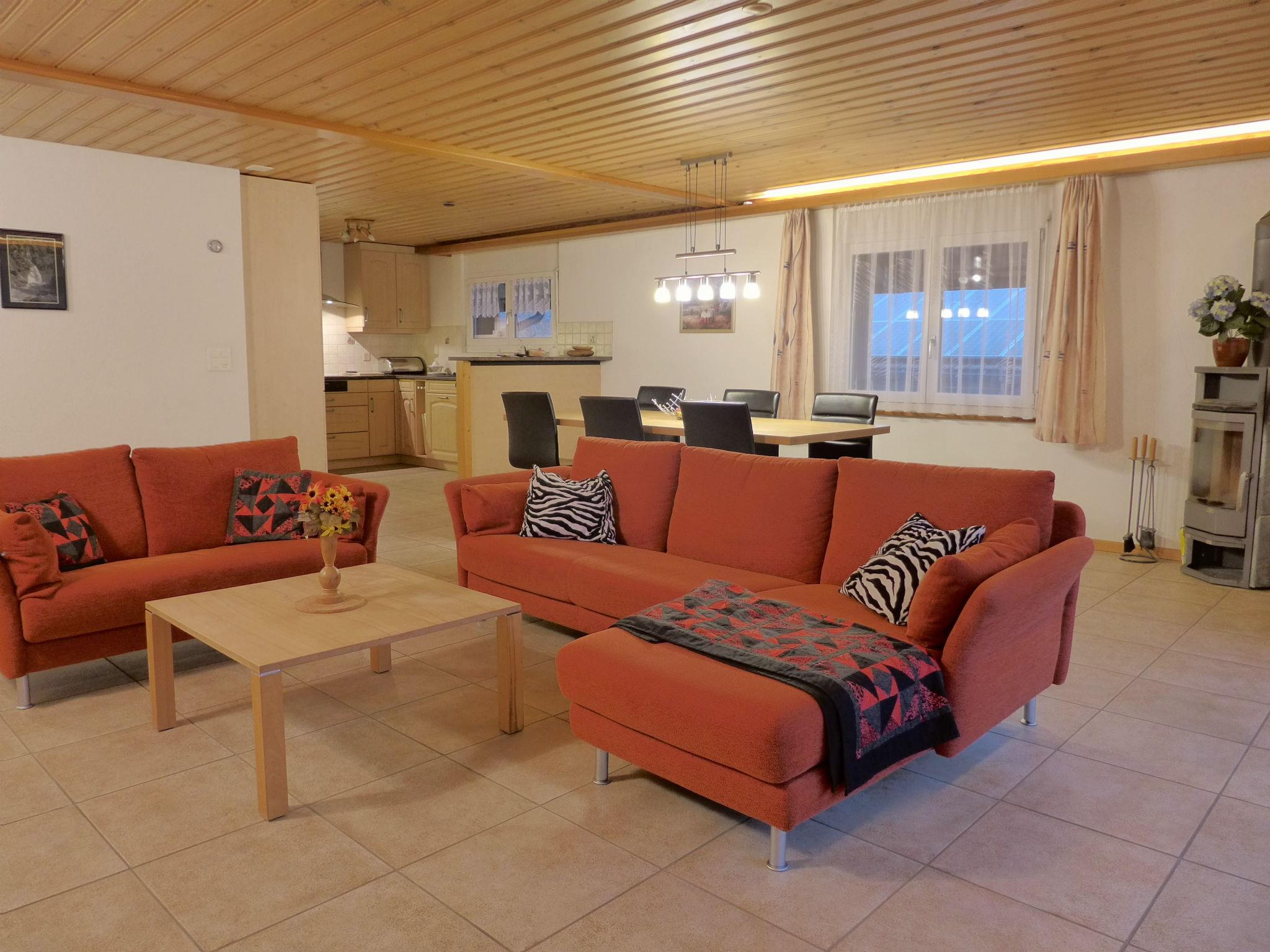4-Zimmer-Wohnung 120 m2 im 1. Stock. Geräumig und hell, sehr komfortabel und gemütlich eingerichtet: offenes grosses Wohn-/Esszimmer 36 m2 mit Panoramafenster mit Schwedenofen, Kabel-TV, Flachbildschirm und DVD. Ausgang zum Balkon. 1 Zimmer 15 m2 mit 1 Doppelbett (2 x 90 cm, Länge 200 cm). 2 Zimmer, jedes Zimmer mit 2 Betten (90 cm, Länge 200 cm). Ausgang zum Balkon. Grosse, offene Küche (Backofen, Geschirrspüler, 4 Glaskeramikplatten, Mikrowelle, Tiefkühler, elektrische Kaffeemaschine, Dampfgarer) mit kleiner Bar. Dusche/WC, sep. WC. Fussbodenheizung. Grosser Balkon, Südlage. Balkonmöbel, Liegestühle. Herrliche Sicht auf die Berge und die Ortschaft. Zur Verfügung: Waschmaschine, Wäschetrockner, Bügeleisen, Kinderhochstuhl, Babybett bis 2 Jahre (extra), Haartrockner, Holz (extra). Internet (WLAN, gratis). Parkplatz (überdacht) beim Haus, Höhe 210 cm. Bitte beachten: geeignet für Familien. Nichtraucher-Unterkunft. Rauchmelder, Feuerlöscher.