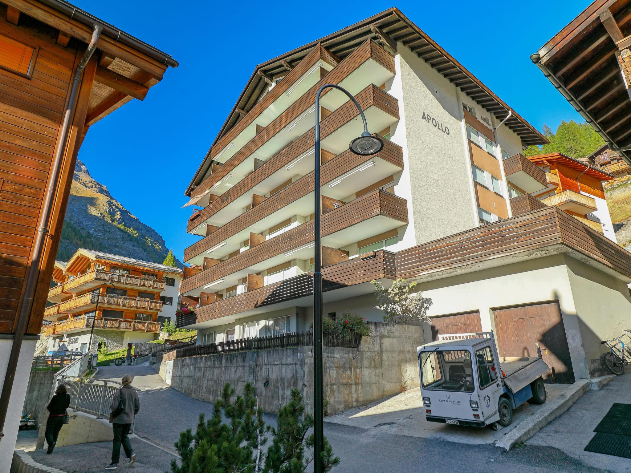 Grosses Mehrfamilienhaus "Apollo", auf 7 Stockwerken. Im Ortsteil Wiesti, 700 m vom Zentrum, ruhige Lage. Im Hause: Fahrstuhl, Skiraum, Zentralheizung. Supermarkt, Restaurant 150 m, Bäckerei 600 m, Fahrradverleih 650 m, Zentrum zu Fuss in 10 Minuten erreichbar, Bushaltestelle "Wiestibrücke" 350 m, Bahnstation "Bahnhof Zermatt" 700 m. Bergeisenbahn 550 m, Skiverleih, Skibushaltestelle 350 m, Skischule, Kinderskischule 950 m. Die Schlüsselübergabe findet bei der Agentur Interhome in Zermatt statt.