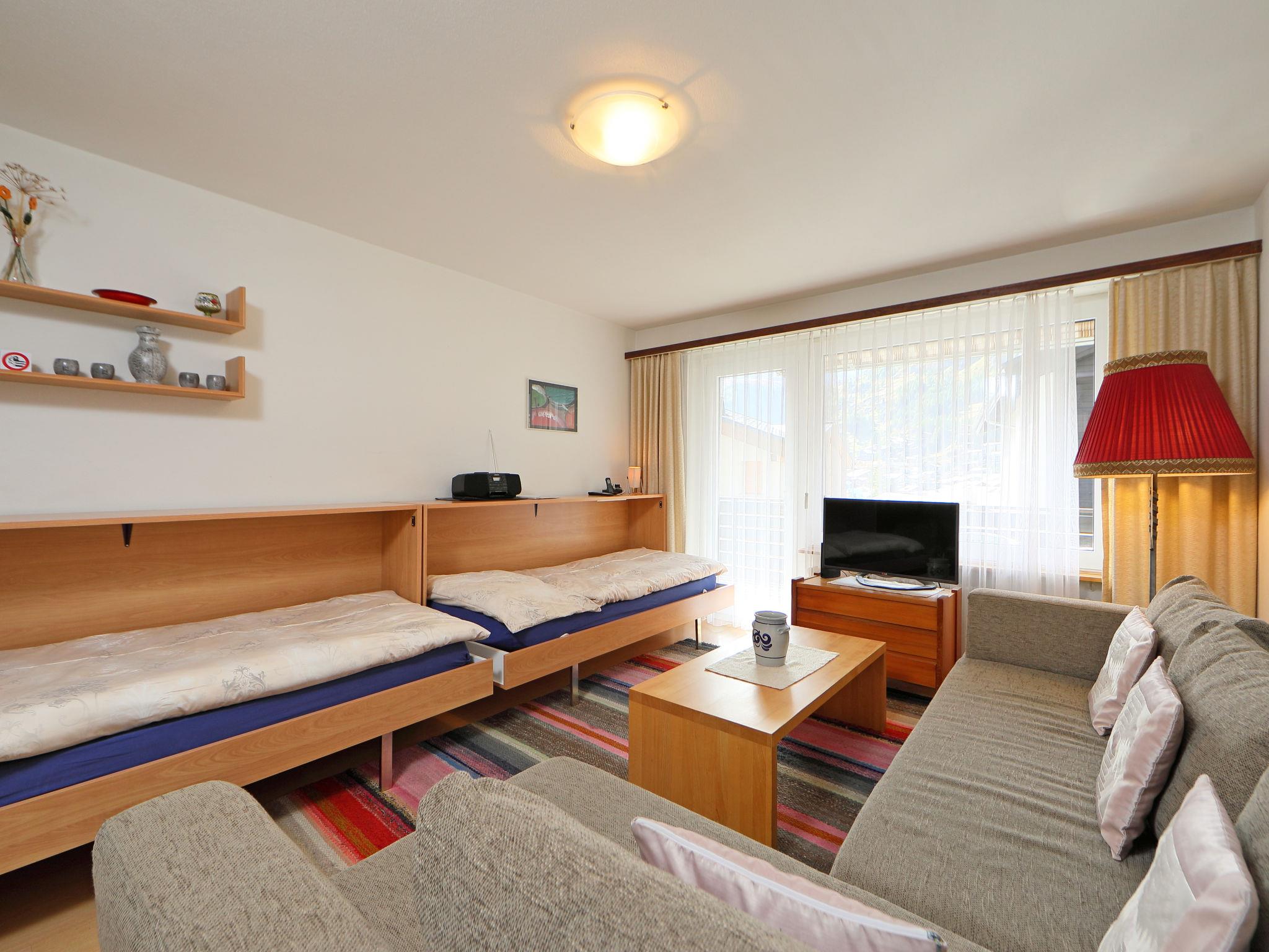 2-Zimmer-Wohnung 56 m2 im 1. Stock, Südlage. Einfach und gemütlich eingerichtet: Wohn-/Schlafzimmer mit 2 Klappbetten (90 cm, Länge 190 cm), TV und Radio. 1 Zimmer mit 1 Doppelbett (2 x 90 cm, Länge 200 cm). Kleine Küche (3 Kochplatten, Backofen, Geschirrspüler, Toaster, Wasserkocher, Tiefkühler, elektrische Kaffeemaschine, Fondue Set (Käse)). Bad/WC. Balkon, Südlage. Balkonmöbel. Schöne Sicht auf das Matterhorn. Zur Verfügung: Haartrockner. Internet (Wireless LAN, gratis). Bitte beachten: Nichtraucher-Unterkunft.
