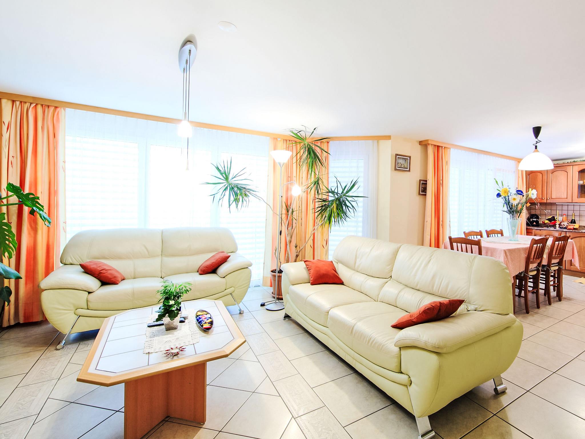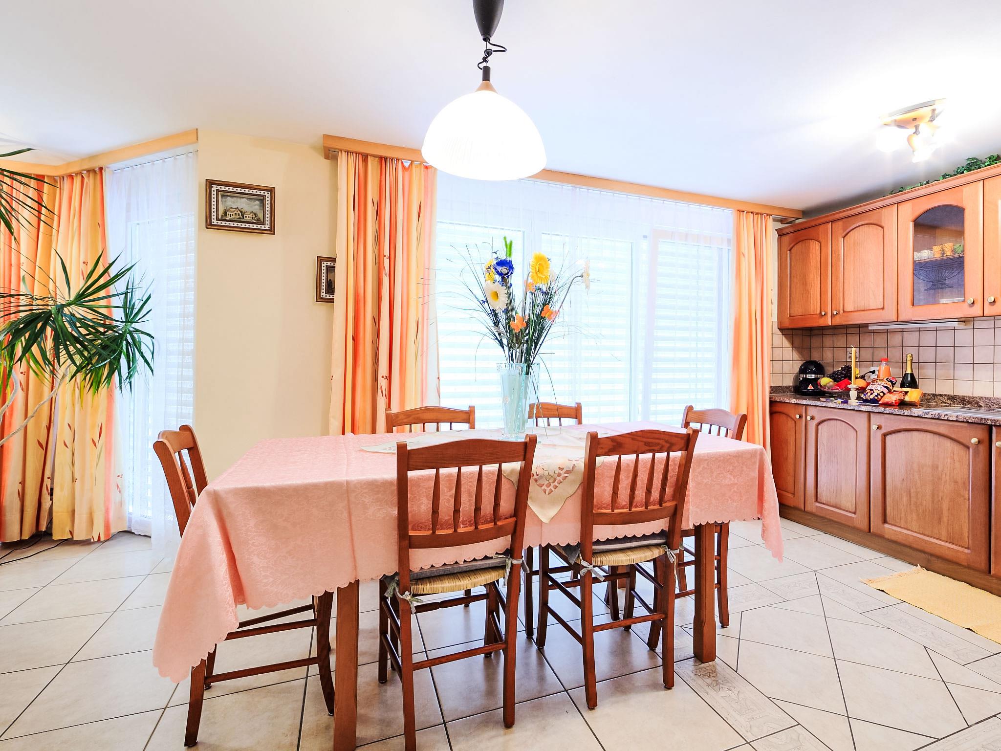 4-Zimmer-Wohnung 120 m2 im 1. Stock, Südlage. Modern und geschmackvoll eingerichtet: Wohn-/Esszimmer mit Kabel-TV und DVD. 2 Zimmer, jedes Zimmer mit 2 Betten. 1 Doppelzimmer mit 1 Doppelbett. Offene Küche (Backofen, Geschirrspüler, 4 Glaskeramikplatten, Mikrowelle, Tiefkühler, elektrische Kaffeemaschine). Bad/WC, Dusche/WC. Balkon 11 m2. Schöne Sicht auf die Berge. Zur Verfügung: Internet (WLAN, gratis). Bitte beachten: Nichtraucher-Unterkunft.