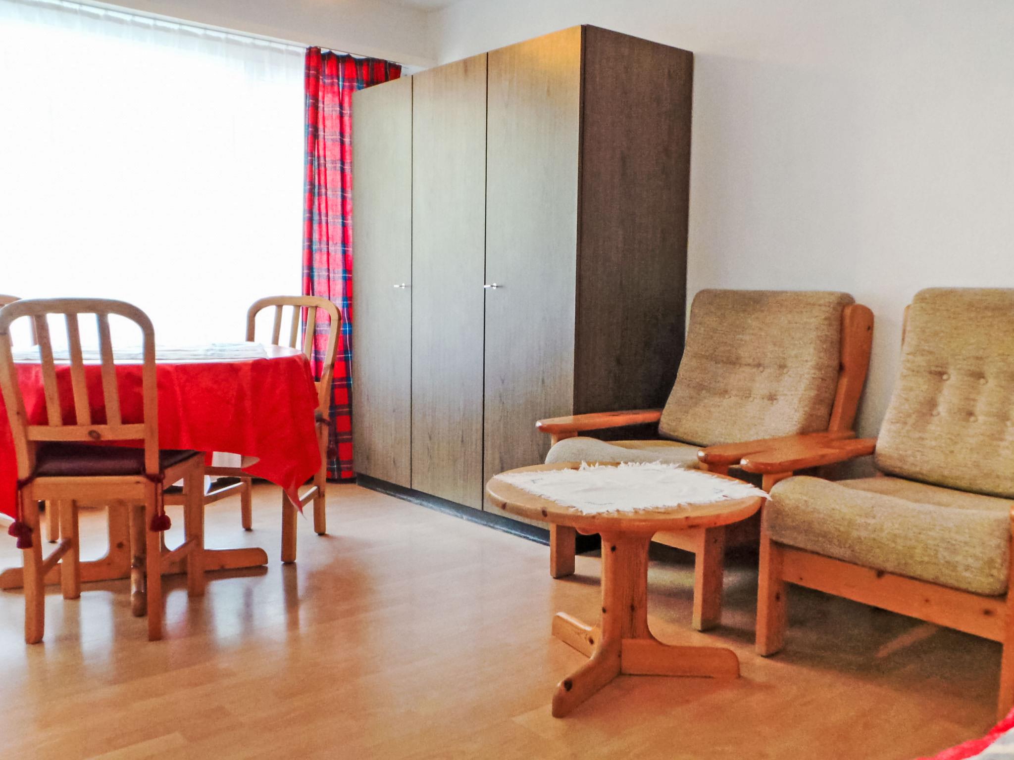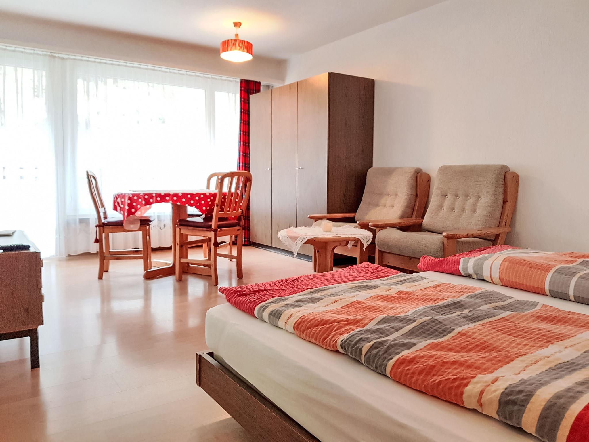 1-Zimmer-Wohnung 30 m2, im Erdgeschoss. Einfach und zweckmässig eingerichtet: Wohn-/Schlafzimmer mit 1 Doppelbett (2 x 90 cm, Länge 200 cm), Esstisch, Kabel-TV und Radio. Ausgang zum Balkon. Küche (3 Kochplatten, Toaster, Wasserkocher, Tiefkühler, elektrische Kaffeemaschine, Fondue Set (Käse)). Bad/WC. Balkon 8 m2, Ostlage. Balkonmöbel. Sicht auf die Berge. Zur Verfügung: Haartrockner. Internet (Wireless LAN, gratis). Bitte beachten: Nichtraucher-Unterkunft. Maximal 1 Haustier/Hund erlaubt.