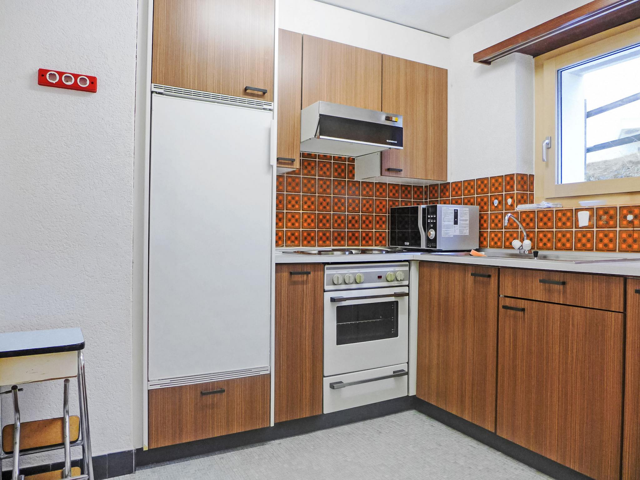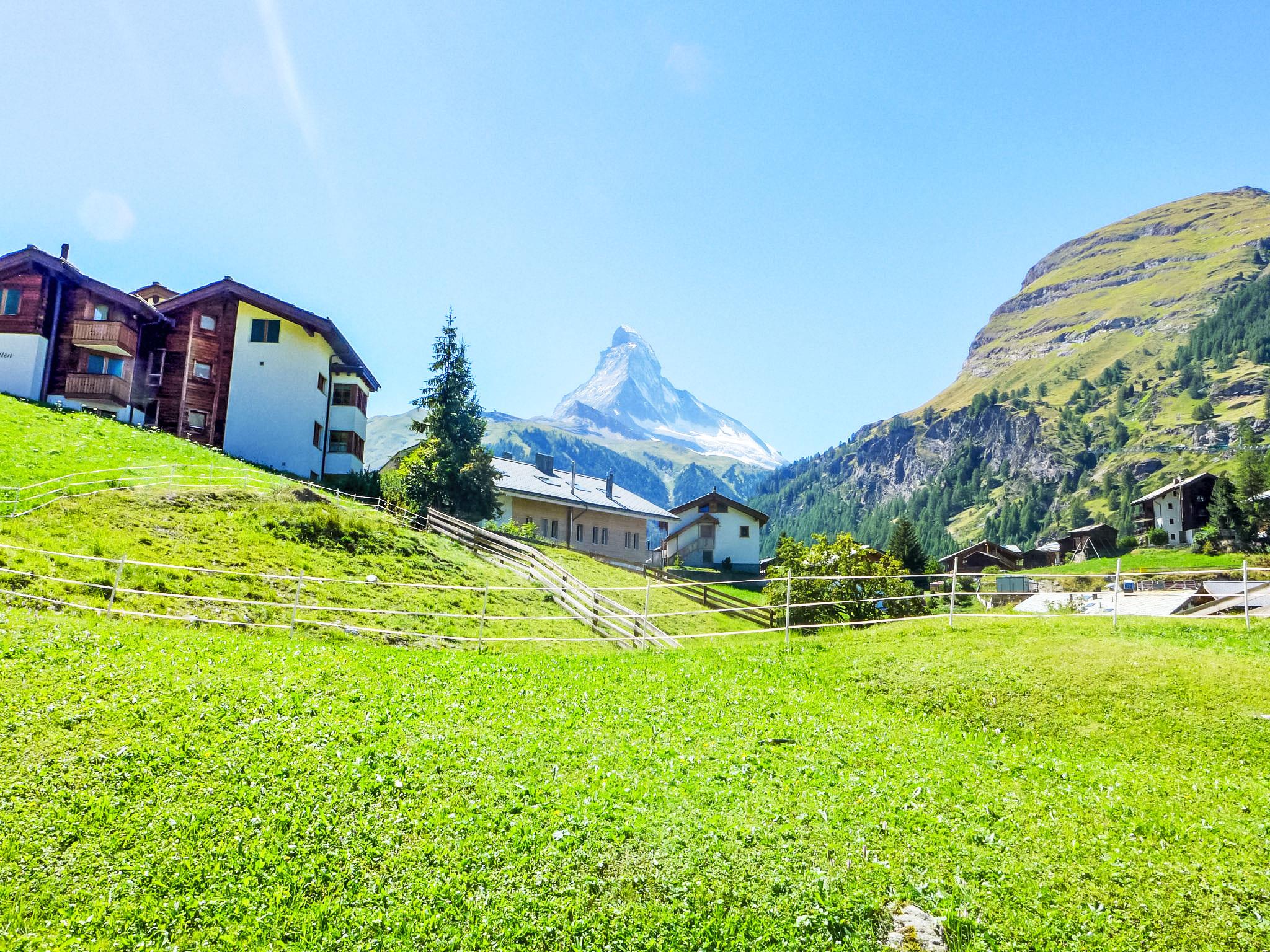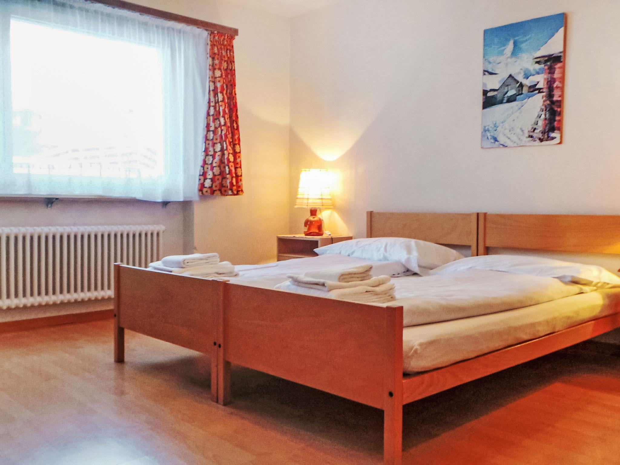2-Zimmer-Wohnung 65 m2, im Erdgeschoss. Sehr einfach eingerichtet: Wohn-/Schlafzimmer mit 1 Doppeldiwanbett (160 cm, Länge 200 cm), Esstisch und TV. Ausgang zur Terrasse. 1 Doppelzimmer mit 1 Doppelbett (2 x 90 cm, Länge 210 cm). Küche (3 Kochplatten, Backofen, Toaster, Wasserkocher, Mikrowelle, Tiefkühler, elektrische Kaffeemaschine, Fondue Set (Käse)). Bad/Bidet/WC. Terrasse 15 m2 teilweise überdacht, Südwestlage. Terrassenmöbel. Sehr schöne Sicht auf Matterhorn. Zur Verfügung: Haartrockner. Internet (Wireless LAN, gratis). Bitte beachten: Nichtraucher-Unterkunft.