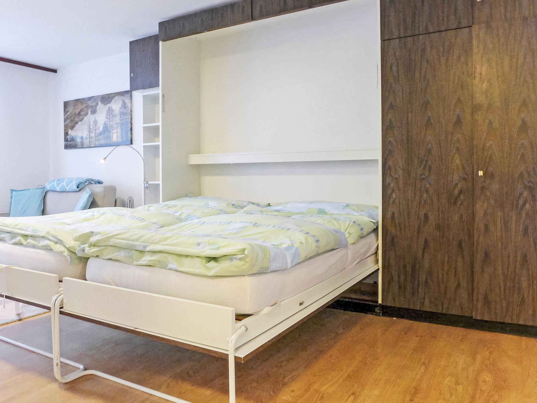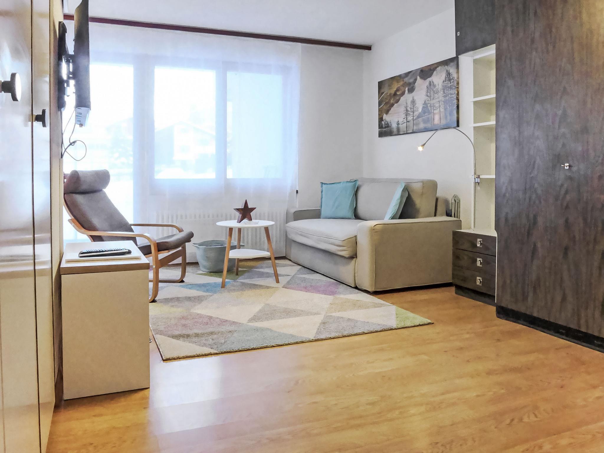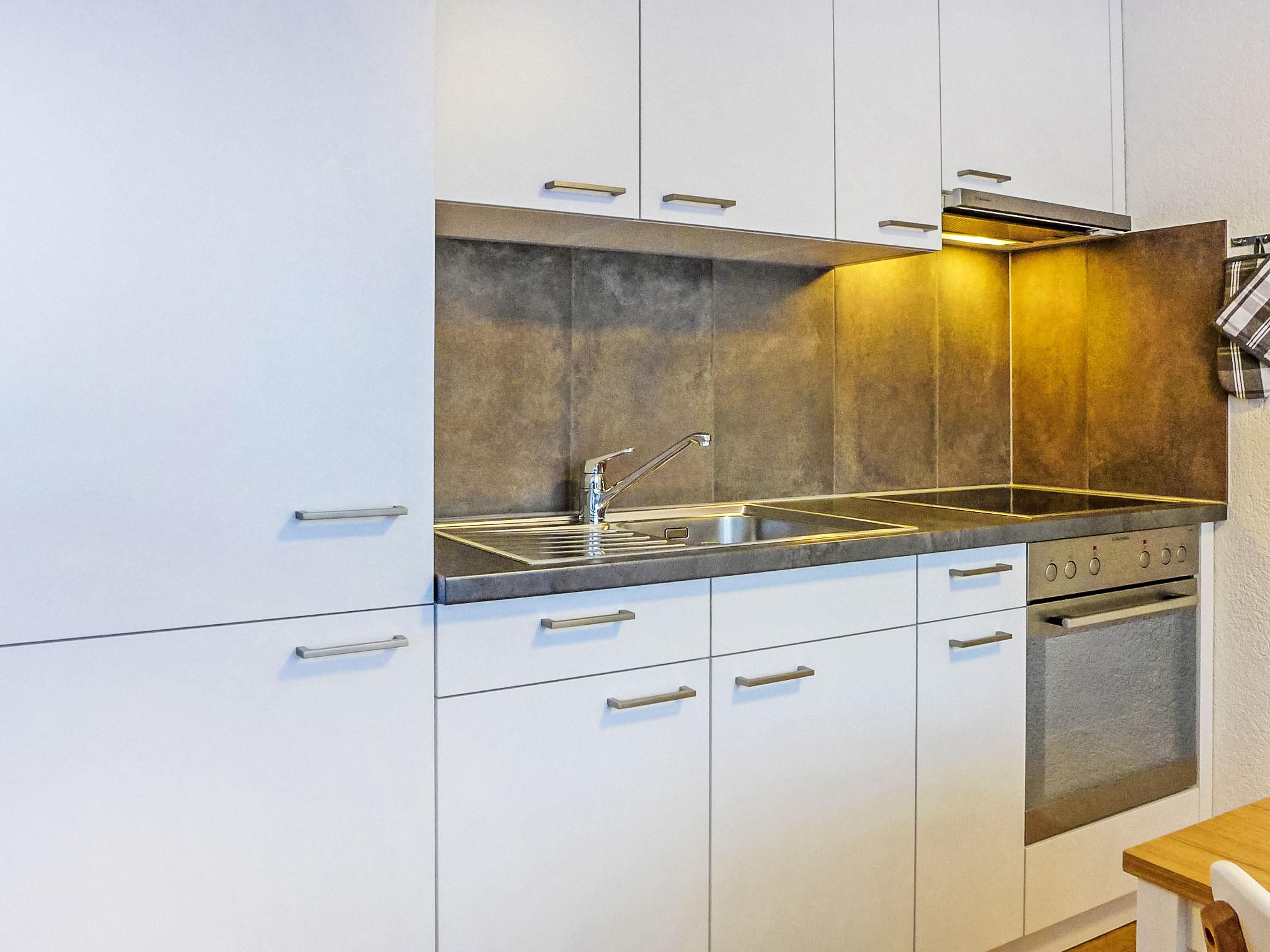 1-Zimmer-Wohnung 30 m2, im Erdgeschoss, Südlage. Hell, teilweise im Jahre 2017, einfach und gemütlich eingerichtet: Wohn-/Schlafzimmer mit 2 Doppelwandklappbetten (2 x 90 cm, Länge 200 cm), TV. Ausgang zum Garten, zur Terrasse. Offene Küche (3 Kochplatten, Backofen, Toaster, Wasserkocher, Tiefkühler, elektrische Kaffeemaschine, Fondue Set (Käse)) mit Esstisch. Dusche/WC. Heizung. Terrasse, Südlage. Terrassenmöbel. Schöne Sicht auf die Berge. Zur Verfügung: Haartrockner. Internet (Wireless LAN, gratis). Bitte beachten: Nichtraucher-Unterkunft.