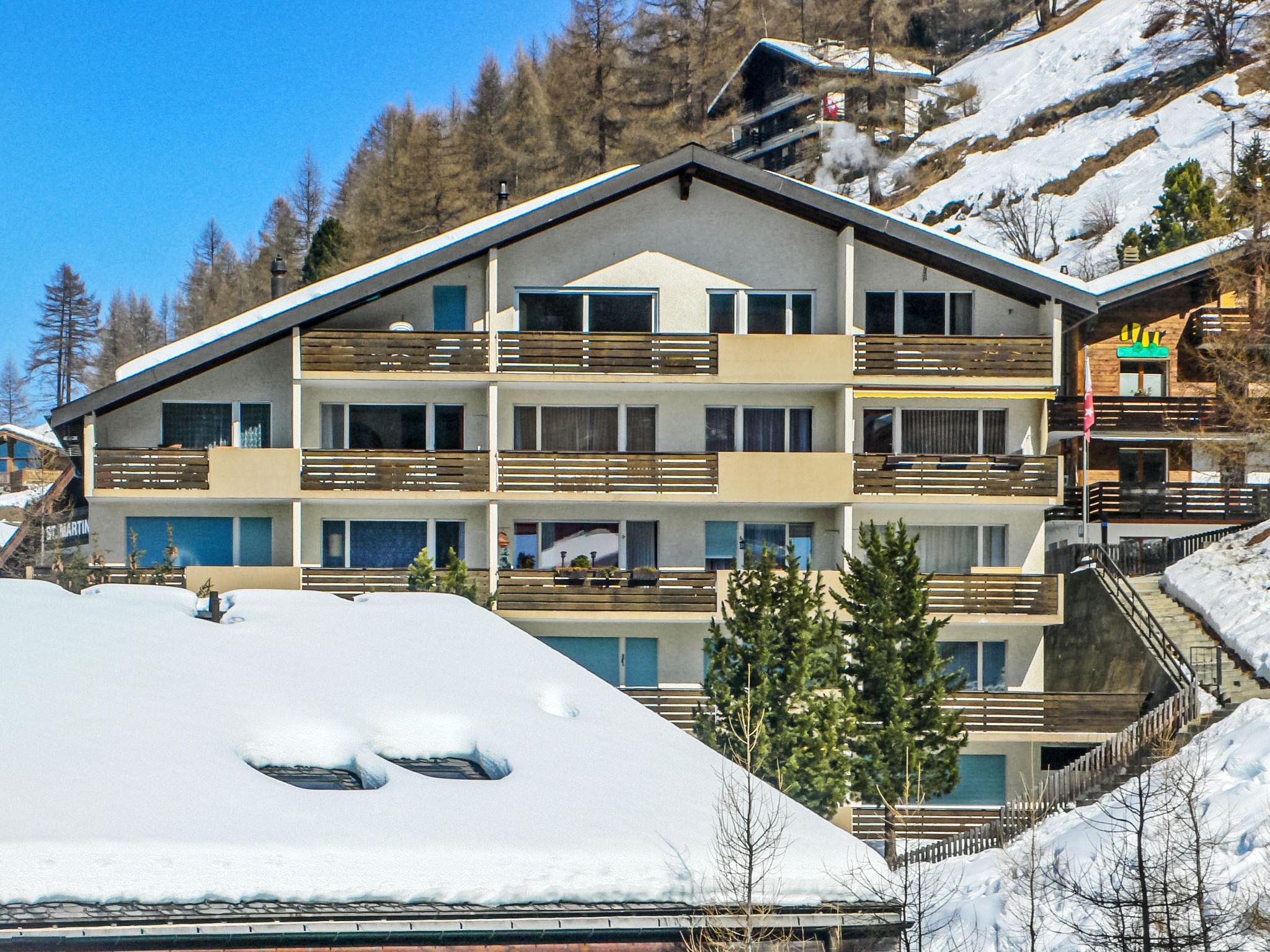 Grosses, einfaches Mehrfamilienhaus "Kondor", auf 5 Stockwerken. Im Ortsteil Gryfelblatte, 600 m vom Zentrum von Zermatt, ruhige, sonnige, erhöhte Lage am Hang. Im Hause: Fahrstuhl, Skiraum, Zentralheizung. Treppenweg (96 Stufen) bis zum Haus. Supermarkt 450 m, Restaurant 70 m, Bäckerei 600 m, Zentrum zu Fuss in 10 Minuten erreichbar, Bushaltestelle "Wiestibrücke" 230 m, Bahnstation "Bahnhof Zermatt" 600 m. Bergeisenbahn, Skiverleih 450 m, Skibushaltestelle 230 m, Skischule 850 m, Kinderskischule. Taxi kann nicht bis zum Haus fahren. Die Schlüsselübergabe findet bei der Agentur Interhome in Zermatt statt.