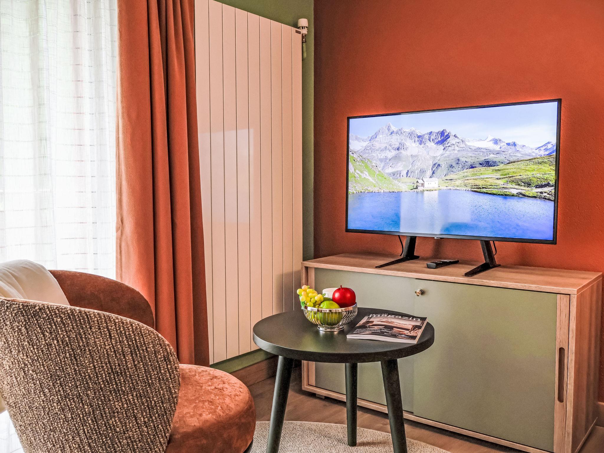 "Juliana 825", 1-Zimmer-Wohnung 21 m2 im 2. Stock. Vollständig renoviert im Jahre 2025, schön und stilvoll eingerichtet: Wohn-/Schlafzimmer mit 1 Doppelbett (2 x 90 cm, Länge 200 cm), Esstisch und Digital-TV. Ausgang zum Balkon. Offene Küche (Backofen, Geschirrspüler, 4 Glaskeramikplatten, Toaster, Wasserkocher, Mikrowelle, Tiefkühler, elektrische Kaffeemaschine, Racletteofen, Fondue Set (Käse)). Dusche/WC. Balkon, Westlage. Balkonmöbel. Sicht auf die Berge. Zur Verfügung: Haartrockner. Internet (WLAN, gratis). Bitte beachten: Nichtraucher-Unterkunft.