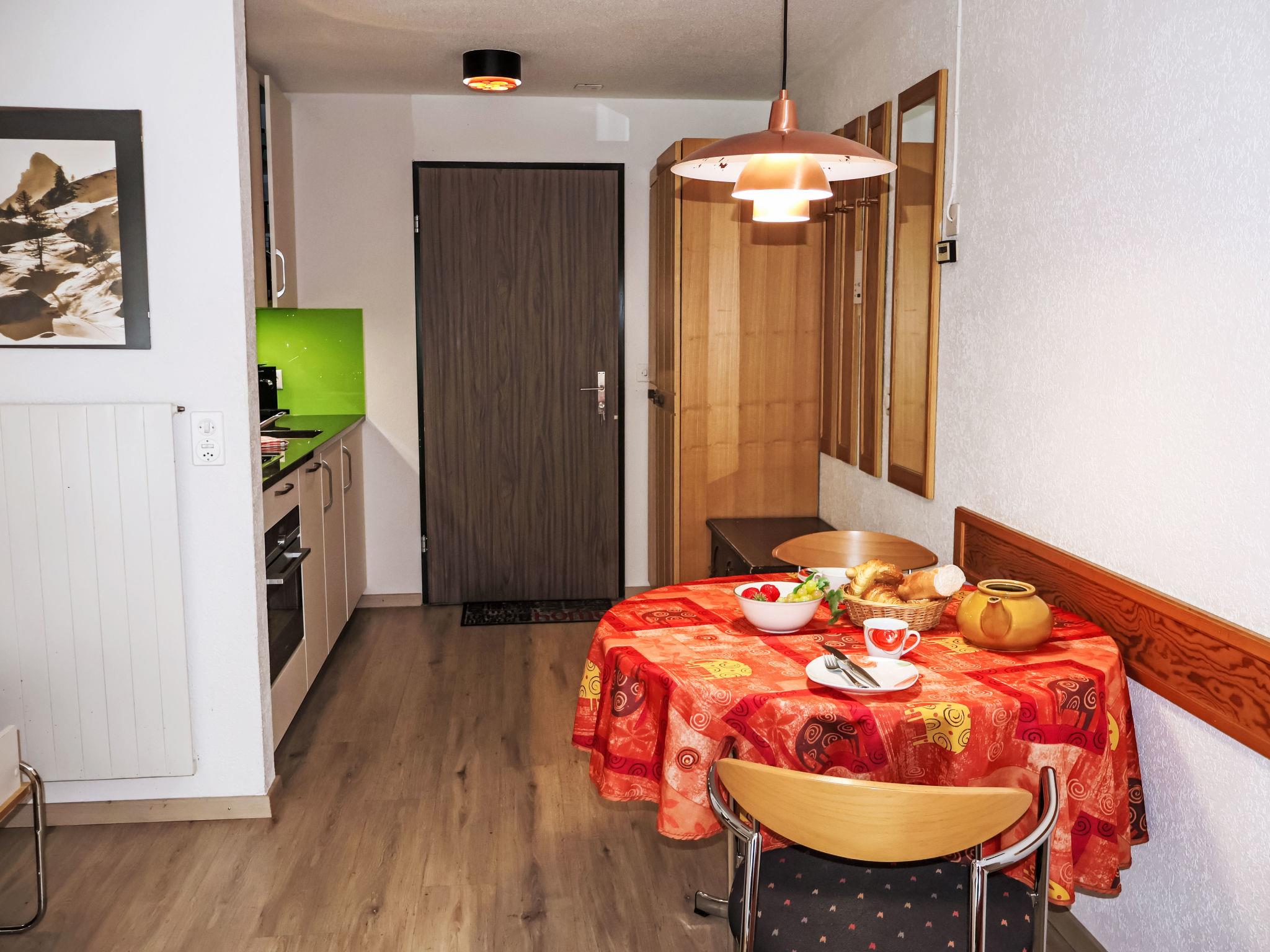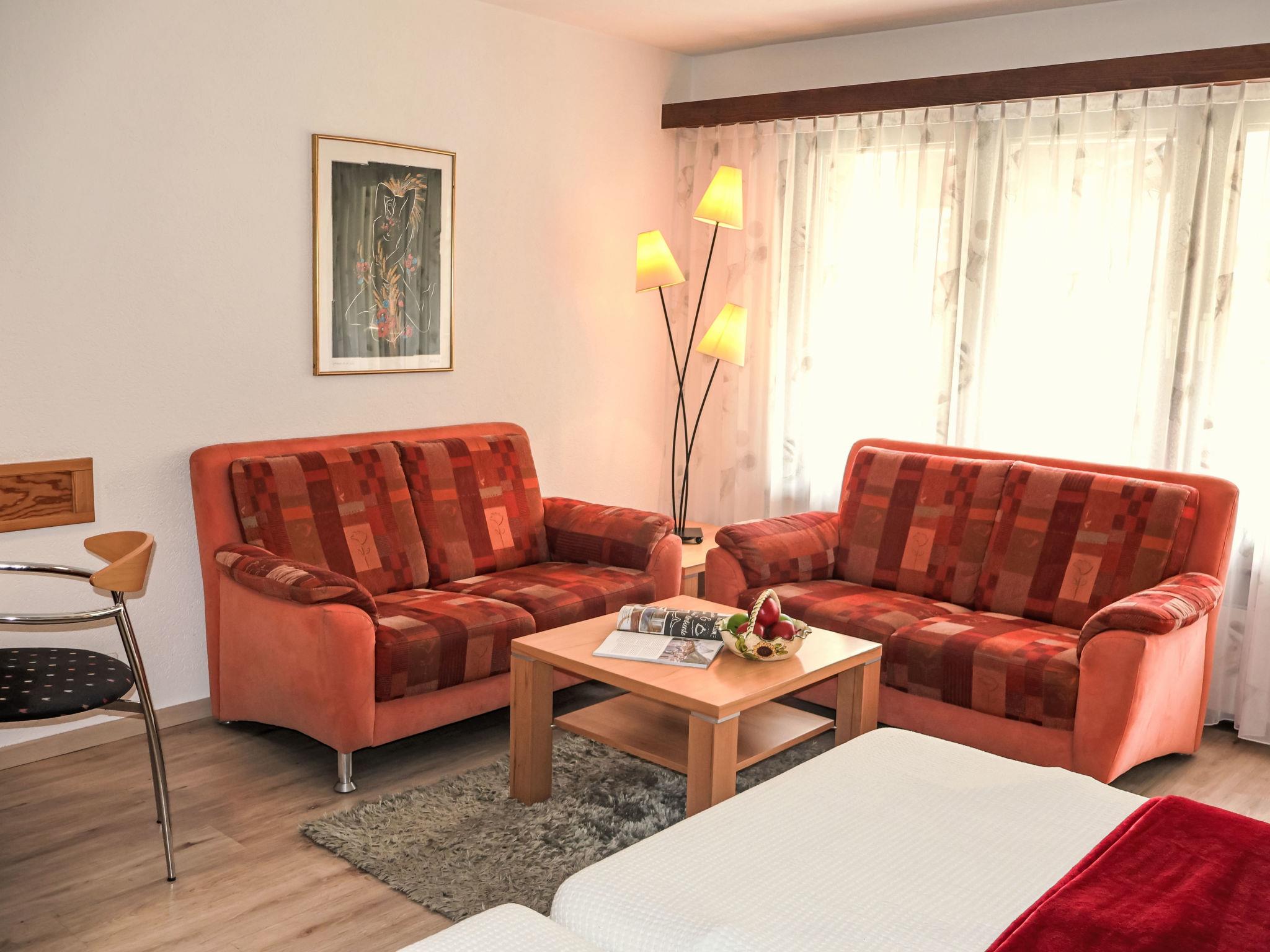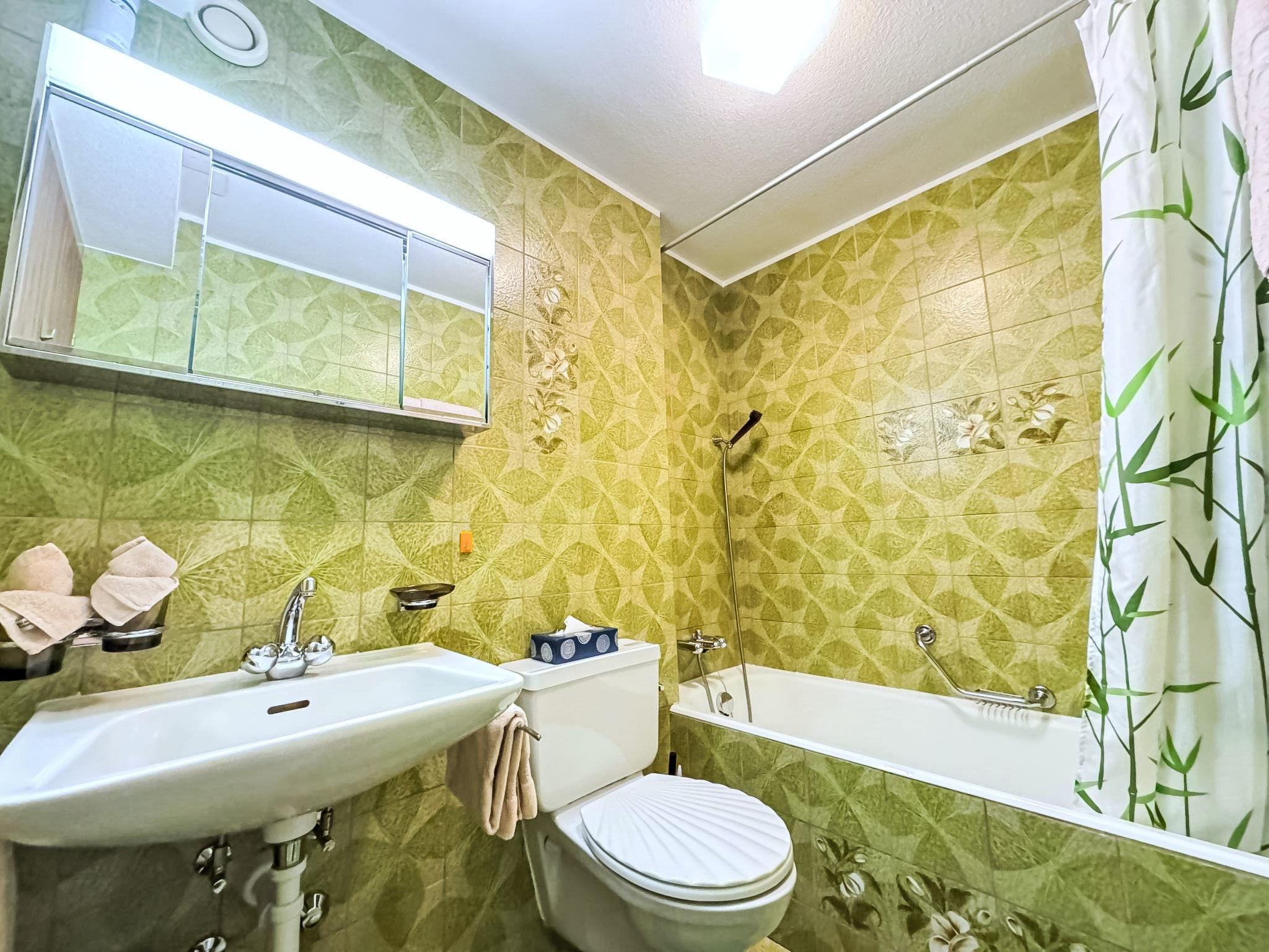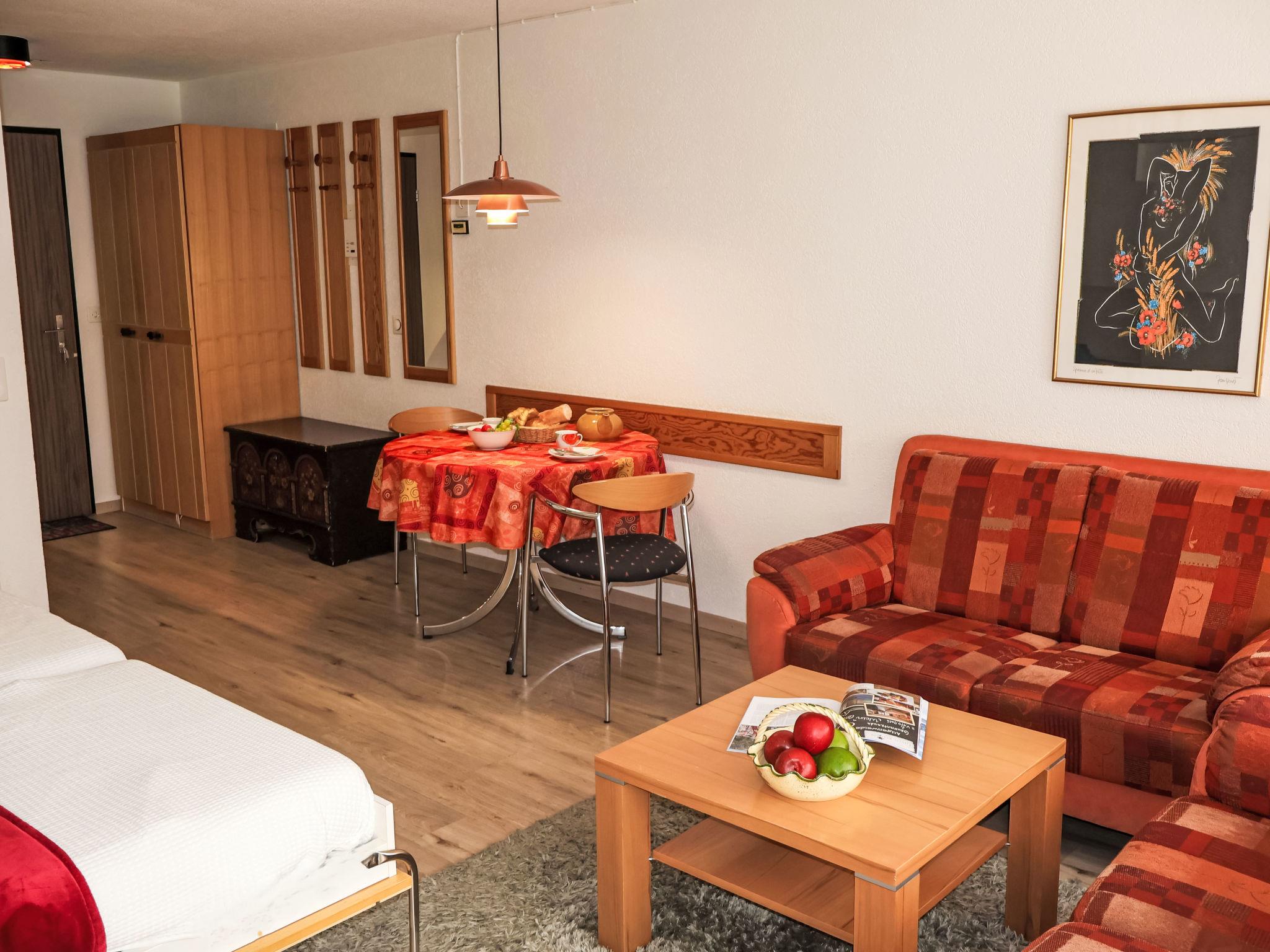 "Pasadena 6", 1-Zimmer-Wohnung 25 m2 im 2. Stock. Hell, teilweise renoviert, geschmackvoll und gemütlich eingerichtet: Wohn-/Schlafzimmer mit 2 Wandschrankbetten (90 cm, Länge 200 cm), Esstisch und Digital-TV. Ausgang zum Balkon. Küche im Eingang (Backofen, Geschirrspüler, 4 Glaskeramikplatten, Toaster, Wasserkocher, Tiefkühler, elektrische Kaffeemaschine). Bad/WC. Parkettboden. Balkon. Balkonmöbel. Seitliche Sicht auf die Berge. Zur Verfügung: Haartrockner. Internet (WLAN, gratis). Bitte beachten: Nichtraucher-Unterkunft.