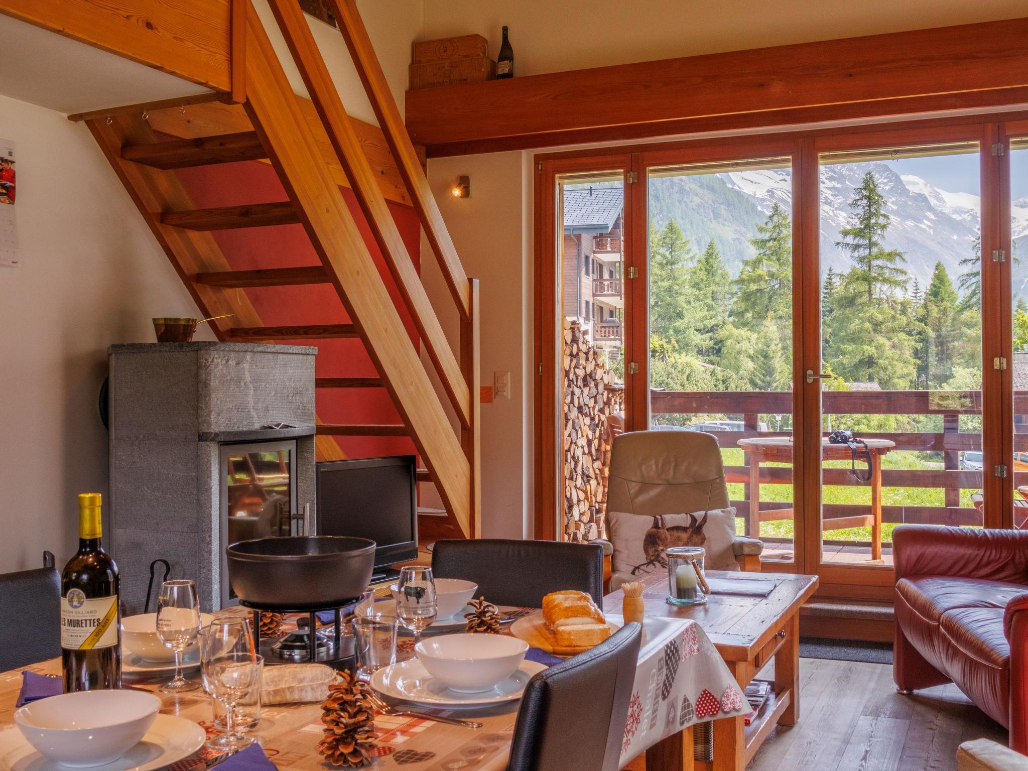 "Ryad C", 4-Zimmer-Wohnung 85 m2, im Obergeschoss, Südlage. Komfortabel und geschmackvoll eingerichtet: Wohn-/Esszimmer mit Schwedenofen, Kabel-TV und E-Heizung. Ausgang zum Balkon, Richtung Süden. 1 Zimmer mit 1 Doppelbett (2 x 90 cm, Länge 200 cm). 1 kleines Zimmer mit 1 Ausziehbett (2 Pers. 2 x 90 cm, Länge 200 cm). Offene Küche (Backofen, Geschirrspüler, 4 Glaskeramikplatten, Toaster, Wasserkocher, Mikrowelle, Tiefkühler, elektrische Kaffeemaschine, Kapseln für die Kaffeemaschine (Nespresso), Racletteofen, Fondue Set (Käse)). Bad/WC, sep. WC. Warmluftheizung. Obergeschoss: 1 Zimmer mit 2 Betten (90 cm, Länge 200 cm). Parkettboden. Balkon. Balkonmöbel. Sehr schöne Sicht auf die Berge, die Landschaft und die Ortschaft. Zur Verfügung: Bügeleisen, Haartrockner, Holz (gratis). Internet (Wireless LAN, gratis). Parkplatz Nr. Ryad C beim Haus. Bitte beachten: Nichtraucher-Unterkunft.