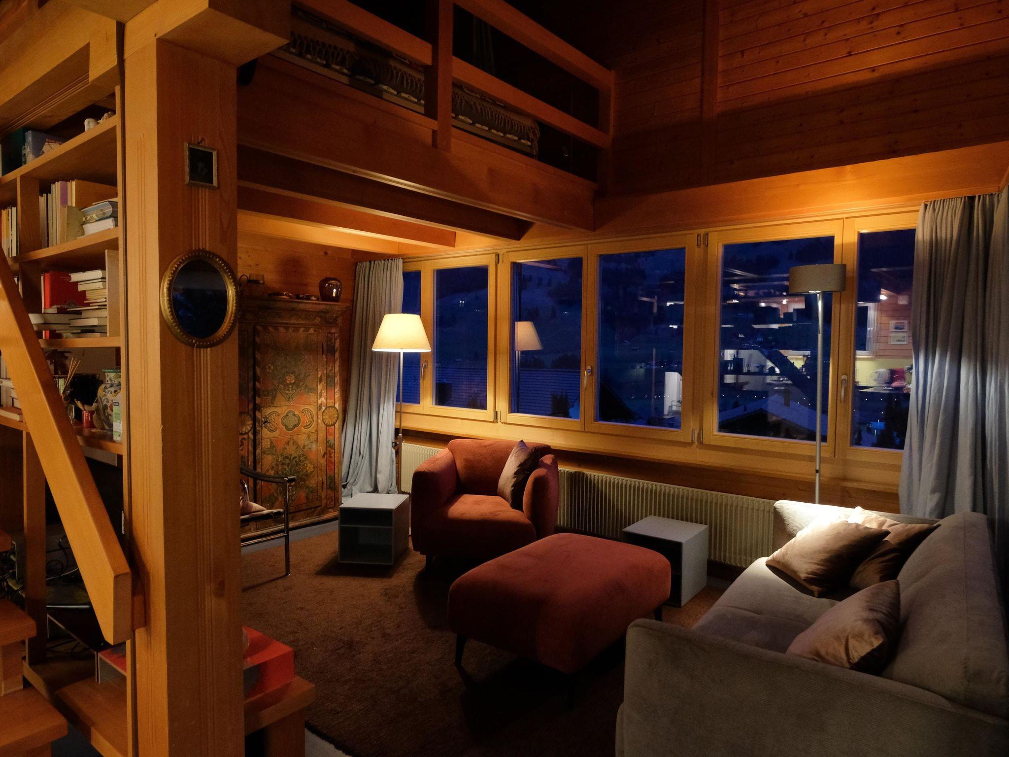 Hochparterre (Eingang): Grosses und helles Wohn-/Esszimmer mit Sofa, 2 Sesseln, TV, Teleboy mit über 250 Sendern, Apple TV und Netflix (eigenes Abo nötig), Essecke mit Esstisch. Offene Küche mit Geschirrspüler, Kapsel-Kaffeemaschine (Nespresso), Fondue- und Raclette-Set sowie diversen weiteren Küchengeräten. 1 Schlafzimmer mit Grand Lit (160x200cm). 1 Badezimmer mit Badewanne/WC. 1. Stock (Galerie): 1 separates Schlafzimmer mit 1 Grand Lit (140x200cm). 1 Grand Lit (140x200cm / automatisch verstellbares ergonomisches Bettsystem) auf der Galerie (kein abgeschlossener Raum). WiFi (1000MB/s).
