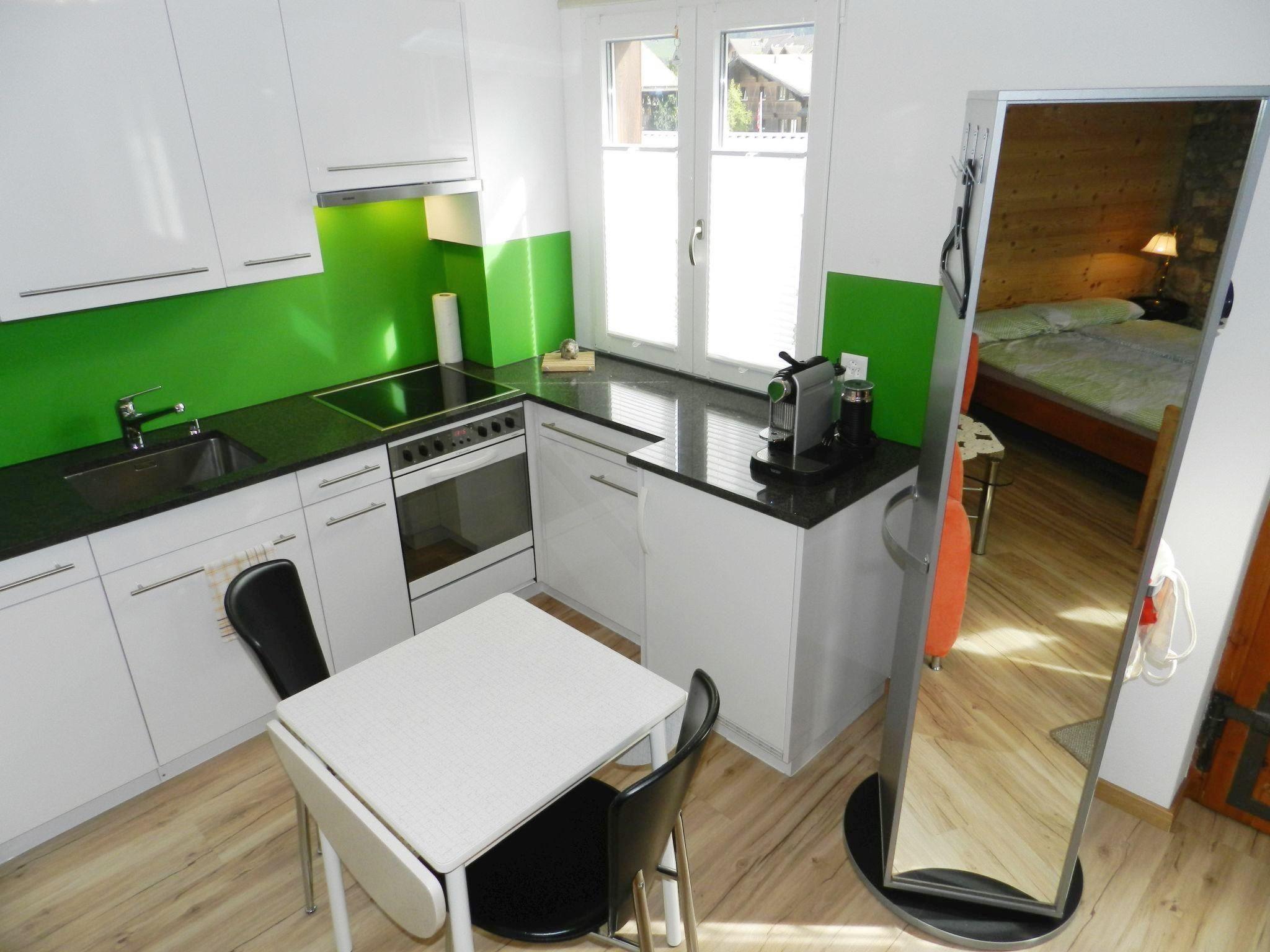 Wohn-/Ess-/Schlafzimmer mit offener Küche (Backofen, Geschirrspülmaschine, Kühlschrank mit Gefrierfach, Kapsel-Kaffeemaschine (Nespresso) sowie Wasserkocher und Raclette-Set), kleinem Esstisch, 2 Sesseln, TV und Grandlit (140x200cm). 1 Badezimmer mit Dusche/WC. WiFi.
