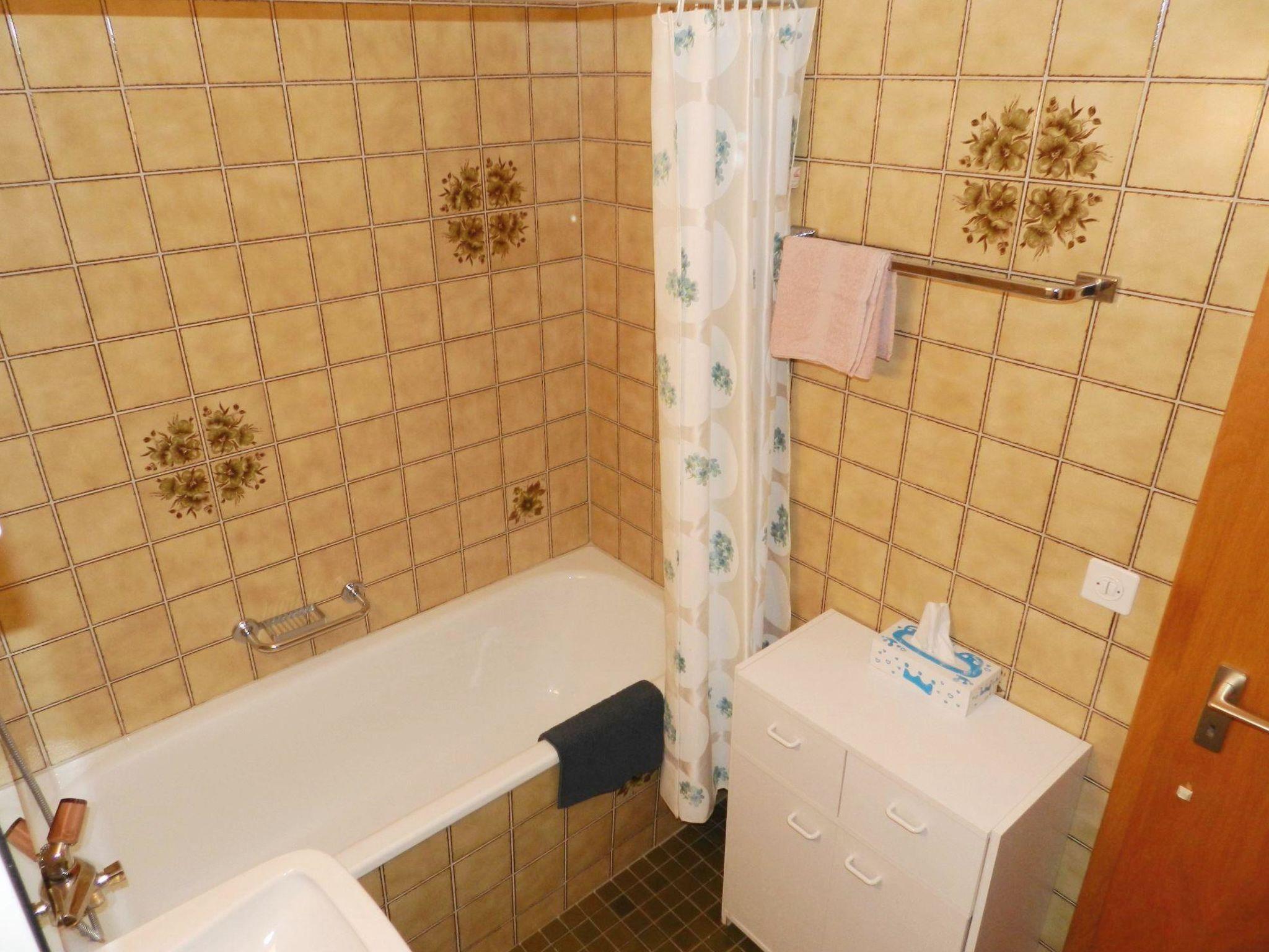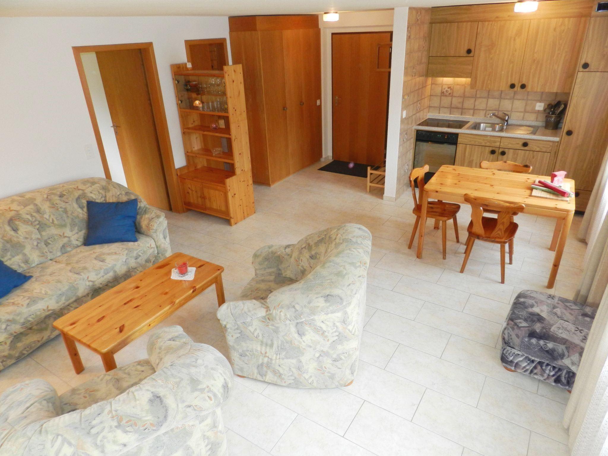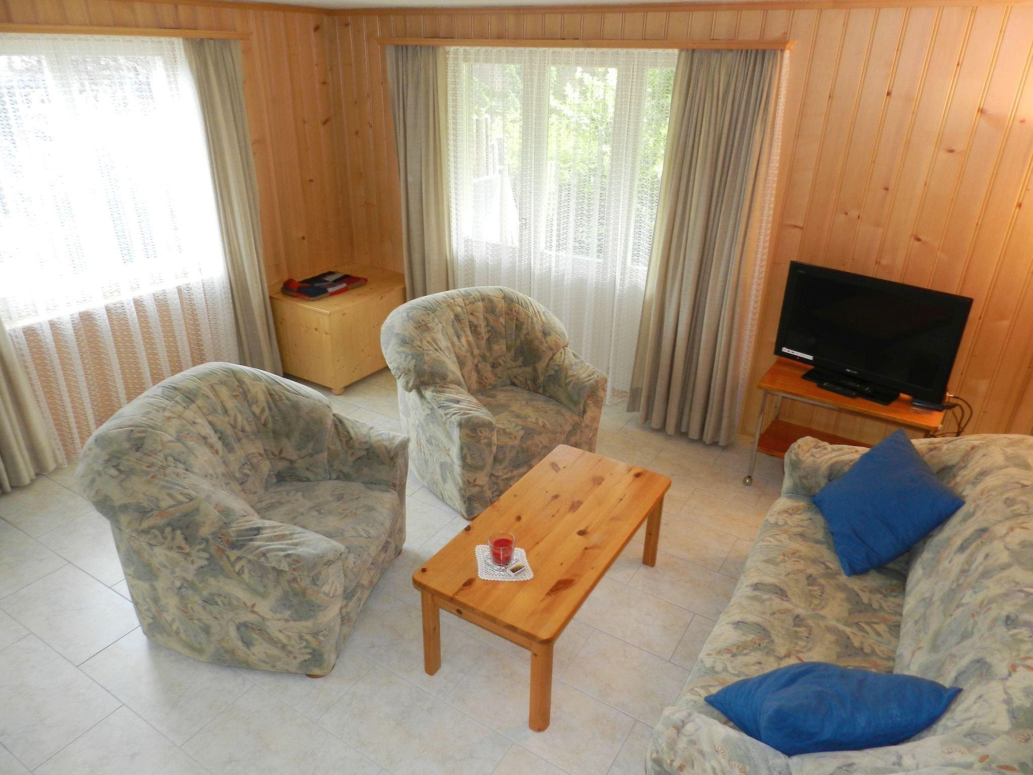 Wohn-/Esszimmer mit Esstisch, Bettsofa (140x190cm, für max. 1 Erwachsenen oder 2 Kinder), 2 Sesseln, TV (Swisscom) und offener Küche (u.a. ausgestattet mit Backofen, Kühlschrank mit Gefrierfach, Kapsel-Kaffeemaschine (Dolce Gusto), Toaster, Wasserkocher sowie Raclette- und Fondue-Set). 1 Schlafzimmer mit 2 zusammengeschobenen Einzelbetten (2x90x200cm). 1 Badezimmer mit Badewanne und WC. WiFi.