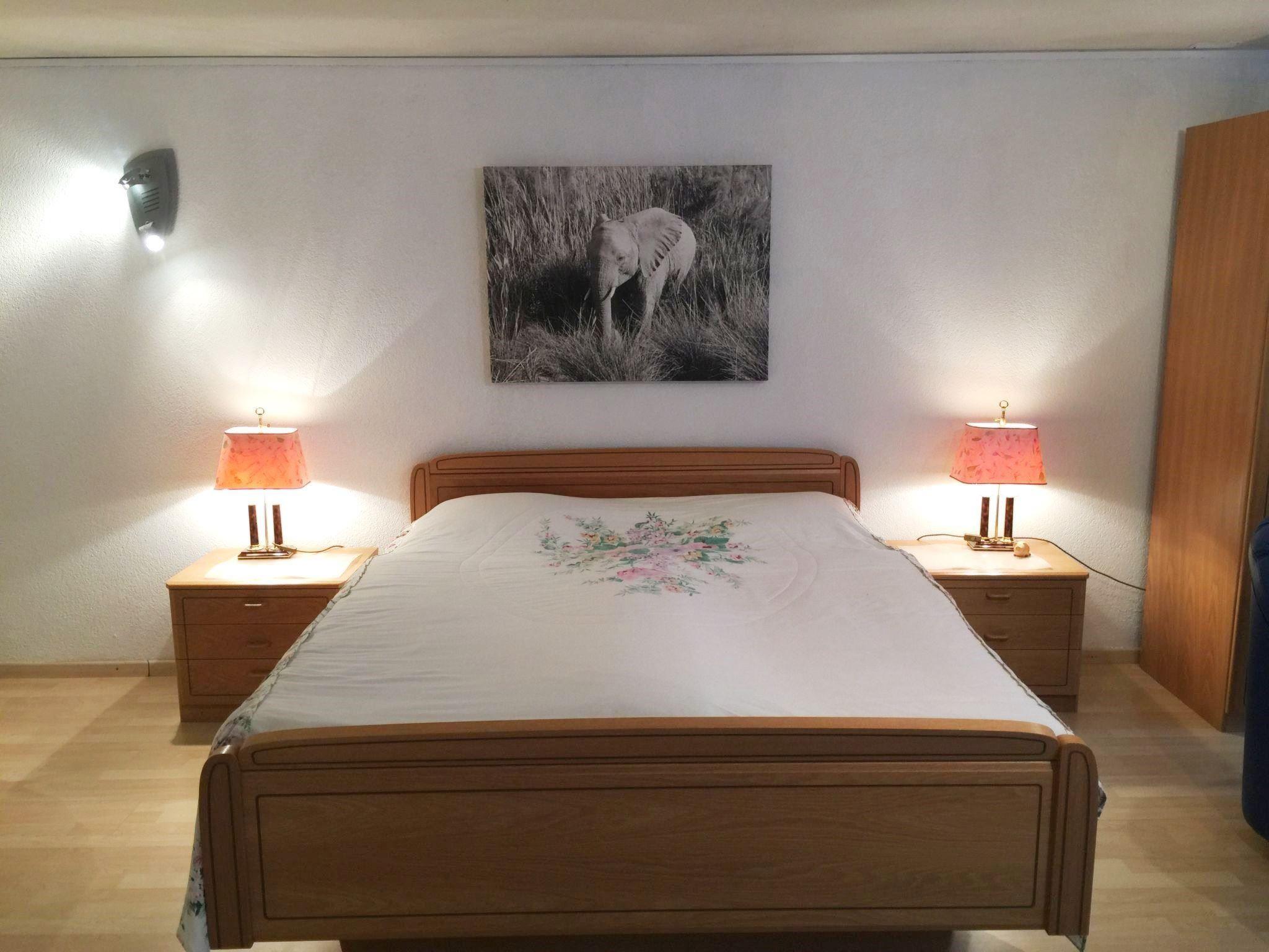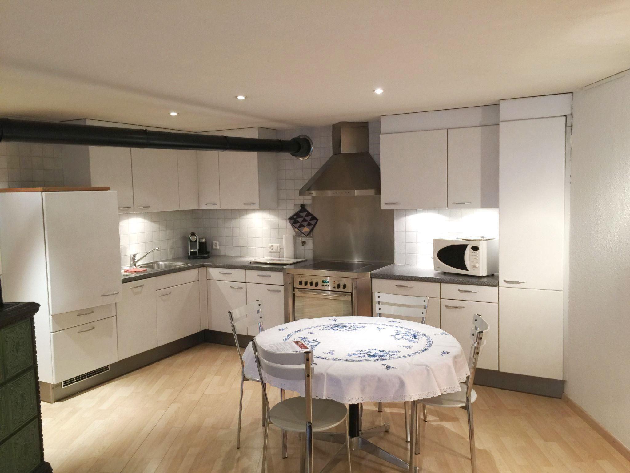 Wohn-/Ess-/Schlafzimmer mit offener Küche (Backofen, Mikrowelle, Geschirrspülmaschine, Kühlschrank mit Gefrierfach, Kapsel-Kaffeemaschine (Nespresso), Wasserkocher und Raclette-Set), Esstisch mit 4 Stühlen, Sofa, 1 Sessel, TV, 2 Schränke und 1 Doppelbett (180x200cm). 1 Badezimmer mit Dusche, Badewanne und WC. Der Schwedenofen darf von Gästen nicht benutzt werden. Die Wohnung verfügt über eine Bodenheizung. Kinderbett (60x120cm, inkl. Bettwäsche) und WiFi vorhanden.