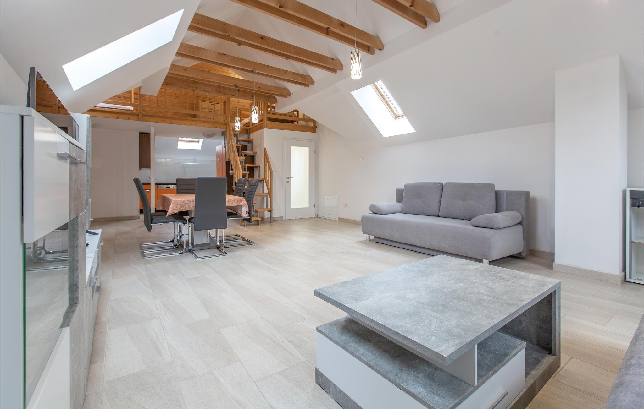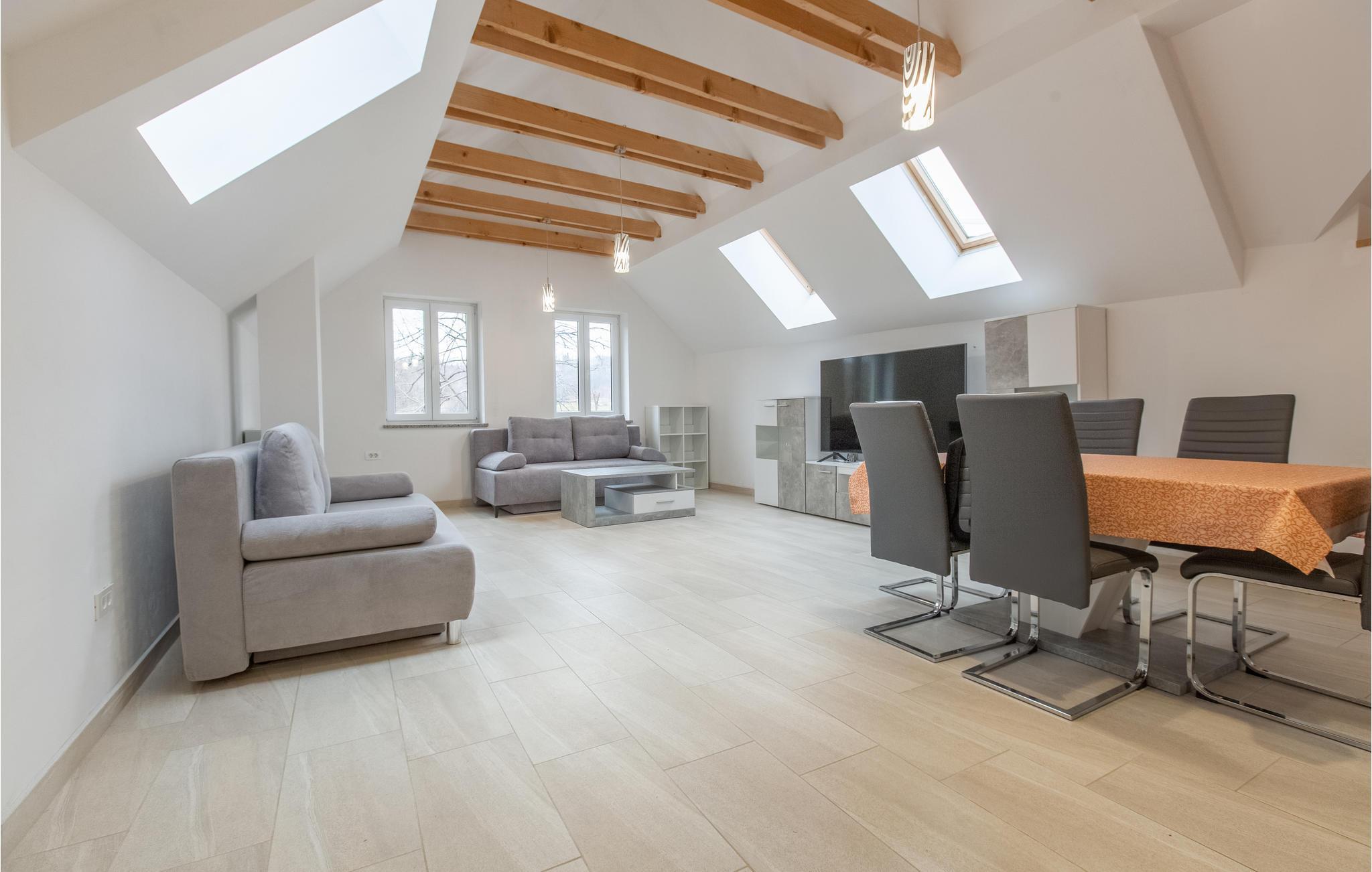 Lassen Sie sich in den hellen Räumen häuslich nieder, mit der wohnlichen Einrichtung, die durch viel Holz einen warmen Ausdruck erhält, ist die Wohnung der ideale Ort für eine schöne Auszeit nahe der Natur. Machen Sie es sich nach Ihren Unternehmungen im Wohnzimmer gemütlich, das mit bequemen Sofas zum Entspannen einlädt.