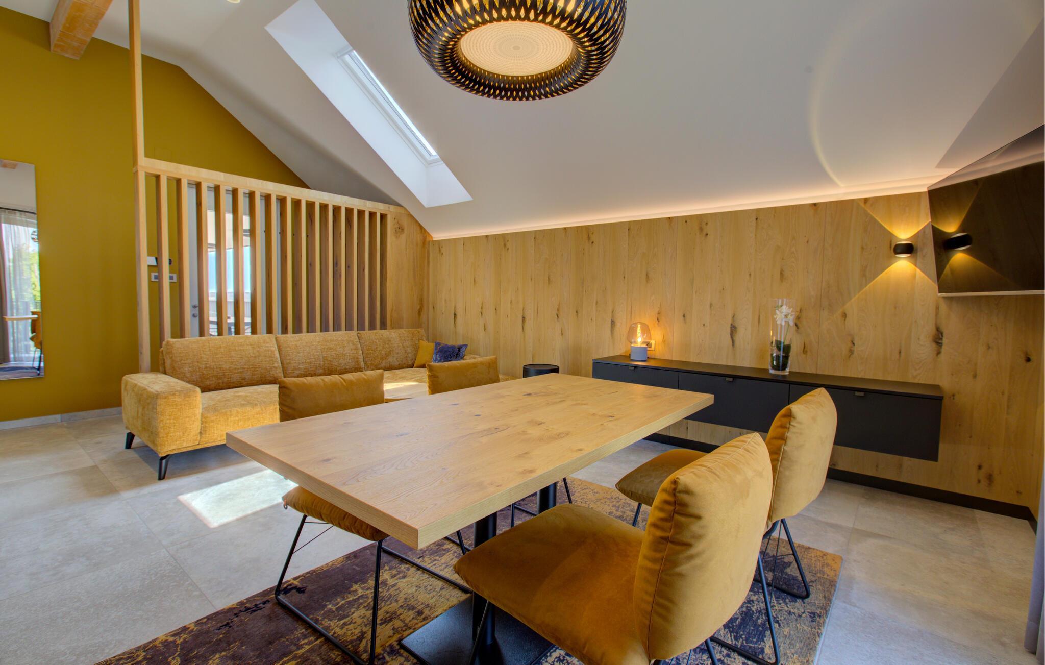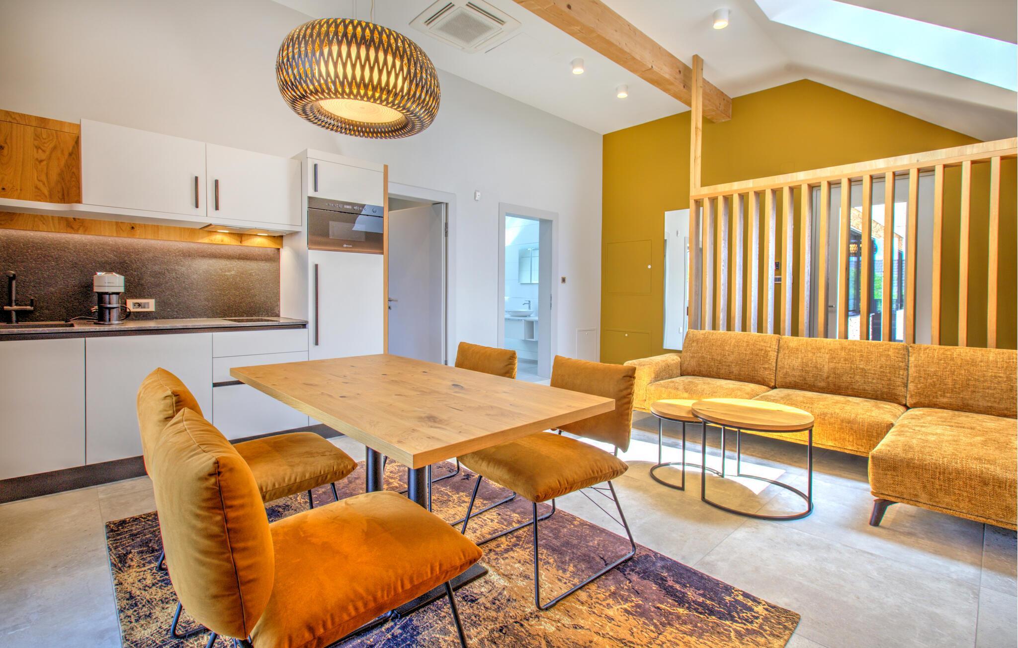 Verbringen Sie entspannte Tage zu zweit in dieser eleganten Ferienwohnung im ersten Stock, die sich auf einem großzügigen Anwesen mitten in einer grünen Hügellandschaft befindet. Freuen Sie sich auf Erholung, Komfort und eine moderne Ausstattung inmitten ruhiger Natur. Richten Sie sich im hellen Wohn- und Essbereich und entspannen Sie sich auf dem gemütlichen Sofa. Neben einer wundervollen Aussicht bietet Ihnen Ihre Wohnung auch einen gemeinschaftlich zugänglichen Wellnessbereich mit Sauna, Indoorpool und Fitnessraum für eine erholsame Auszeit.