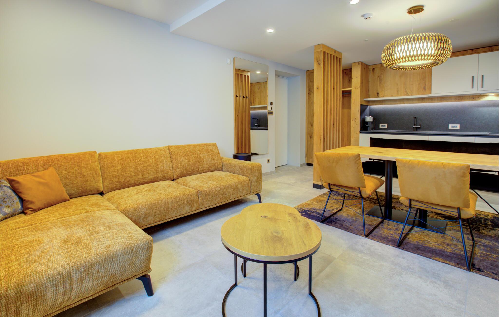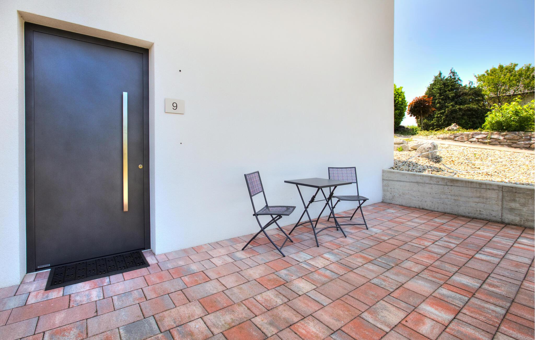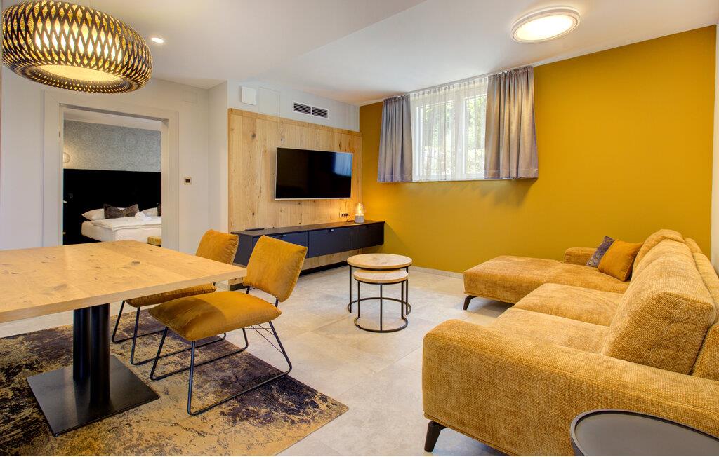 Verbringen Sie entspannte Tage zu zweit in dieser eleganten Ferienwohnung im ersten Stock, die sich auf einem großzügigen Anwesen mitten in einer grünen Hügellandschaft befindet. Freuen Sie sich auf Erholung, Komfort und eine moderne Ausstattung inmitten ruhiger Natur. Richten Sie sich im hellen Wohn- und Essbereich und entspannen Sie sich auf dem gemütlichen Sofa. Neben einer wundervollen Aussicht bietet Ihnen Ihre Wohnung auch einen gemeinschaftlich zugänglichen Wellnessbereich mit Sauna, Indoorpool und Fitnessraum für eine erholsame Auszeit.