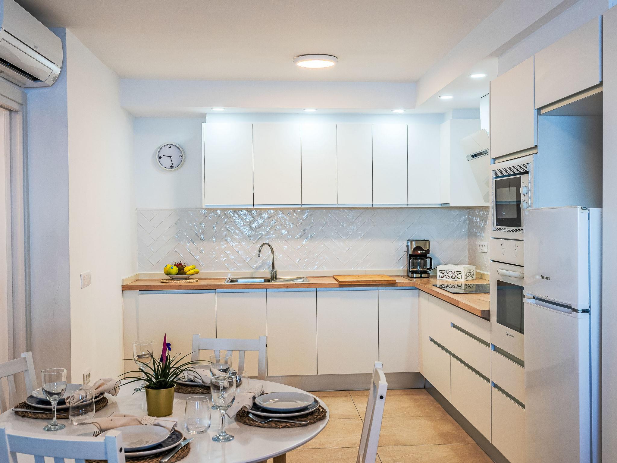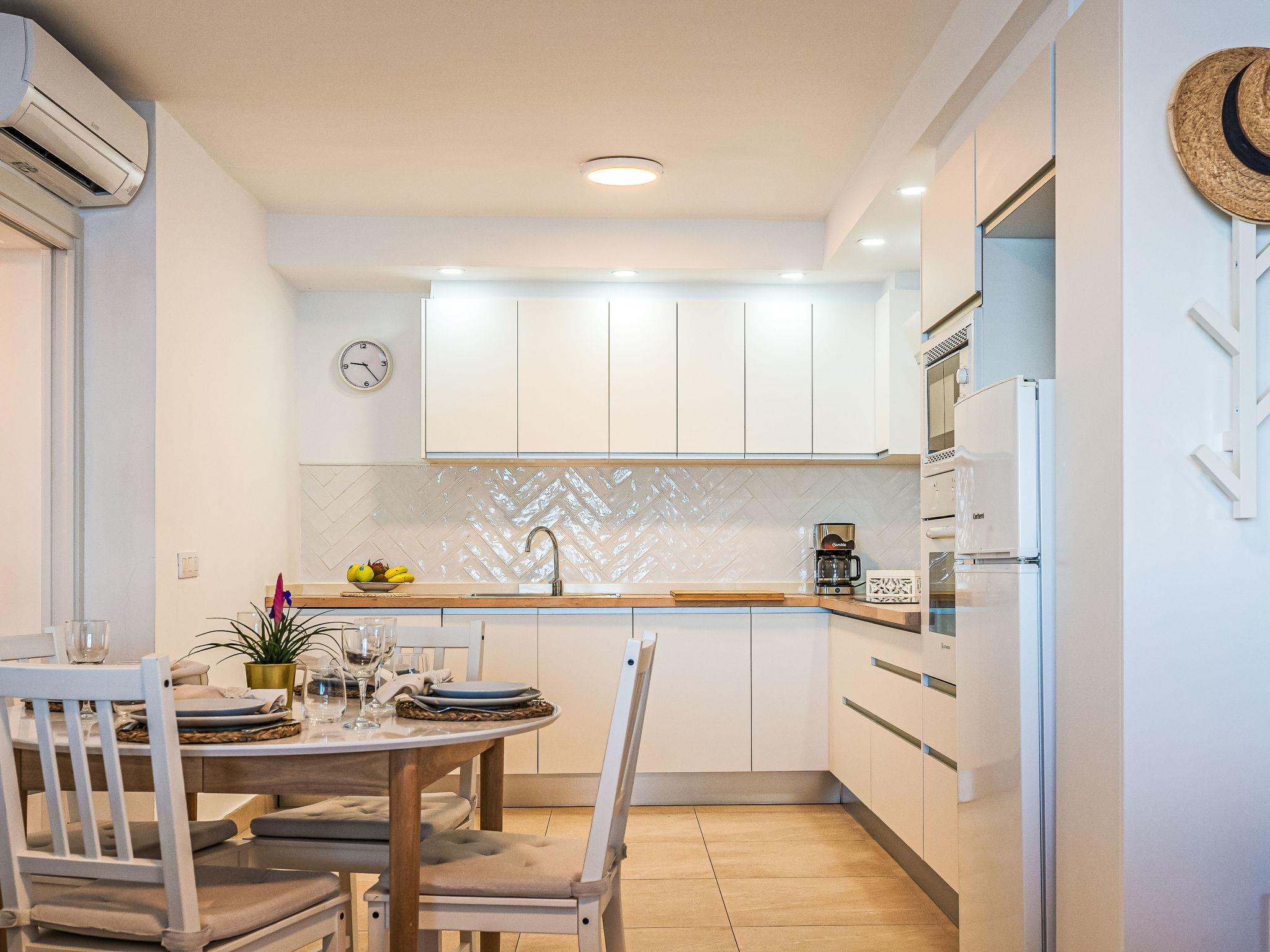 "Daura", 3-Zimmer-Wohnung 72 m2, im Erdgeschoss. Objekt geeignet für 5 Erwachsene. Hell, zweckmässig und komfortabel eingerichtet: Wohnzimmer mit Digital-TV und Flachbildschirm. 1 Zimmer mit 1 franz. Bett (140 cm, Länge 190 cm), Klimaanlage. 1 Zimmer mit 3 Betten (80 cm, Länge 190 cm), Klimaanlage. Grosse, offene Küche (Geschirrspüler, 4 Glaskeramikplatten, Toaster, Wasserkocher, Mikrowelle, Tiefkühler, elektrische Kaffeemaschine) mit Esstisch, Klimaanlage. Dusche/Bidet/WC. Boiler (50 Liter). Keine Heizmöglichkeit. Herrliche Sicht auf das Meer. Zur Verfügung: Waschmaschine, Bügeleisen, Kinderhochstuhl, Babybett bis 2 Jahre, Haartrockner. Internet (WLAN, gratis). Bitte beachten: geeignet für Familien. Nichtraucher-Unterkunft. Kein Fahrstuhl. VV3510015479