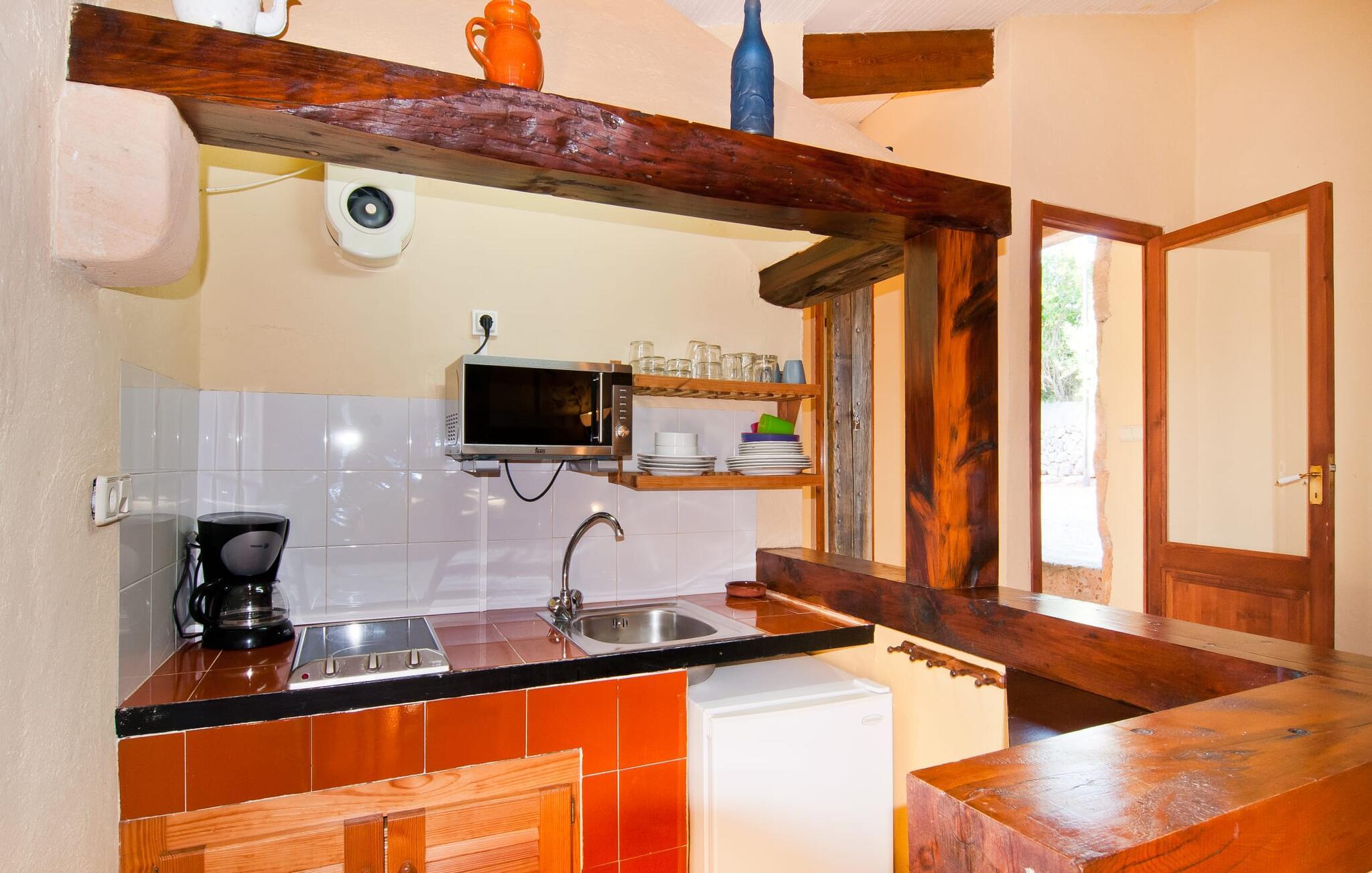 Vielleicht ist es „Es Porque“, der rustikale Bungalow, in dem Sie als Paar oder kleine Familie besonders viel Privatsphäre genießen können. Hier wohnte einst der Schweinehirt, direkt neben „Sa Porquera“, dem Geburtshaus der Ferkel. Ihr „Son Sureda“-Reich würde aus einem Doppelzimmer mit zwei 0,9 x 2 m großen Betten, einem modernen Duschbad und einem rustikalen Wohn-/Esszimmer mit typisch mallorquinischen Schaukelstühlen und einem kleinen Esstisch bestehen. An den Tagen, an denen Sie den ganzen Tag auf dem Anwesen bleiben möchten, können Sie in der Miniküche mit Kühlschrank, zwei Cerankochfeldern und einer Mikrowelle Snacks, Salate und kleine Mahlzeiten zubereiten. Die möblierte Terrasse, die von einer kleinen Natursteinmauer umgeben ist, ist direkt vom Wohnbereich aus zugänglich. Gönnen Sie sich zwischendurch eine Verschnaufpause mit einem guten Buch. Und es gibt eine Reihe lohnenswerter Ziele: Stadtleben oder Meeresbrise? Von Ihrer Villa-Unterkunft aus können Sie bequem die verschiedenen Seiten der Insel erkunden. Gut 15 km entfernt warten die Strände auf Sonnenanbeter, Surfer und Familien. Das weitläufige Son Serra de Marina und der fast zwei Kilometer lange Sandstrand in Richtung Colònia de Sant Pere bieten genügend Platz, um mehr als nur ein Handtuch auszubreiten. Wenn Sie die Blautöne von oben genießen möchten, fahren Sie nach Betlem und erklimmen die 5 km zur kleinen Ermita. Selbstverständlich sind auch anspruchsvollere Routen für Wanderschuhe und Mountainbikes möglich. Die Ma-3322, die je nach Windrichtung teilweise hörbar ist, führt Sie in die Stadt Manacor für einen spontanen Ausflug in die historische Innenstadt oder zum Einkaufen auf dem Vitaminmarkt. Wenn Sie die Kathedrale in Palma besichtigen möchten, lassen Sie Ihr Auto einfach am Bahnhof stehen und nehmen Sie den Bus oder die Bahn. Ferienhaus im Grünen mit viel Natur für die Villengäste. Fühlen Sie sich wie zu Hause auf dem zwischen Schafweiden und Weinreben gelegenen Agroturismo-Anwesen „Son Sureda“, das über elf Selbstversorger-Apartments und Studios, einen großen U-förmigen Innenhof und mehrere Pools verfügt. Manacor, eine der Metropolen der Insel, ist nur 9 km entfernt. Es eignet sich ideal zum Einkaufen auf dem täglichen Obst- und Gemüsemarkt, für Ausflüge und ein entspanntes Abendessen in einem Restaurant. Und an der Badia d’Alcúdia, in Richtung Son Serra de Marina und Colònia de Sant Pere, findet man noch einige Strände, die noch nicht überfüllt sind.