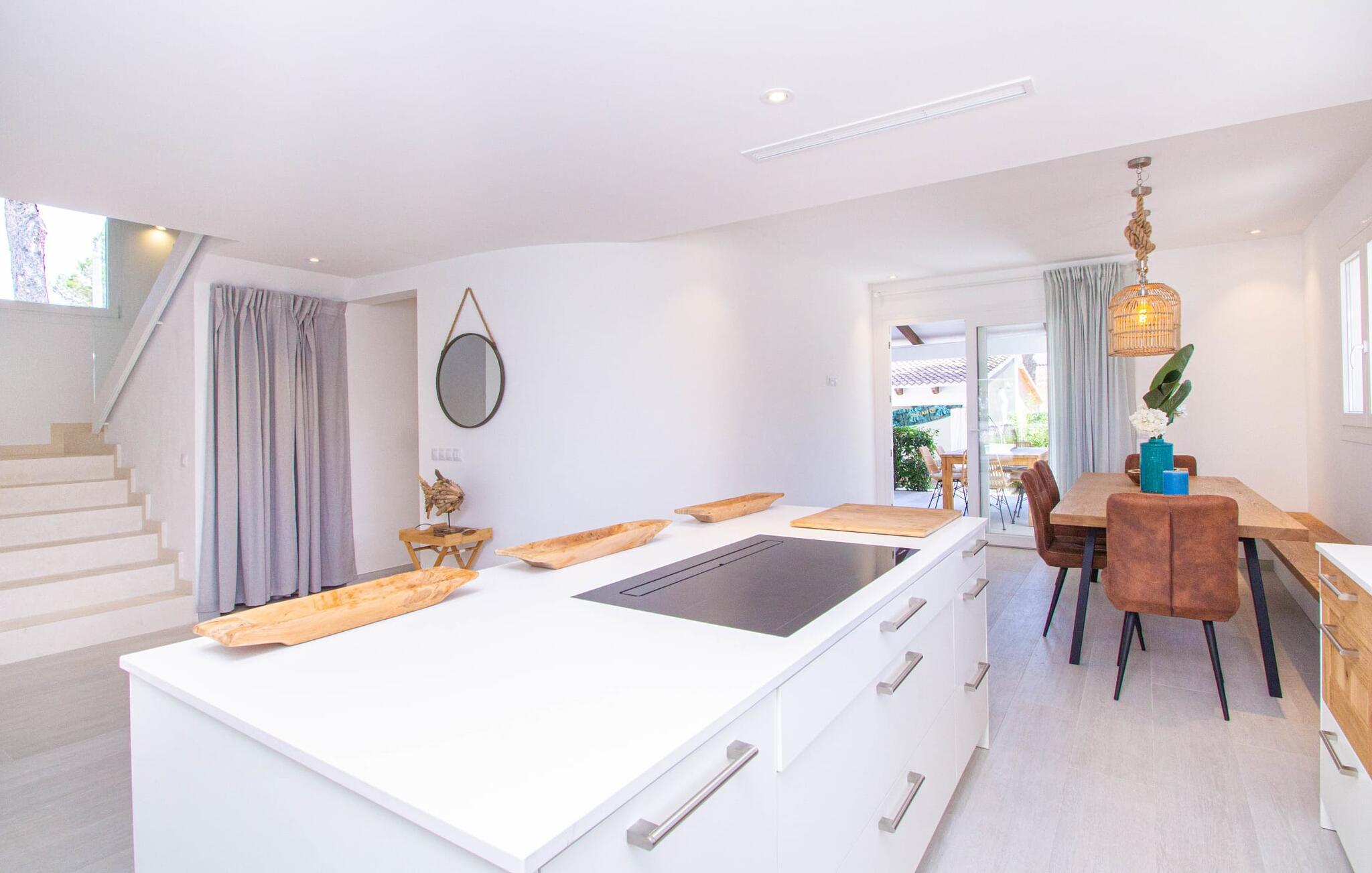 Im Inneren der lichtdurchfluteten Villa in Strandnähe erwartet Sie eine ästhetische und angenehm großzügige Atmosphäre. Das komfortable Haus verbreitet durch die eleganten Bodenbeläge und die Kombination von Holzmöbeln eine gemütliche und stilvolle Atmosphäre. Fußbodenheizung und Klimaanlage sorgen jederzeit für eine ideale Innentemperatur. Im Wohnzimmer lädt ein großes Sofa dazu ein, es sich vor dem Kamin gemütlich zu machen. Im Esszimmer gibt es einen großen Holztisch, an dem Sie eine gute Mahlzeit genießen können. Die Köstlichkeiten, die auf den Tisch kommen, lassen sich wunderbar in der voll ausgestatteten Küche nebenan zubereiten. Das geschmackvolle Ambiente setzt sich auch in den drei Schlafzimmern und den modernen Badezimmern fort, von denen zwei ensuite sind. Eines der oberen Schlafzimmer hat direkten Zugang zum Balkon. Die superstylische Villa „Alegria Mediterranea“ liegt strandnah und mitten im Ferienhausgebiet in Santa Ponsa und ist von einem sehr gepflegten Außenbereich umgeben. Einkaufsmöglichkeiten, das Meer und gute Küstenrestaurants sind fußläufig erreichbar. Port Adriano ist nur 750 m entfernt, schöne Strände sind ebenfalls nicht weit vom Haus entfernt. Durch die Lage an einer akustisch wahrnehmbaren kleinen Straße sind Sie optimal an andere Orte der näheren und weiteren Umgebung angebunden.