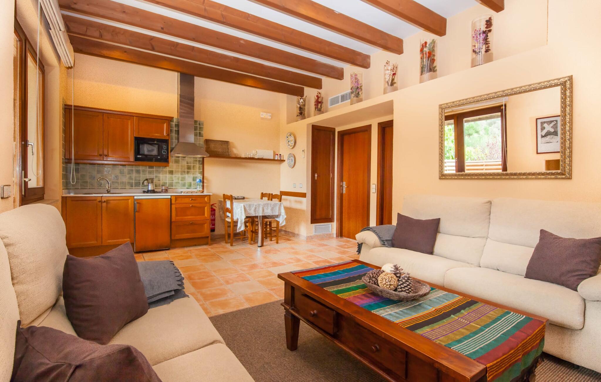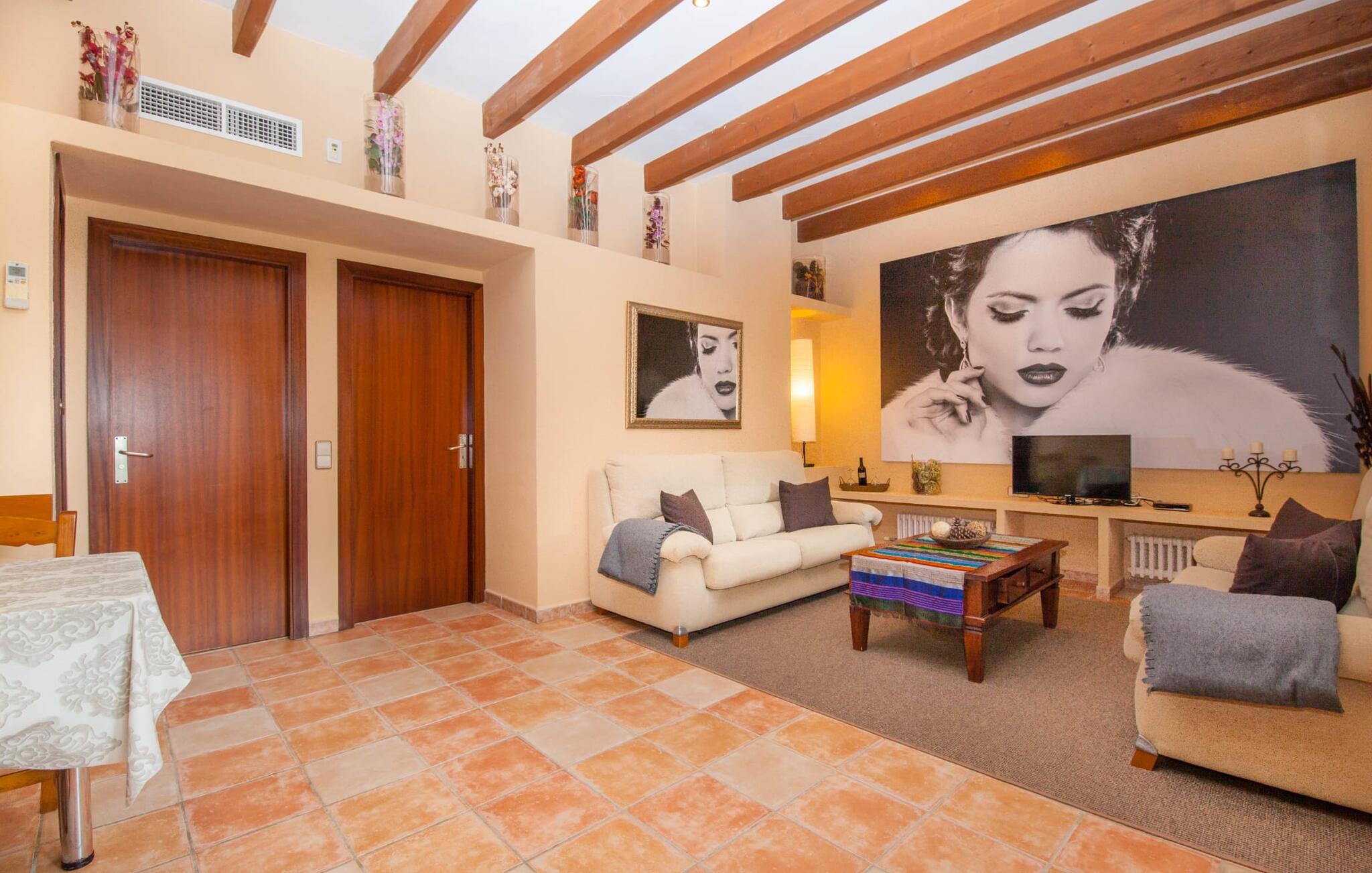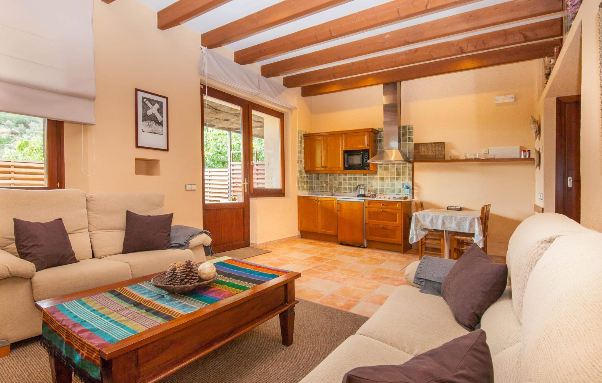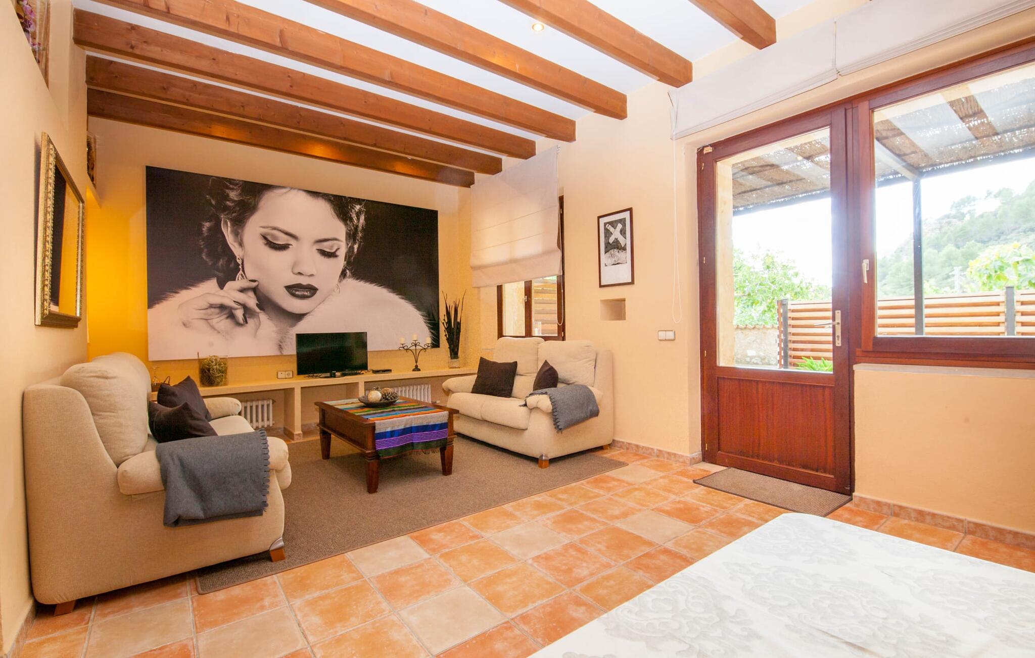 Steigende Buchungszahlen sind der Beweis dafür, dass Landurlaub auf Mallorca immer beliebter wird. Alle Agroturismo-Wohnungen auf dem Anwesen wurden komplett renoviert und neu möbliert. Dennoch ist der traditionelle Charakter immer noch spürbar, allerdings gepaart mit einem Hauch von Extravaganz. „Alfabia Nou Uno“ verfügt über ein gemütliches Wohnzimmer mit Sofas, Esstisch und integrierter Küchenzeile; Der Raum mit hohen Decken und hölzernen Dachbalken wird von einem übergroßen Frauenporträt dominiert und verspricht eine glamouröse Urlaubszeit zwischen diesen vier Wänden. Zwei Kochplatten und eine Mikrowelle erleichtern die Selbstversorgung zwischendurch, wobei es in den Bergdörfern wie „Deià“ ausgezeichnete Restaurants mit regionaler Küche gibt. Ein funktional gestaltetes Doppelzimmer und ein liebevoll dekoriertes, modernes Badezimmer komplettieren die kleine Ferienwohnung: Wanderer und Mountainbiker werden die Badewanne besonders zu schätzen wissen, perfekt zum Entspannen nach einem anstrengenden Ausflug.