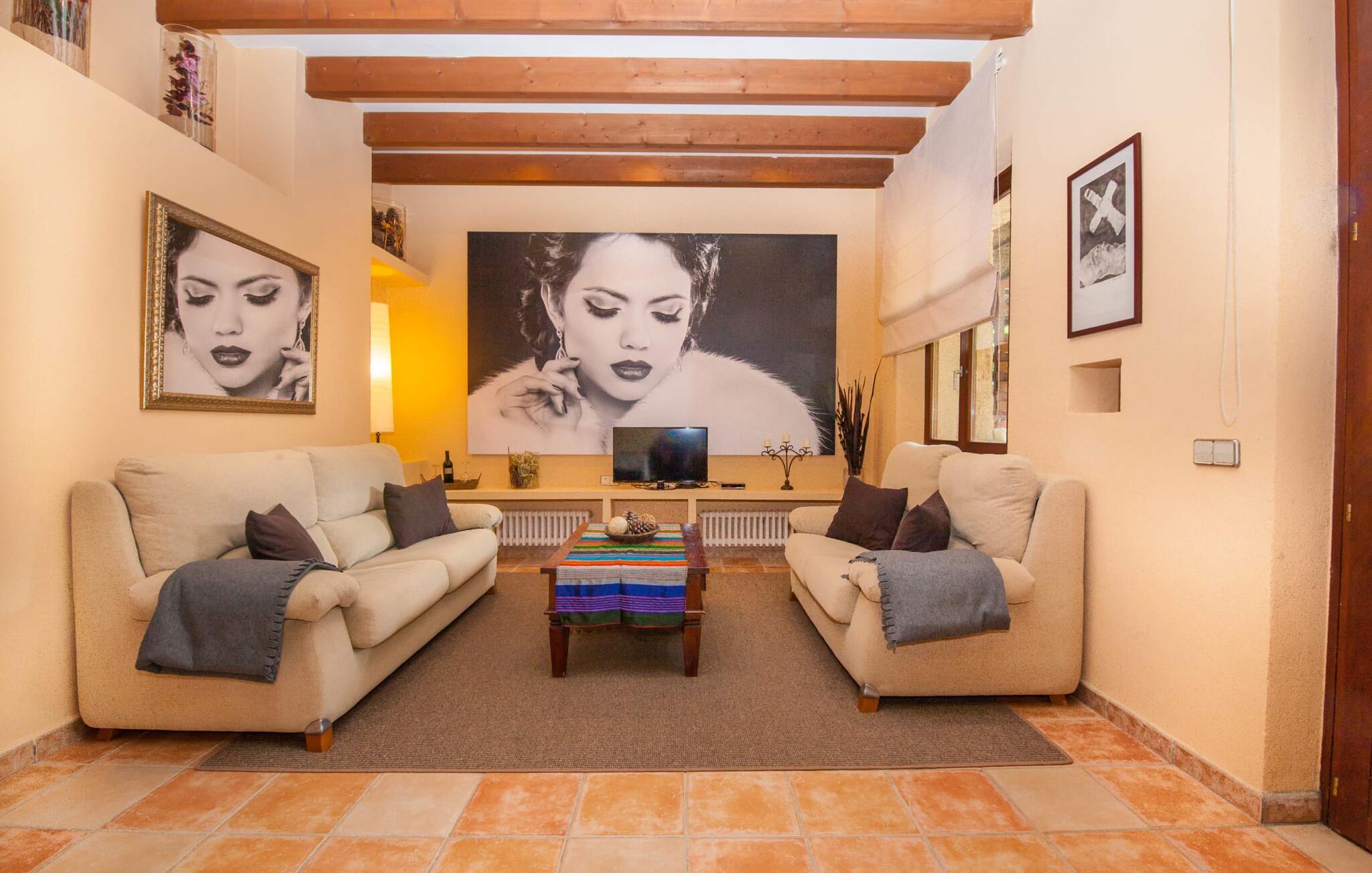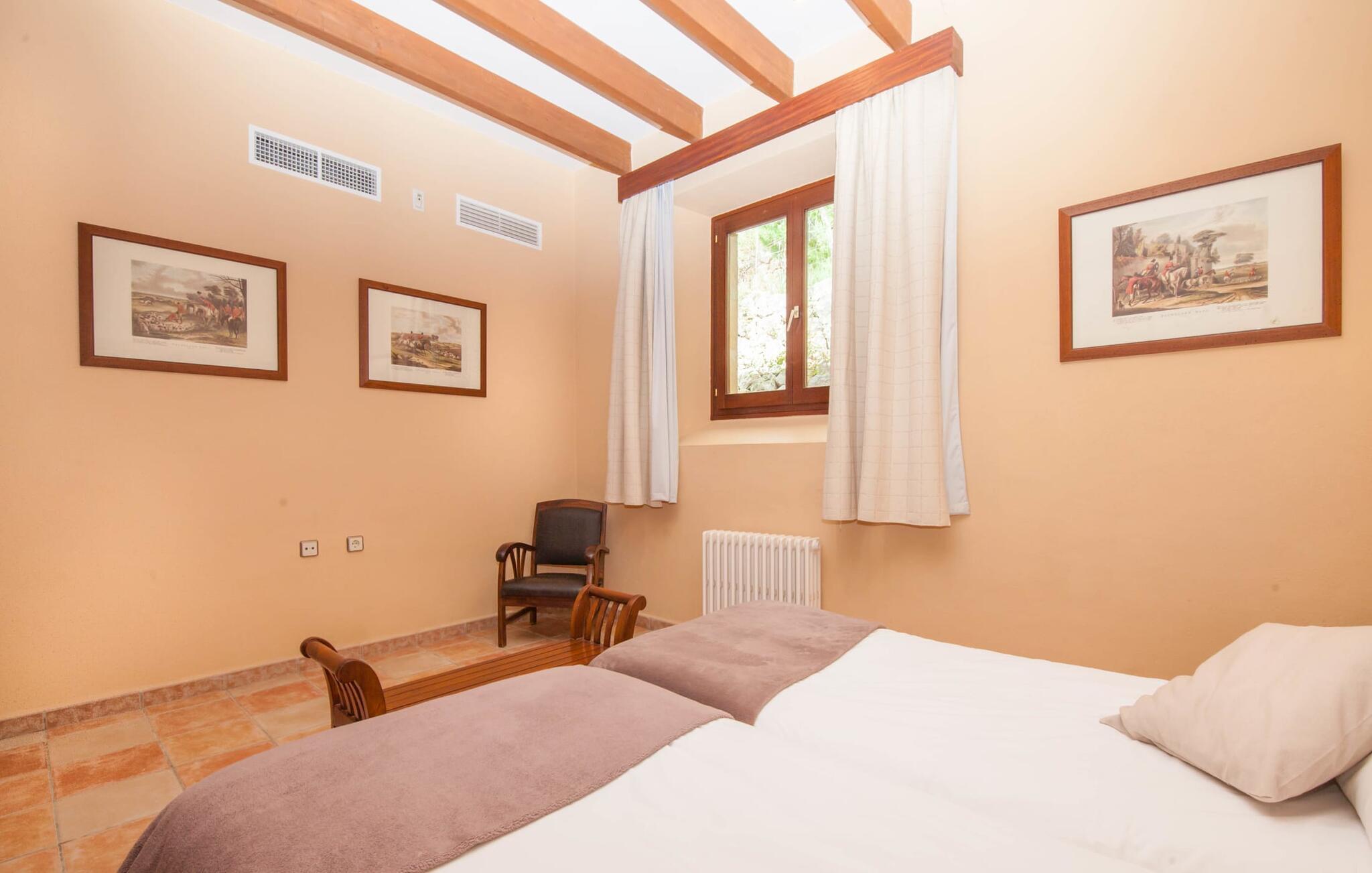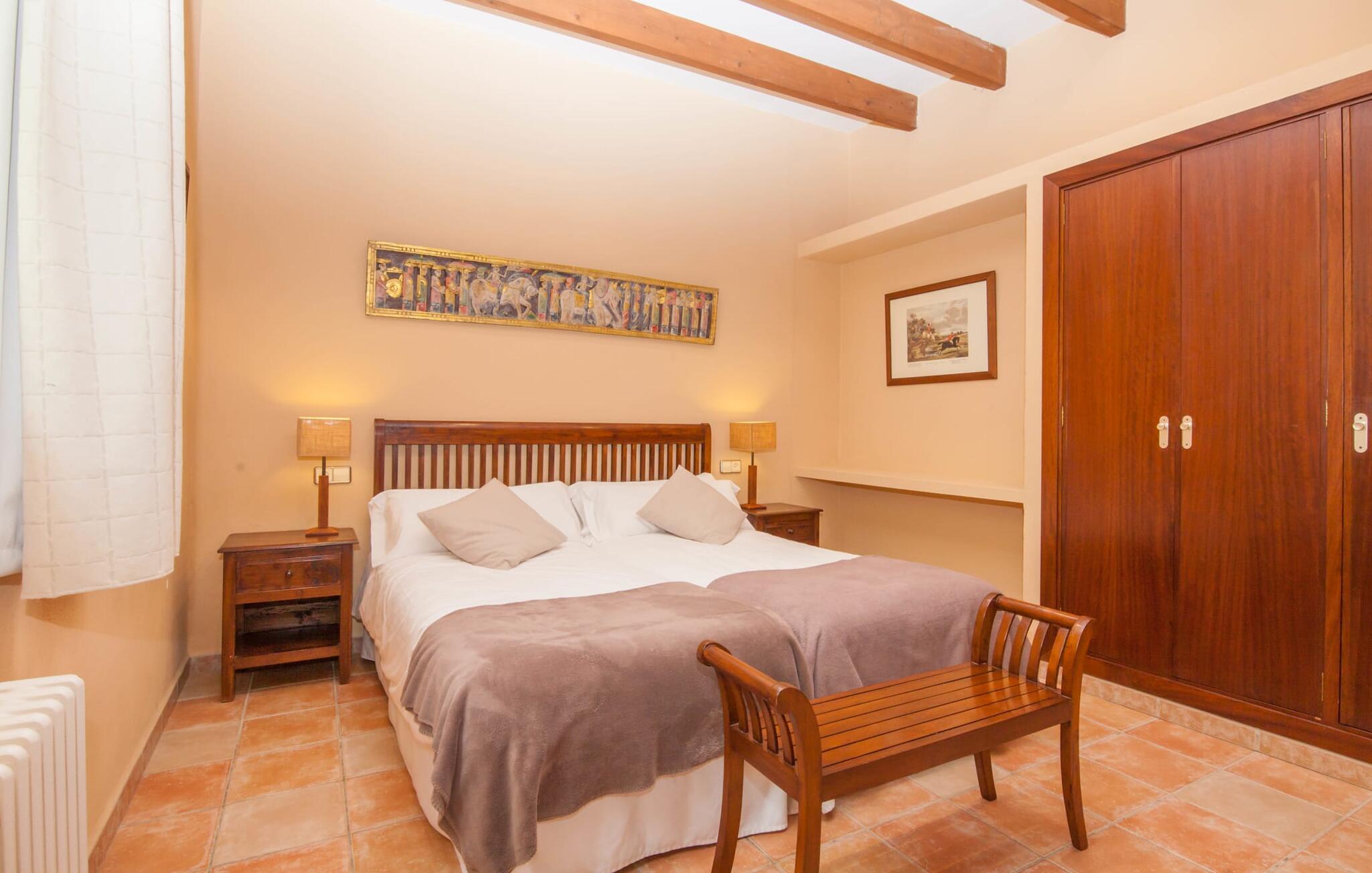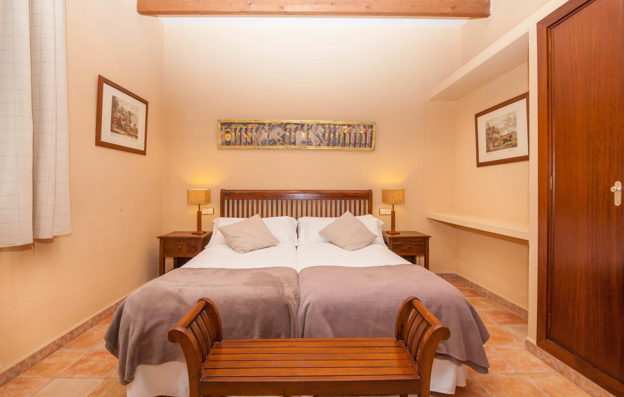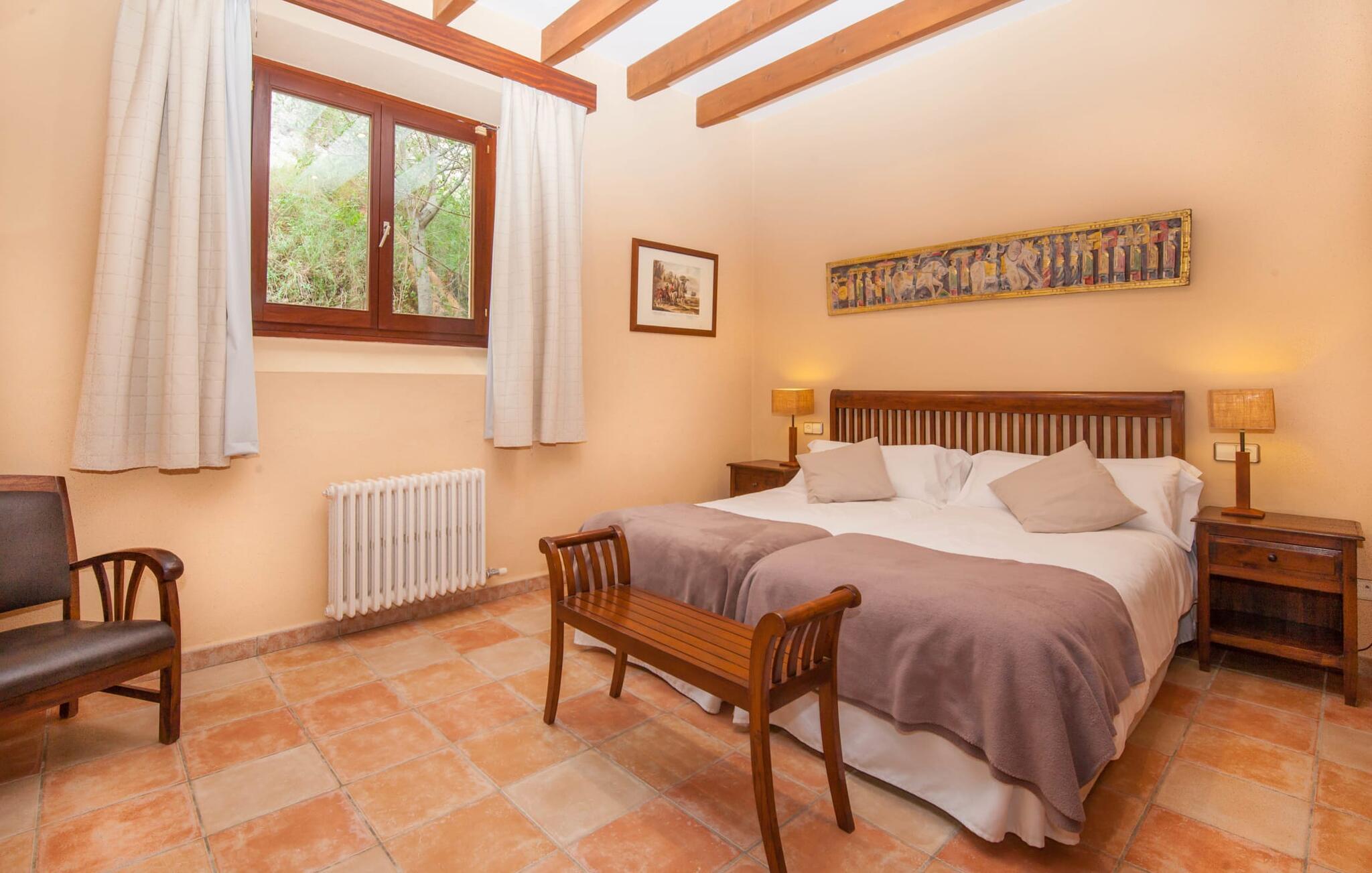 Steigende Buchungszahlen sind der Beweis dafür, dass Landurlaub auf Mallorca immer beliebter wird. Alle Agroturismo-Wohnungen auf dem Anwesen wurden komplett renoviert und neu möbliert. Dennoch ist der traditionelle Charakter immer noch spürbar, allerdings gepaart mit einem Hauch von Extravaganz. „Alfabia Nou Uno“ verfügt über ein gemütliches Wohnzimmer mit Sofas, Esstisch und integrierter Küchenzeile; Der Raum mit hohen Decken und hölzernen Dachbalken wird von einem übergroßen Frauenporträt dominiert und verspricht eine glamouröse Urlaubszeit zwischen diesen vier Wänden. Zwei Kochplatten und eine Mikrowelle erleichtern die Selbstversorgung zwischendurch, wobei es in den Bergdörfern wie „Deià“ ausgezeichnete Restaurants mit regionaler Küche gibt. Ein funktional gestaltetes Doppelzimmer und ein liebevoll dekoriertes, modernes Badezimmer komplettieren die kleine Ferienwohnung: Wanderer und Mountainbiker werden die Badewanne besonders zu schätzen wissen, perfekt zum Entspannen nach einem anstrengenden Ausflug.