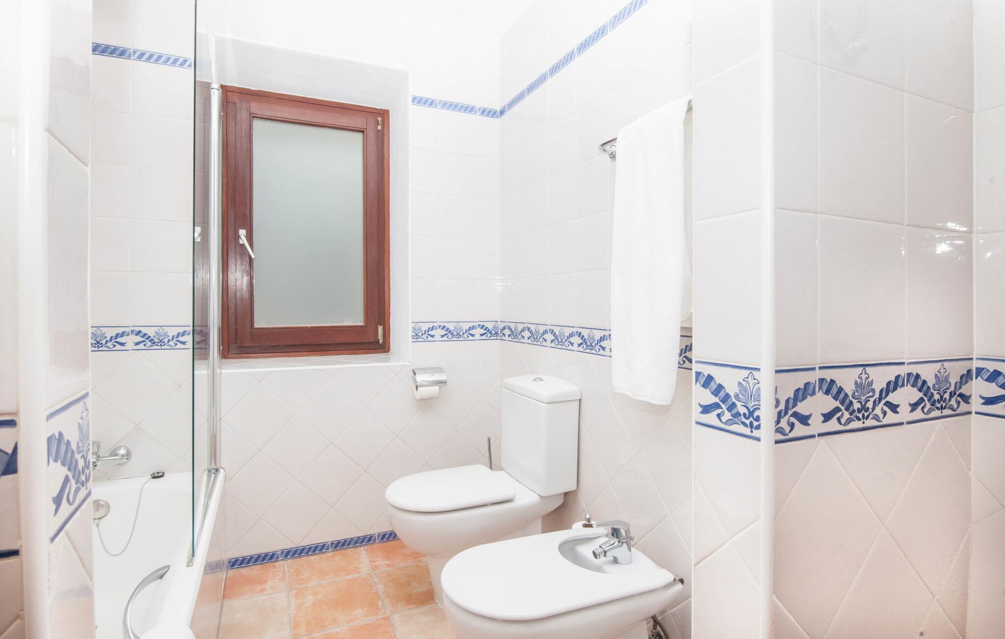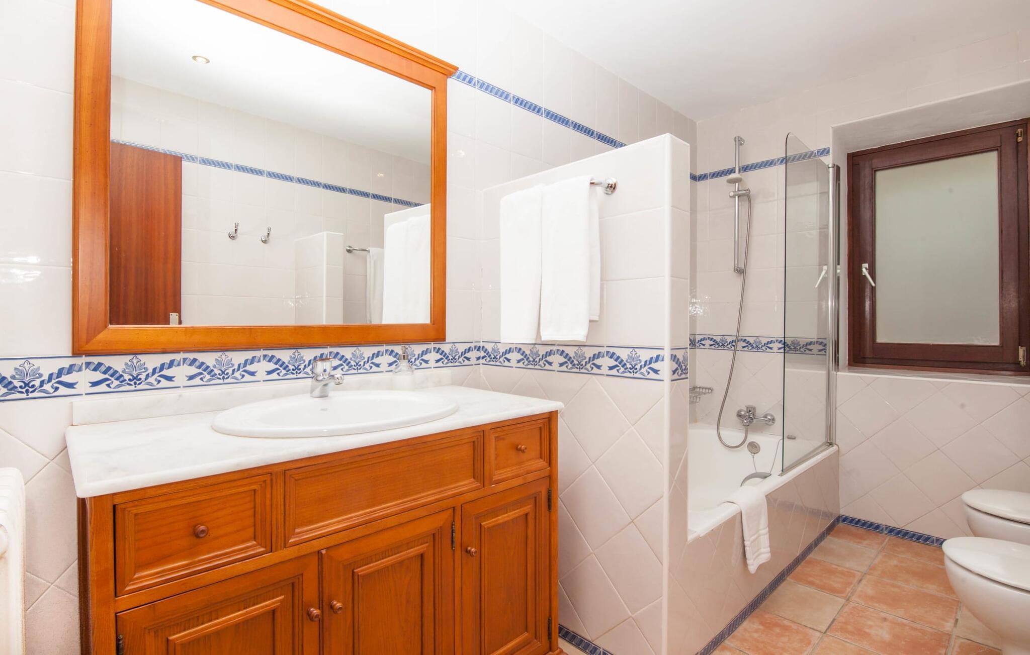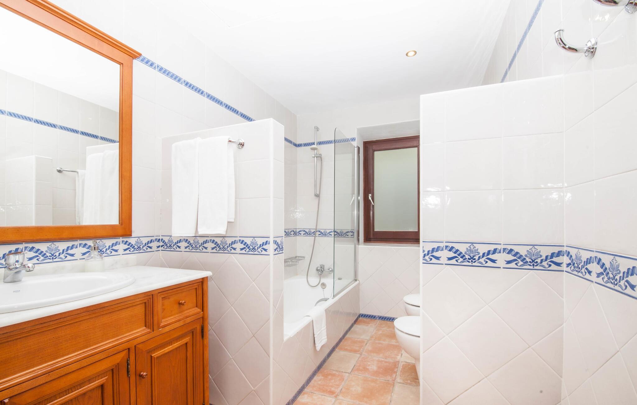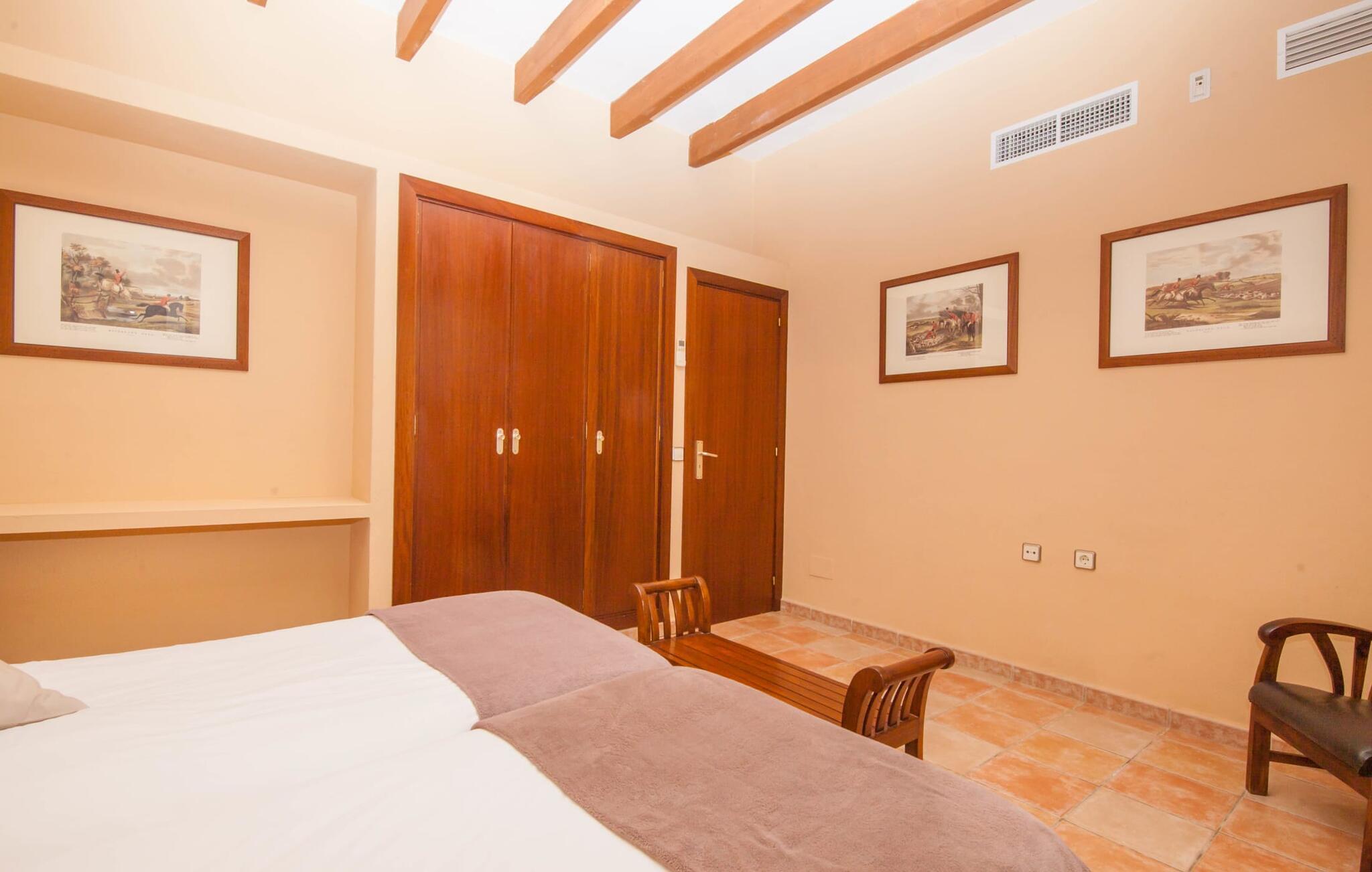 Steigende Buchungszahlen sind der Beweis dafür, dass Landurlaub auf Mallorca immer beliebter wird. Alle Agroturismo-Wohnungen auf dem Anwesen wurden komplett renoviert und neu möbliert. Dennoch ist der traditionelle Charakter immer noch spürbar, allerdings gepaart mit einem Hauch von Extravaganz. „Alfabia Nou Uno“ verfügt über ein gemütliches Wohnzimmer mit Sofas, Esstisch und integrierter Küchenzeile; Der Raum mit hohen Decken und hölzernen Dachbalken wird von einem übergroßen Frauenporträt dominiert und verspricht eine glamouröse Urlaubszeit zwischen diesen vier Wänden. Zwei Kochplatten und eine Mikrowelle erleichtern die Selbstversorgung zwischendurch, wobei es in den Bergdörfern wie „Deià“ ausgezeichnete Restaurants mit regionaler Küche gibt. Ein funktional gestaltetes Doppelzimmer und ein liebevoll dekoriertes, modernes Badezimmer komplettieren die kleine Ferienwohnung: Wanderer und Mountainbiker werden die Badewanne besonders zu schätzen wissen, perfekt zum Entspannen nach einem anstrengenden Ausflug.