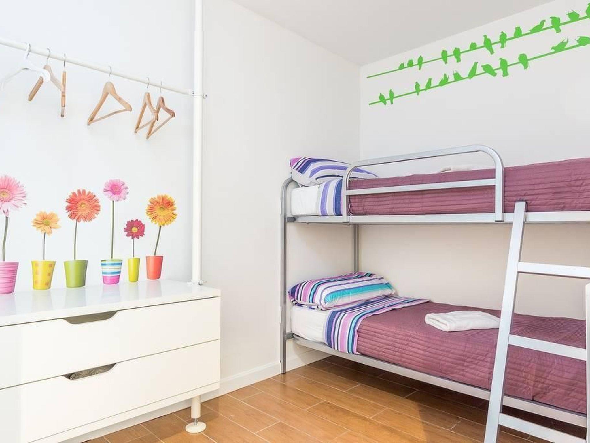 Die Wohnung verfügt über 2 Schlafzimmer. Das Hauptschlafzimmer, mit Kingsize-Bett, zur Straße hin (eine sehr kleine und ruhige Straße) und das zweite Schlafzimmer mit Etagenbetten ist auch ein Innenraum und ruhiges Schlafzimmer, mit zwei Etagenbetten. Ein Wohnzimmer mit offener Küche, Esszimmer und Wohnzimmer mit Blick auf den schönen Garten mit privatem Swimmingpool (Wasser ist nicht beheizt).