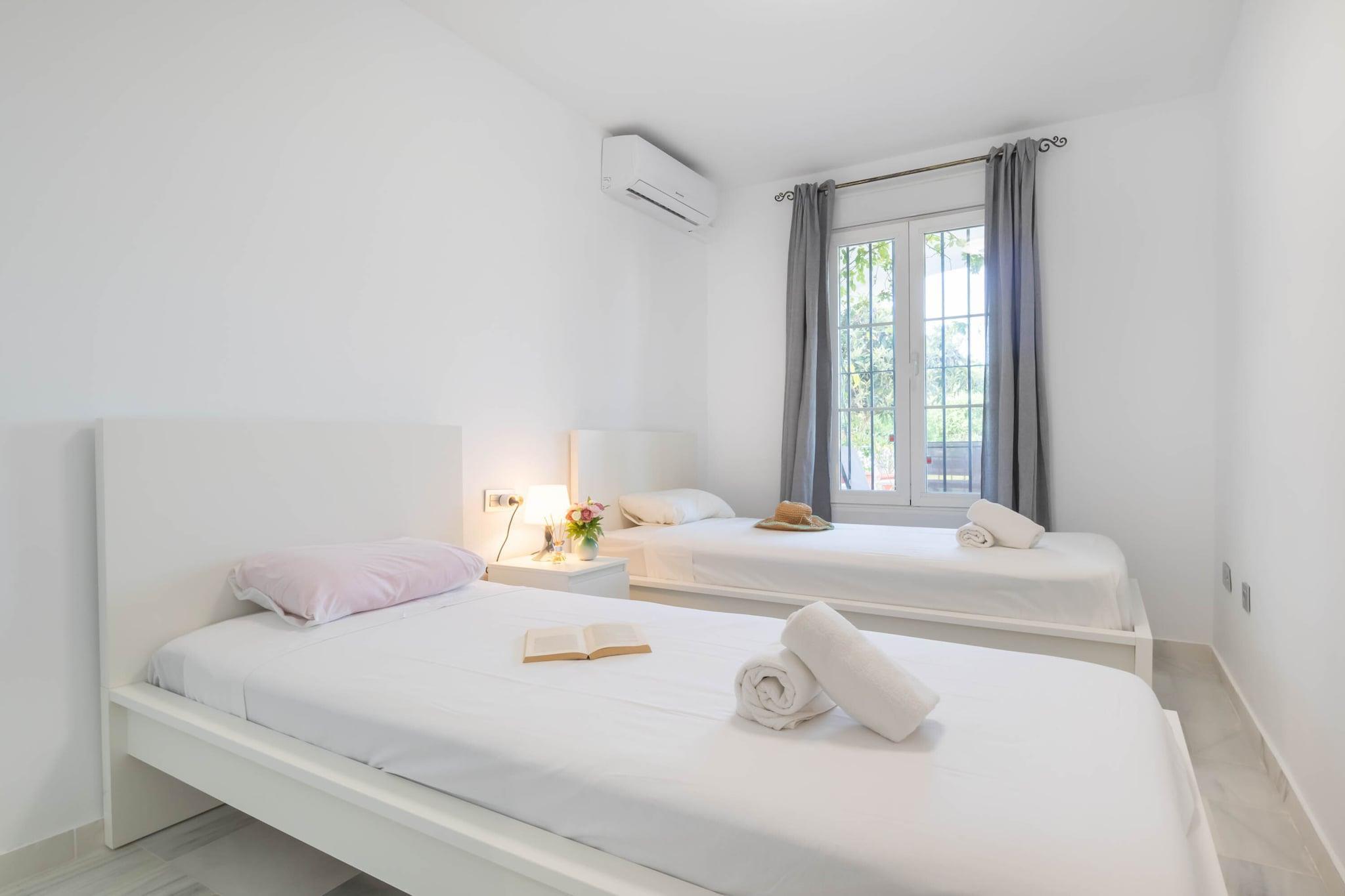 Wohnzimmer(TV, Esstisch, Sitzecke, Klimaanlage), Küche(Herd, Wasserkocher, Toaster, Kaffeemaschine, Backofen, Mikrowelle, Kühl-/Gefrierkombination), Schlafzimmer(Doppelbett, Klimaanlage), Schlafzimmer(Einzelbett, Einzelbett, Klimaanlage), Badezimmer(Dusche, Toilette), Parkplatz, Balkon oder Terrasse, Pool(Gemeinschaftliche Nutzung mit anderen Gästen, im Garten), Handtücher/Bettwäsche (inklusive)