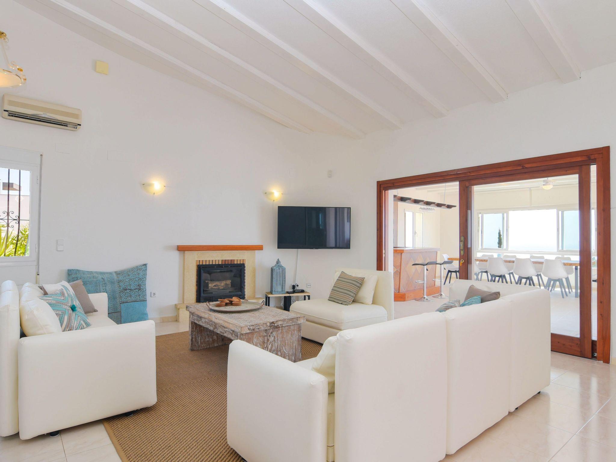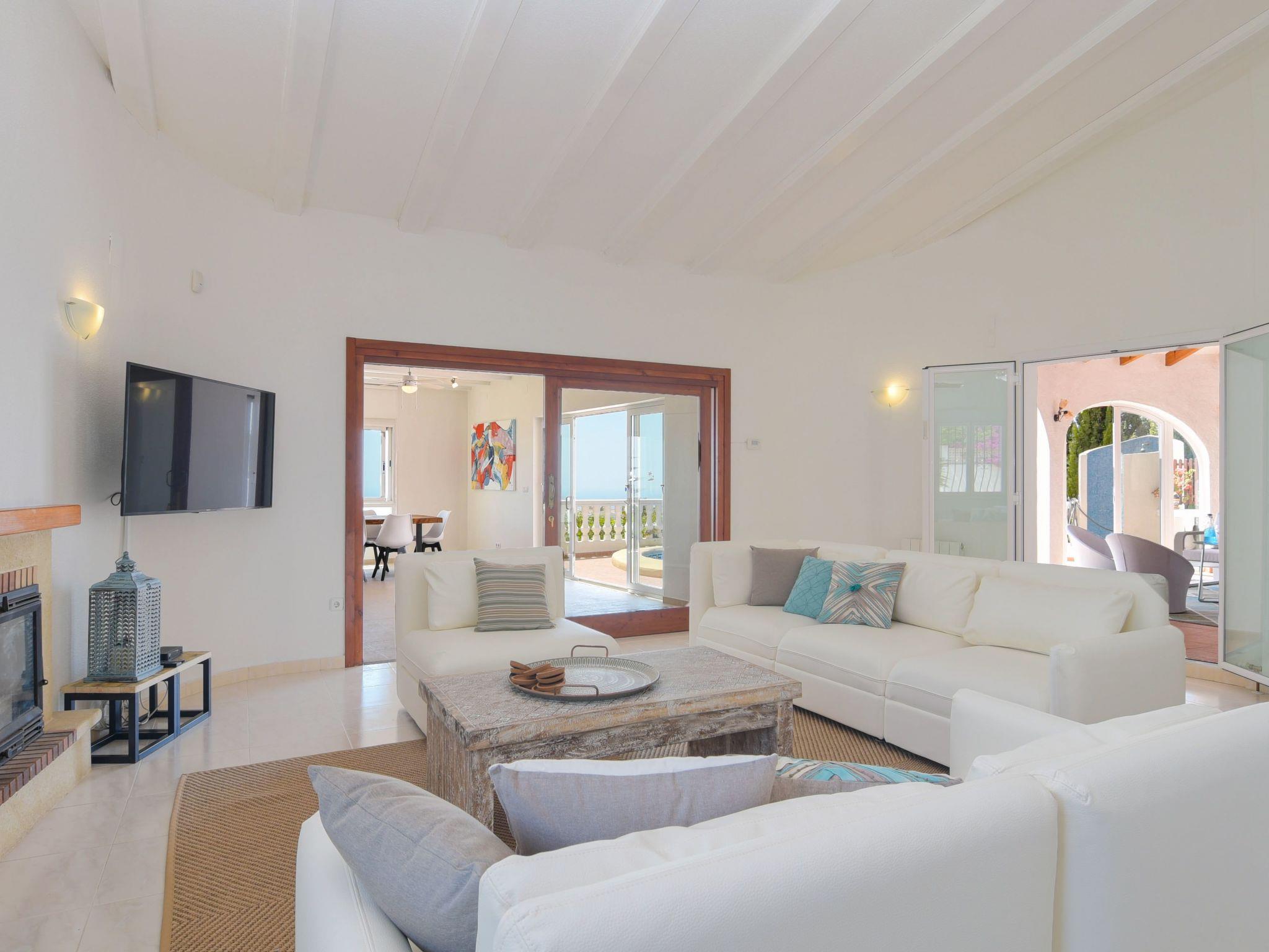Vom Esszimmer aus führen große Schiebetüren auf die Terrasse mit einem privaten Pool und einer Außendusche. Die Terrasse verfügt auch über eine traditionelle spanische "Naya", eine überdachte spanische Veranda, die mit dem Haus verbunden ist. Hier können Sie sich in einer gemütlichen Sitzecke im Schatten entspannen und gleichzeitig den atemberaubenden Blick auf den Pool und das Meer genießen. Es gibt auch einen Grill und einen großen Holztisch im Garten, ideal für Mahlzeiten im Freien.