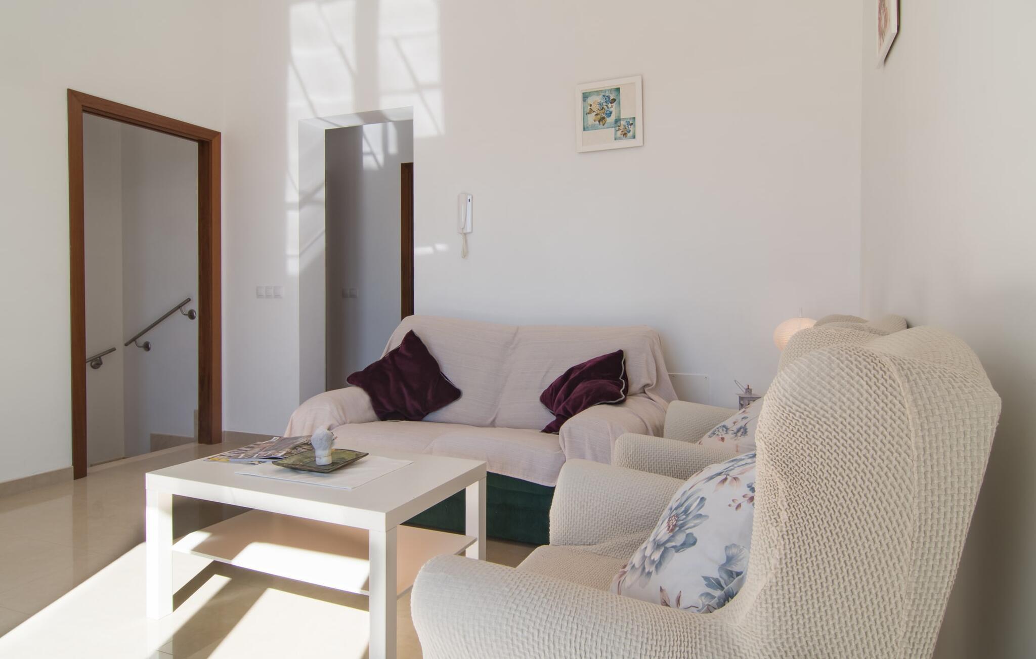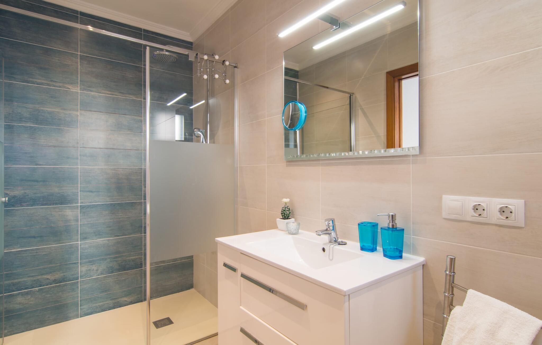 Die erste Dachterrasse liegt nur wenige Schritte vom Inneren der Villa entfernt. Der Ess- und Wohnbereich ist offen gestaltet und wirkt dank der beiden Türen, die viel Licht hereinlassen, sowie der weißen Wände modern und luftig. Die rustikale Holzküche in einem separaten Raum verfügt über einen großen amerikanischen Kühlschrank, sodass Sie ausreichend Platz für die Aufbewahrung Ihrer Köstlichkeiten vom Wochenmarkt haben. Das Schlafzimmer mit Doppelbett ist eine kleine, gemütliche Höhle mit einem großen Kleiderschrank, in dem Sie Ihre Kleidung bequem unterbringen können. Auf derselben Etage befindet sich ein Badezimmer mit Steinfliesen und einer geräumigen Dusche mit Glaswänden. Eine Treppe führt hinauf in eine weitere Etage. Es gibt auch Platz für ein kleines Wohnzimmer, in dem Sie in einem Sessel ein Buch genießen können. Darüber hinaus befinden sich auf dieser Etage weitere Schlafzimmer, die mit dem typisch mallorquinischen Flair ihrer Fensterläden aus Holz punkten. Kommoden bieten ausreichend Stauraum. Die Farben sind gut aufeinander abgestimmt und modern.