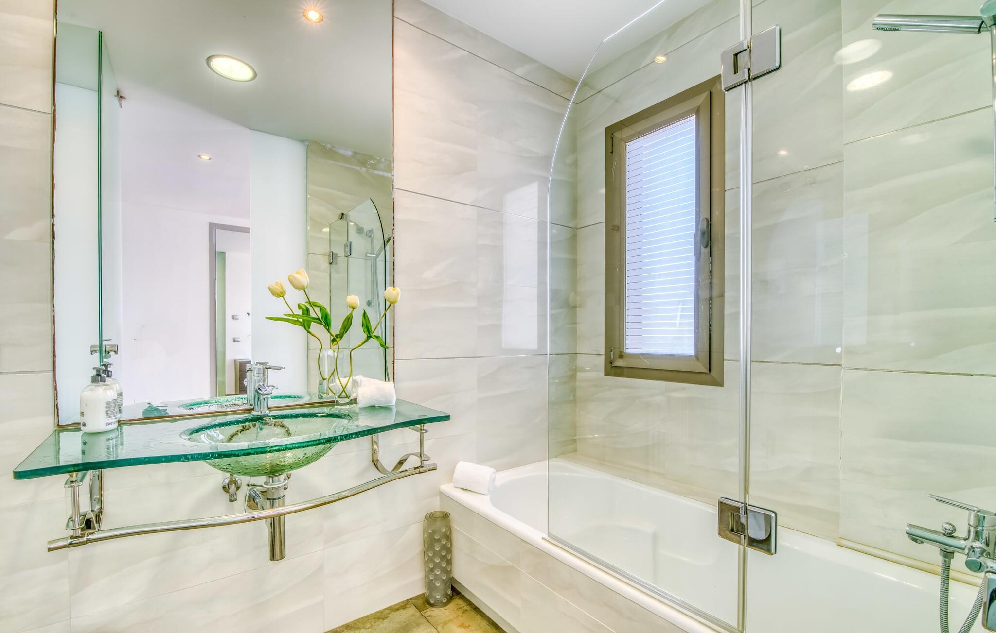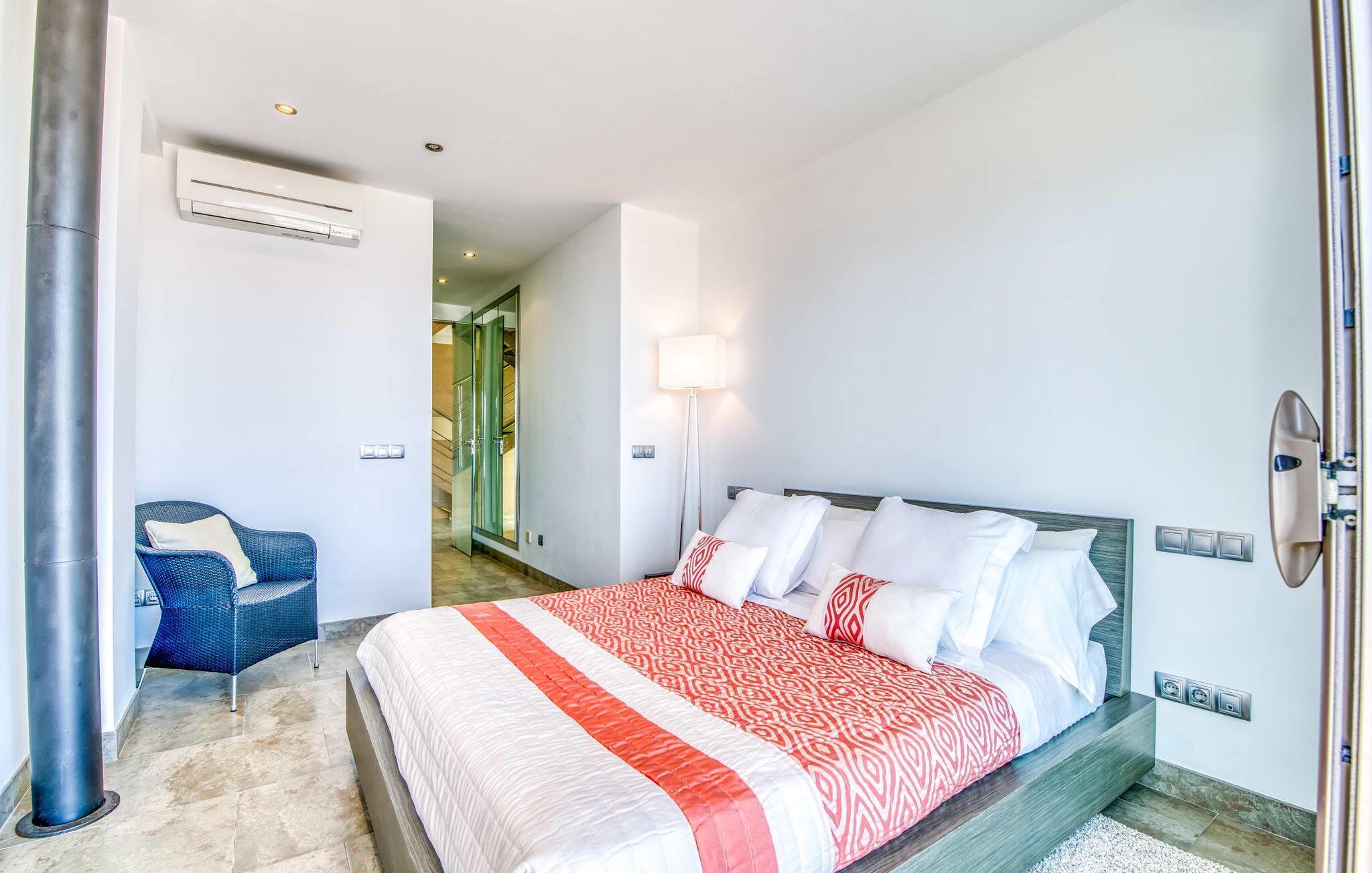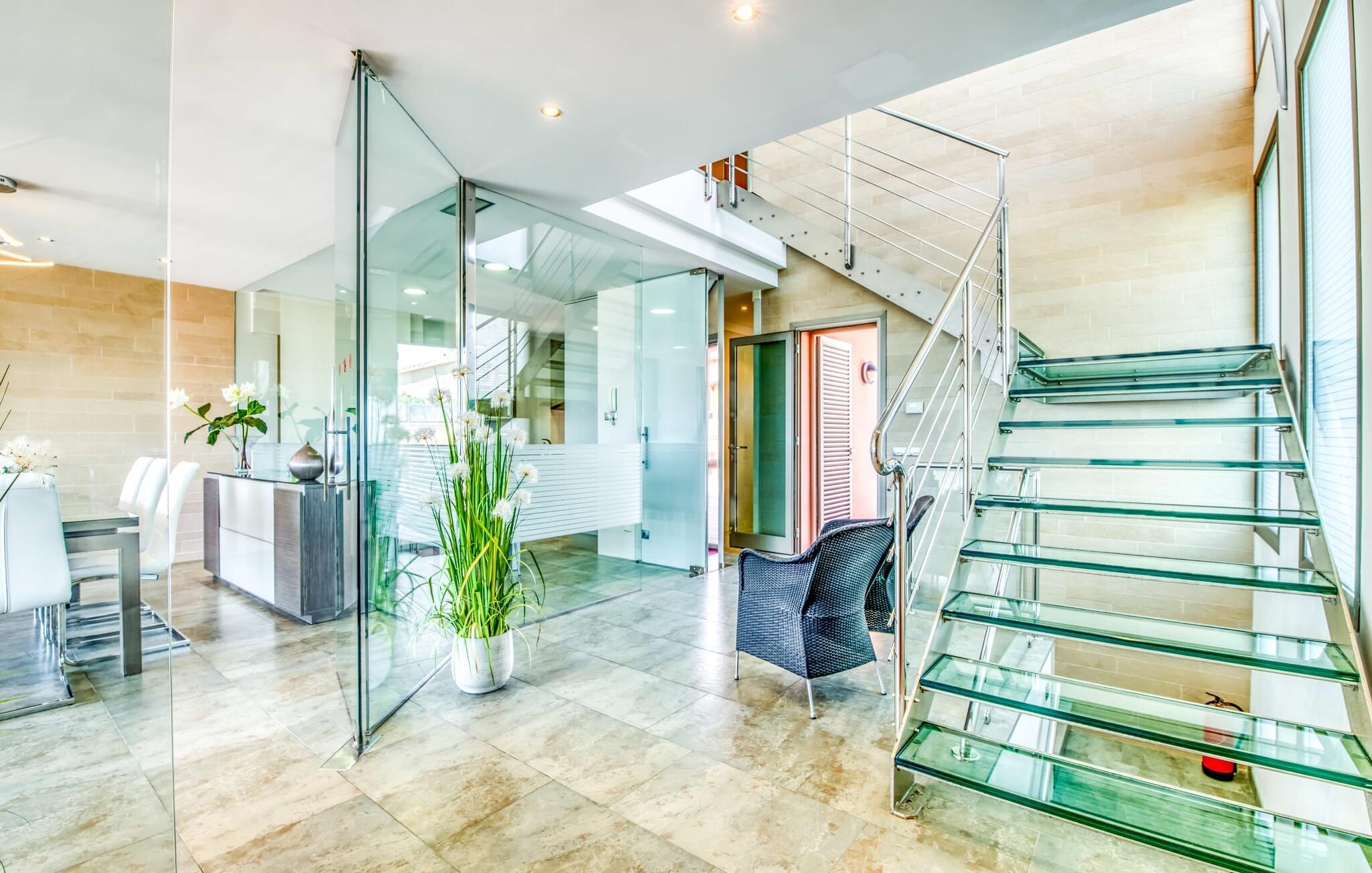Das Meer und einladende Bademöglichkeiten sind somit nicht weit – aber auch im hauseigenen Pool (nicht beheizbar) lässt sich köstliches Badevergnügen im Handumdrehen verwirklichen. Der große Säulenraum mit dem über eine Treppe erreichbaren langen Schwimmbecken und den blauen Mosaiksteinen wirkt fast wie eine kleine Badeanstalt. Außer, dass Sie hier uneingeschränkte Privatsphäre genießen. Viel Licht fällt durch bodentiefe Fenster in die elegant eingerichteten Räume, in denen ein moderner, angenehm kühler Stil vorherrscht. Wohn- und Essbereich sind zueinander offen und die trendige, luxuriöse, voll ausgestattete Küche nebenan bietet einen weiteren Essbereich sowie direkten Zugang nach draußen. Durch die Glaselemente zwischen Wohnzimmer und Küche entsteht ein sehr charmanter Großzügigkeitseffekt. Ein Badezimmer vervollständigt das Erdgeschoss. Eine schicke Glastreppe führt in die nächste Etage, wo sich geräumige, geschmackvoll eingerichtete Schlafzimmer – teilweise mit herrlichem Meerblick – sowie eigene Badezimmer befinden. Besonders großzügig ist das großzügig verglaste Schlafzimmer im 2. Obergeschoss. Hier ist sogar Platz für eine Sofazone. Ein zusätzlicher Balkon mit tollem Blick auf das Meer und ein Badezimmer en Suite runden diese Wohnebene ab. „Bohemi“, das für Body, Health, Mind steht, macht seinem Namen alle Ehre, indem es seinen Gästen in jeder Hinsicht höchsten Komfort bei perfekter Ästhetik bietet.
