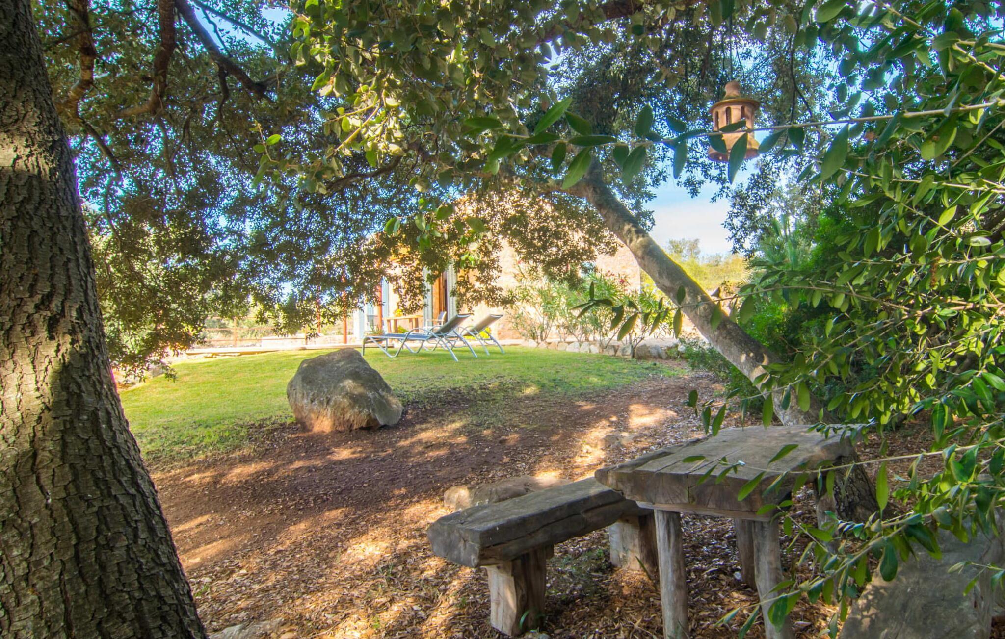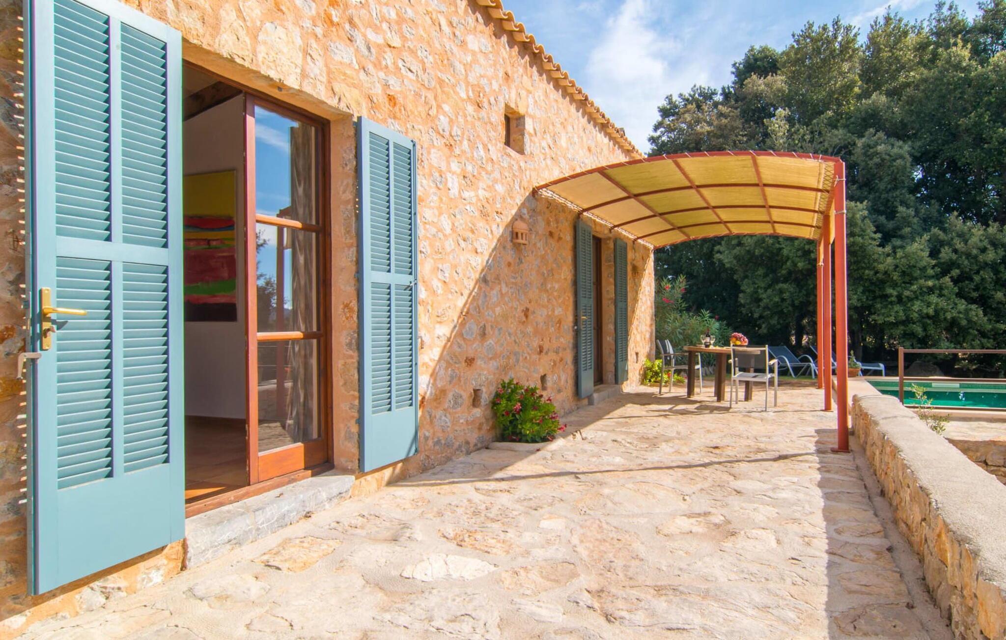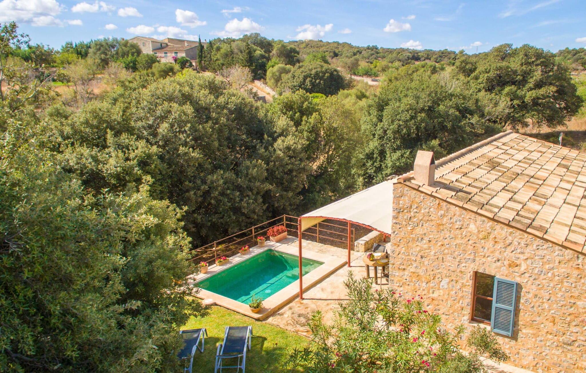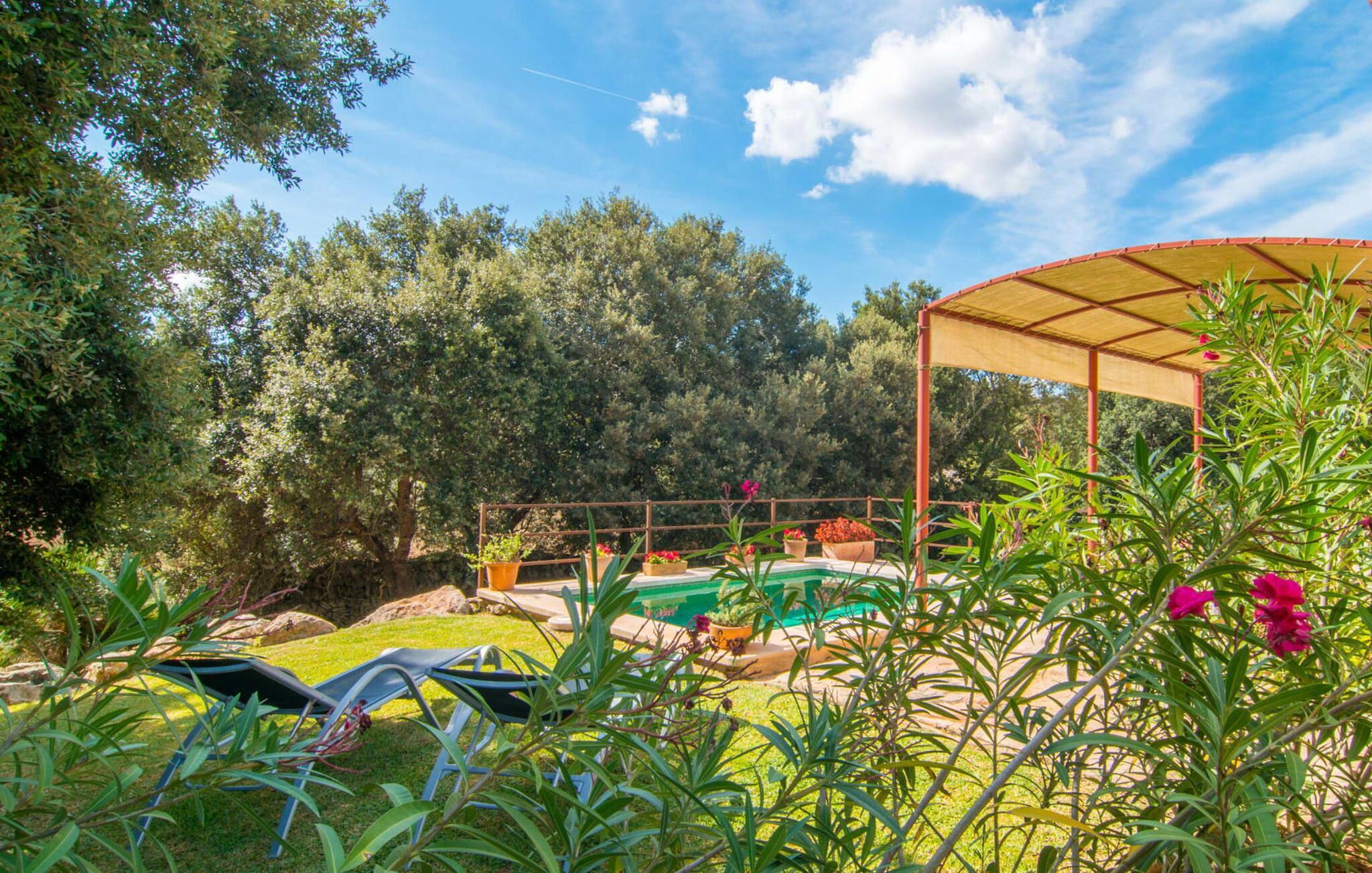 Es befindet sich auf einem 7.000 m² großen Grundstück und verfügt über einen großen Rasen und einen herrlichen mediterranen Garten mit duftenden Mandel-, Zitronen-, Orangen- und Feigenbäumen sowie Kakaobäumen. Die großzügige Steinterrasse, ausgestattet mit bequemen Gartenmöbeln und einem Sonnenschirm, eignet sich perfekt für gemütliche Morgen- und Abendstunden. Ein Pool mit grünen Mosaikfliesen und Stufen bietet eine erfrischende Flucht vor der warmen mallorquinischen Sonne.