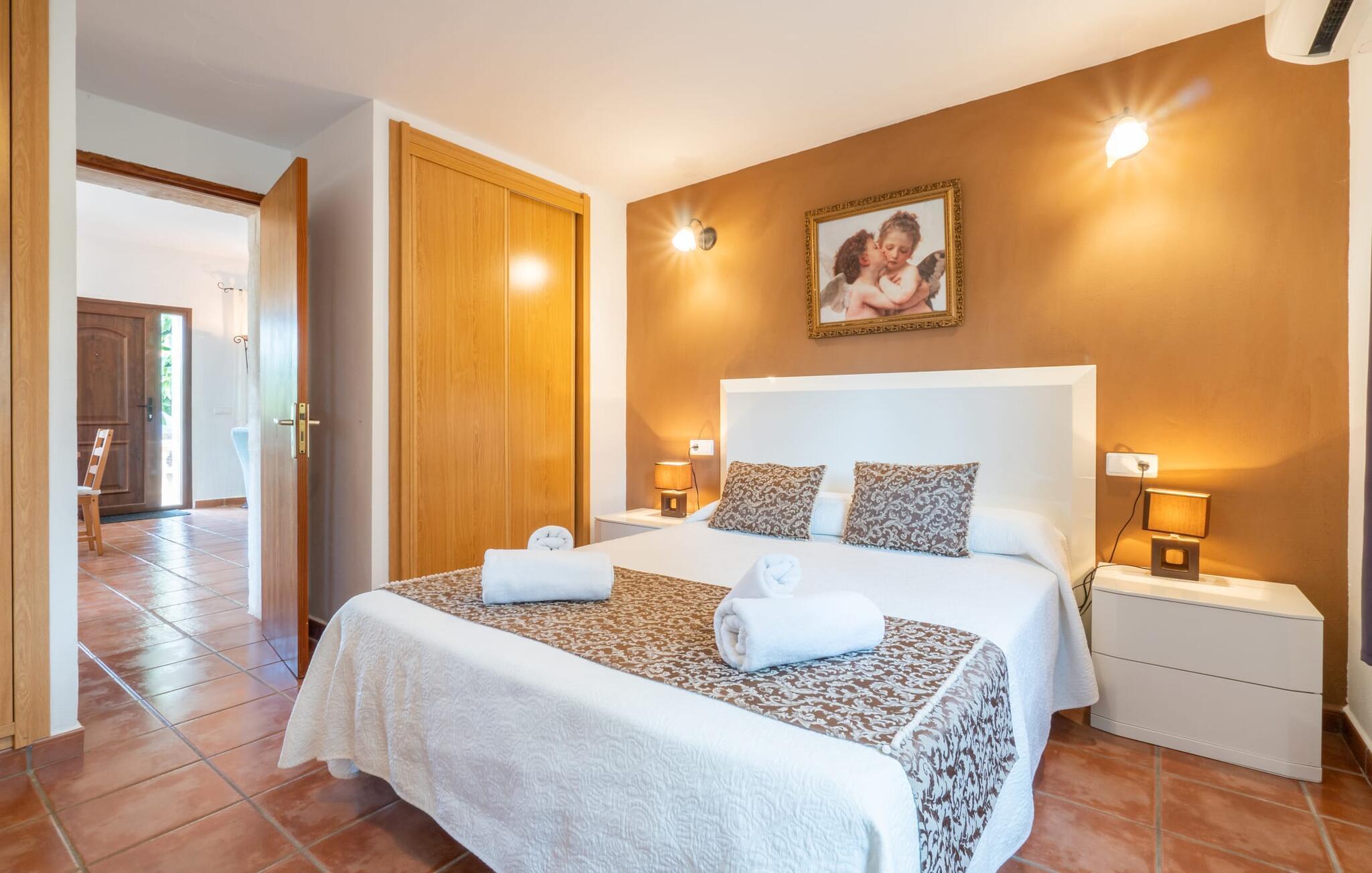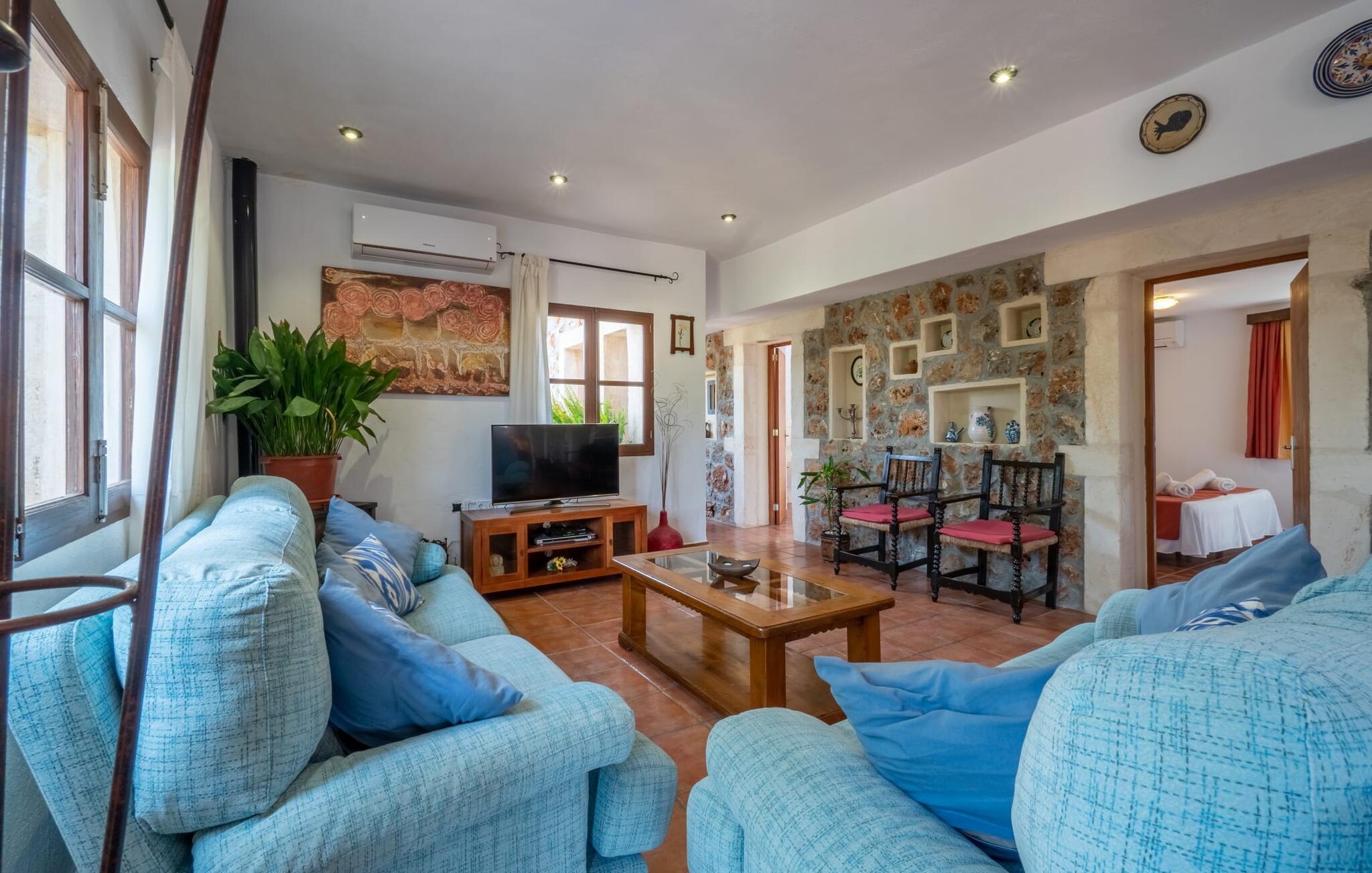Im Inneren bietet das große Wohn- und Esszimmer mit Holzofen und TV viel Gemütlichkeit, mit bequemen Möbeln, Terrakottafliesen, Natursteinelementen und mallorquinischen Accessoires. Ein weiterer Essbereich befindet sich praktischerweise neben der voll ausgestatteten Küche. Für erholsame Urlaubsnächte bietet das Mallorca-Bauernhaus „Ca Na Pepa“ vier angenehme Doppelzimmer. Zwei Badezimmer en Suite und ein WC runden den Wohnkomfort in diesem familienfreundlichen Domizil ab.