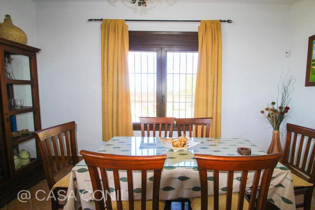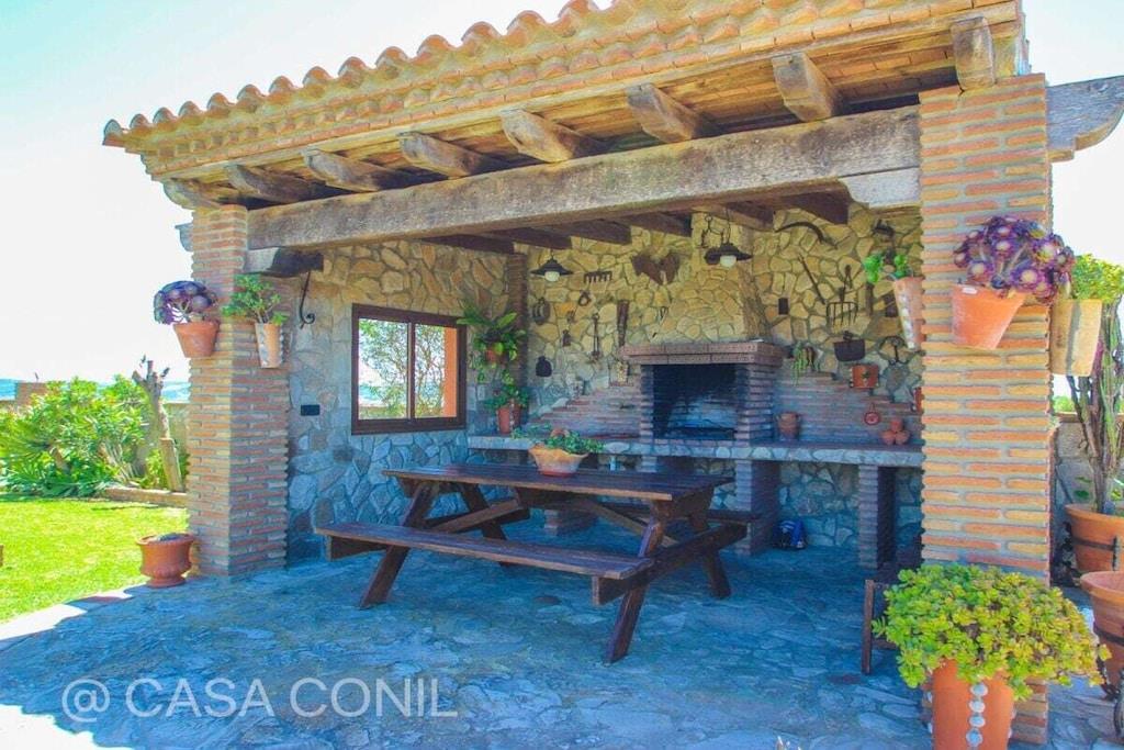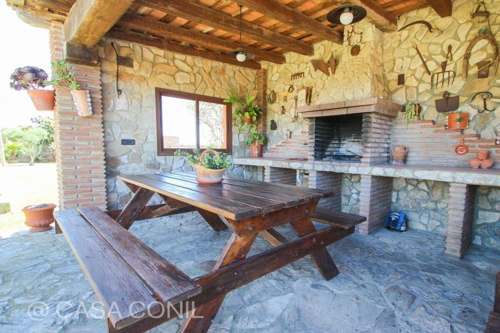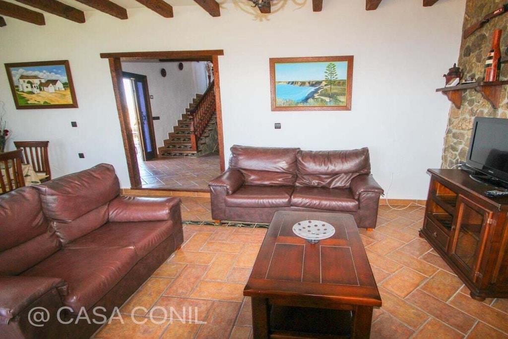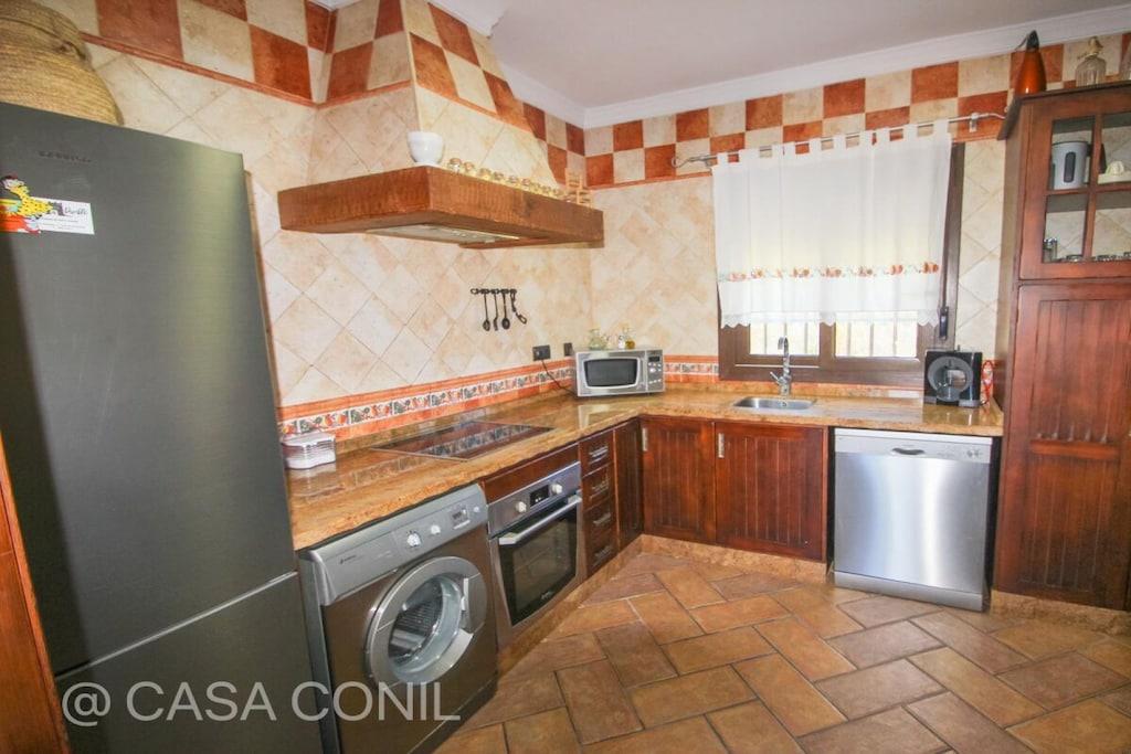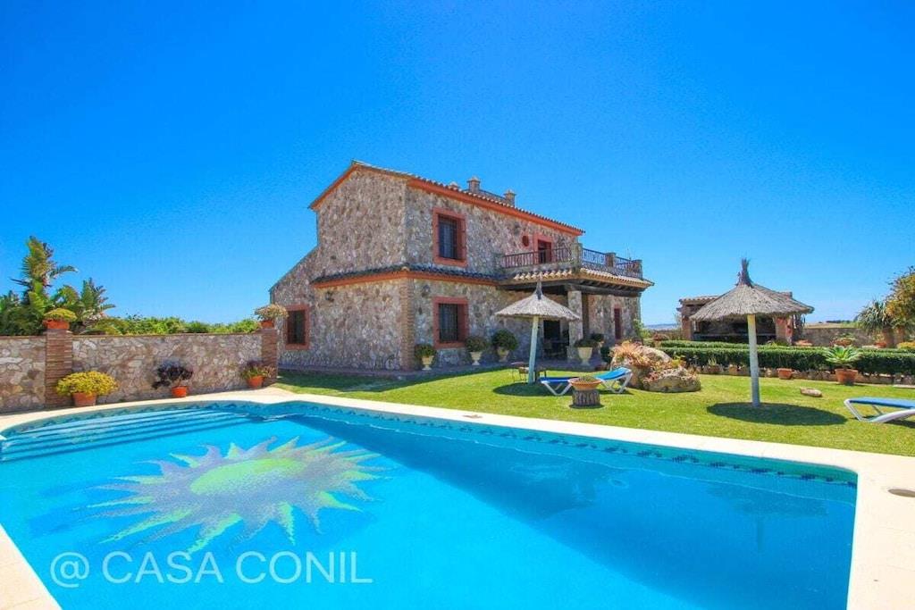 Diese schöne Villa im spanischen, rustikalen Stil ist sehr ruhig in den Hügeln vor Conil gelegen. Der ca.10 x 5m große Pool l ist von einem gepflegten Garten mit vielen mediterranen Pflanzen umgeben. Insgesamt ist das Grundstück etwa 1.200 qm groß. Die Villa bietet allen Komfort für bis zu 7-8 Personen: 4 große Schlafzimmer: zwei mit je zwei Einzelbetten 0,90 cm breit, eines mit Einzelbett und evtl. Zustellbett, eines mit Doppelbett mit anschließendem großen Aussichtsbalkon mit Tisch und Stühlen. Es sind je 2 Schlafzimmer im ersten und im zweiten Stock vorhanden, sodass die Villa hervorragend – auch aufgrund der Größe von 170 qm - für den Urlaub mit zwei befreundeten Familien geeignet ist. Im oberen Stockwerk befinden sich zwei schöne Balkone; zur Sonnenaufgangs- und zur Sonnenuntergansseite des Hauses, die je ca. 14 qm groß sind. Einer verfügt über eine Treppe zur kleinen Aussichtsterrasse des Hauses, von der aus der Blick noch beeindruckender ist. Der mit Natursteinen und Holzbalken gestaltete Porche sowie die Eingangshalle und der Treppenbereich des Hauses ist besonders prachtvoll - es wurde auf jedes Ausstattungsdetail wie beleuchtete Bepflanzung und andalusische Ornamente geachtet. Im Salon befindet sich ein schöner Kamin, zwei Sofas, ein Esstisch mit 8 Stühlen und TV mit internationalen Programmen. Die Küche ist komplett ausgestattet mit besten Geräten: Waschmaschine, Spülmaschine, Mikrowelle, Herd mit Cerankochfeld und Backofen, Kaffeemaschine und vielem mehr. In jedem Stockwerk befindet sich ein sehr schönes Bad, unten mit großer Eckbadewanne. Número de registro turistico: CTC-2023144478