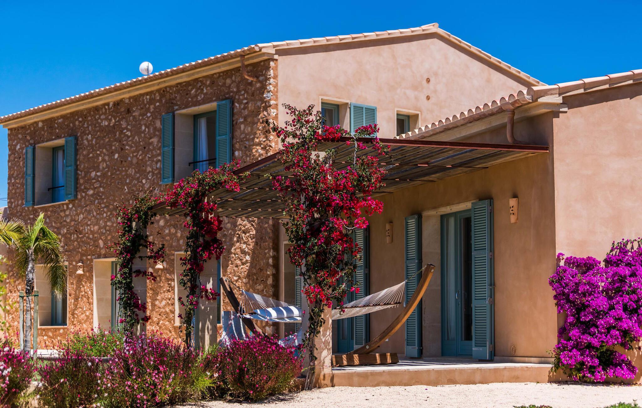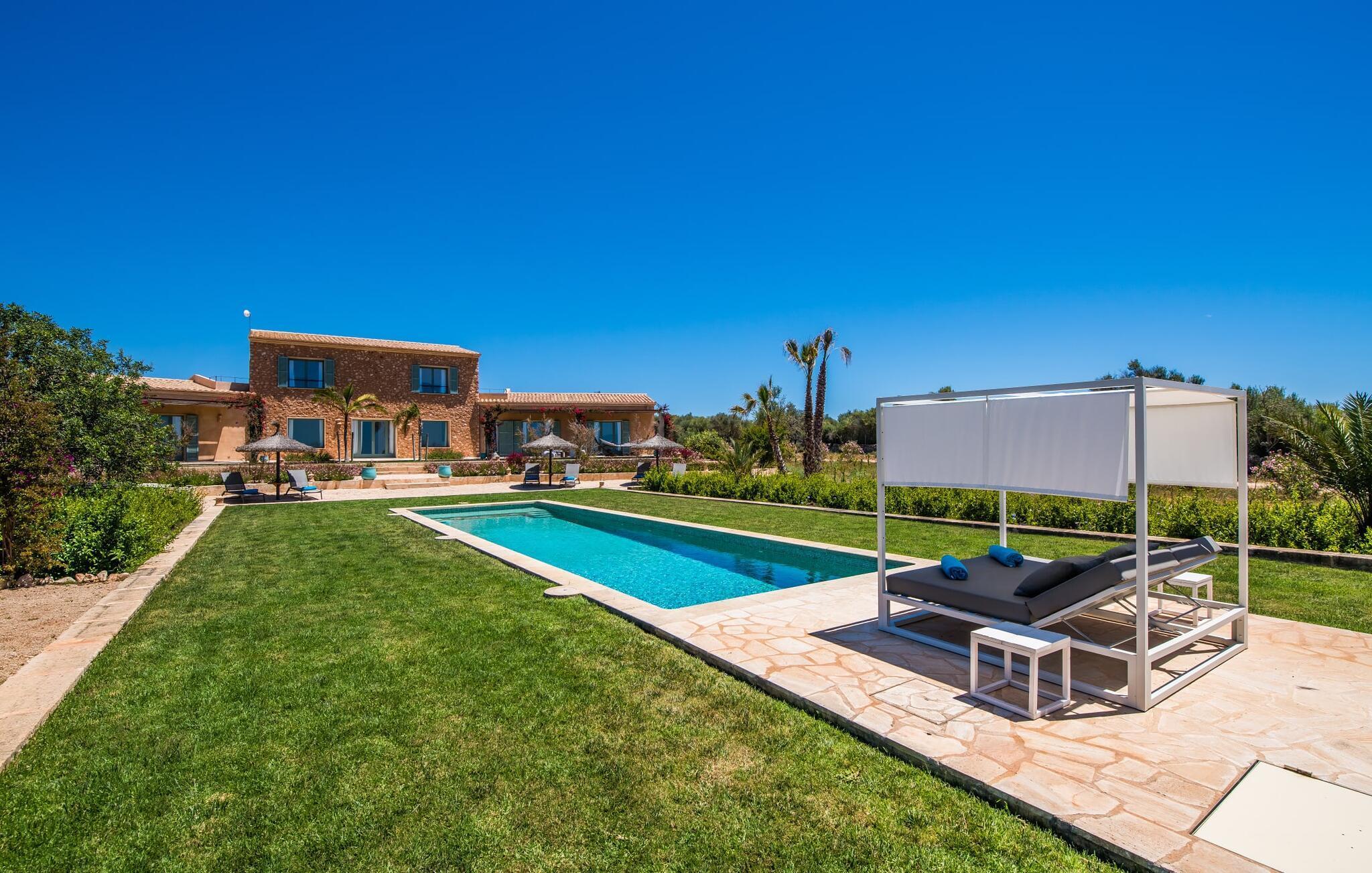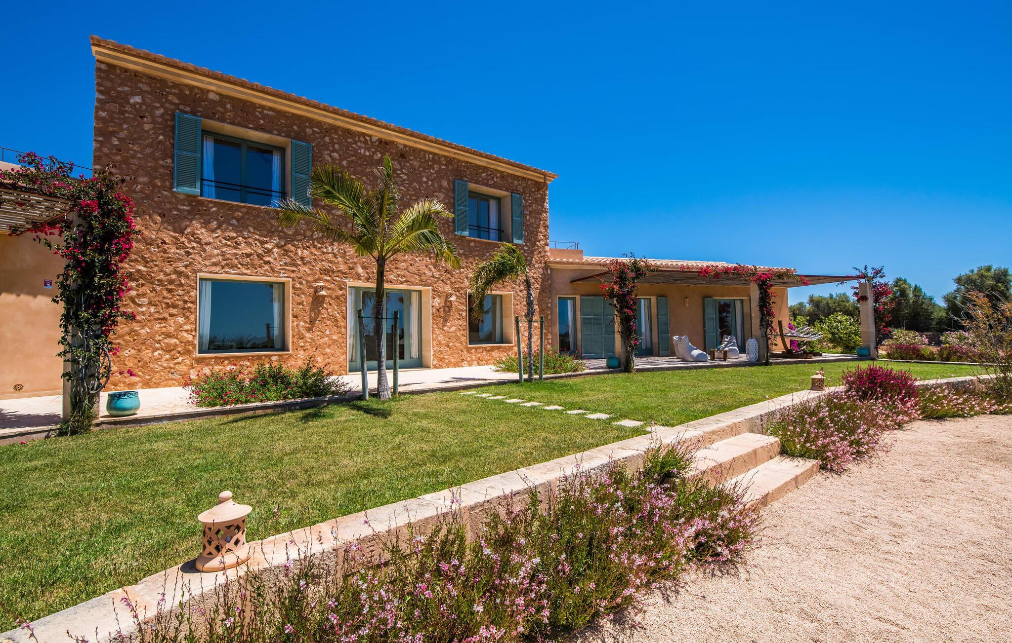 Malerisch und friedvoll gelegen ist dieses Finca-Schmuckstück mit dem idyllischen Namen, das sich in mediterraner Bauweise und mit viel Glas im Süden Mallorcas in die Sonne legt – so können Sie Ruhe und Privatsphäre so richtig genießen. Der langgestreckte Fitnesspool mit Sonnenliegen und Relaxbett verbindet sich mit dem zweistöckigen Hauptgebäude und seinen beiden Flügeln zu einem Pfeil und trifft zielsicher den Nerv von Gästen, die sich die Inselzeit mit luxuriösem Komfort versüßen wollen. Allein schon die umlaufende Bruchsteinterrasse mit ihrer luftigen Holzüberdachung, den hochwertigen Loungemöbeln und dem weiten Blick in die Landschaft macht "El Idilio" zu einem Vorzeigeobjekt, das Begeisterung weckt. Die Finca bietet viel Platz, um als Familie oder Gruppe, paarweise oder auch ganz für sich Zeit zu verbringen und Geselligkeit mit Rückzug und Tiefenentspannung zu verbinden. Auf Wunsch und gegen Gebühr werden außerdem Catering, Eventplanung, Fahrradverleih, Taxiservice, Beautybehandlungen und Restaurantreservierungen organisiert.