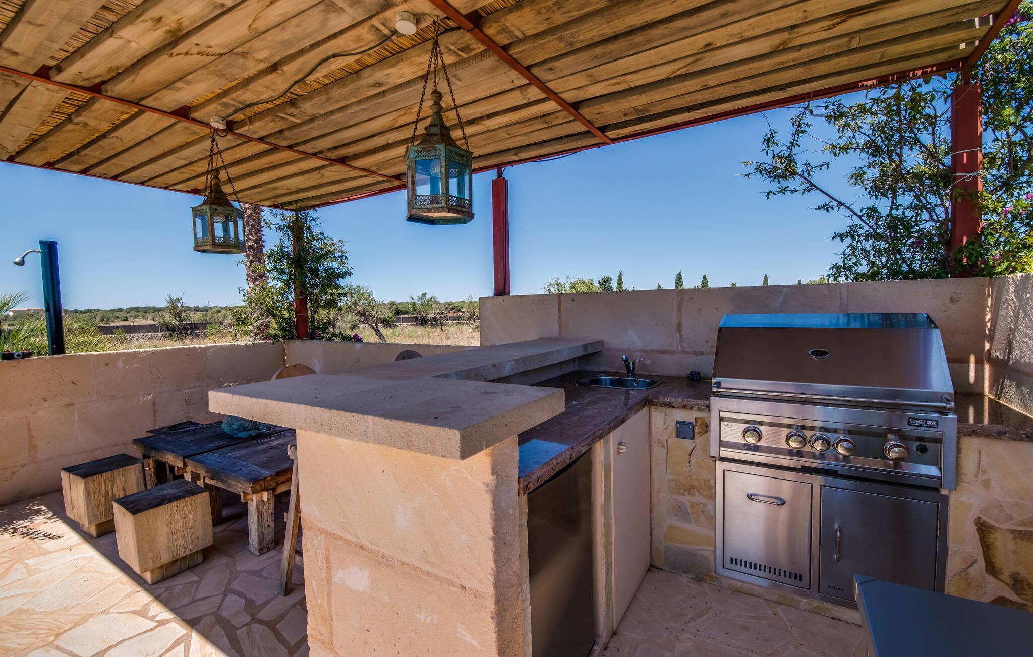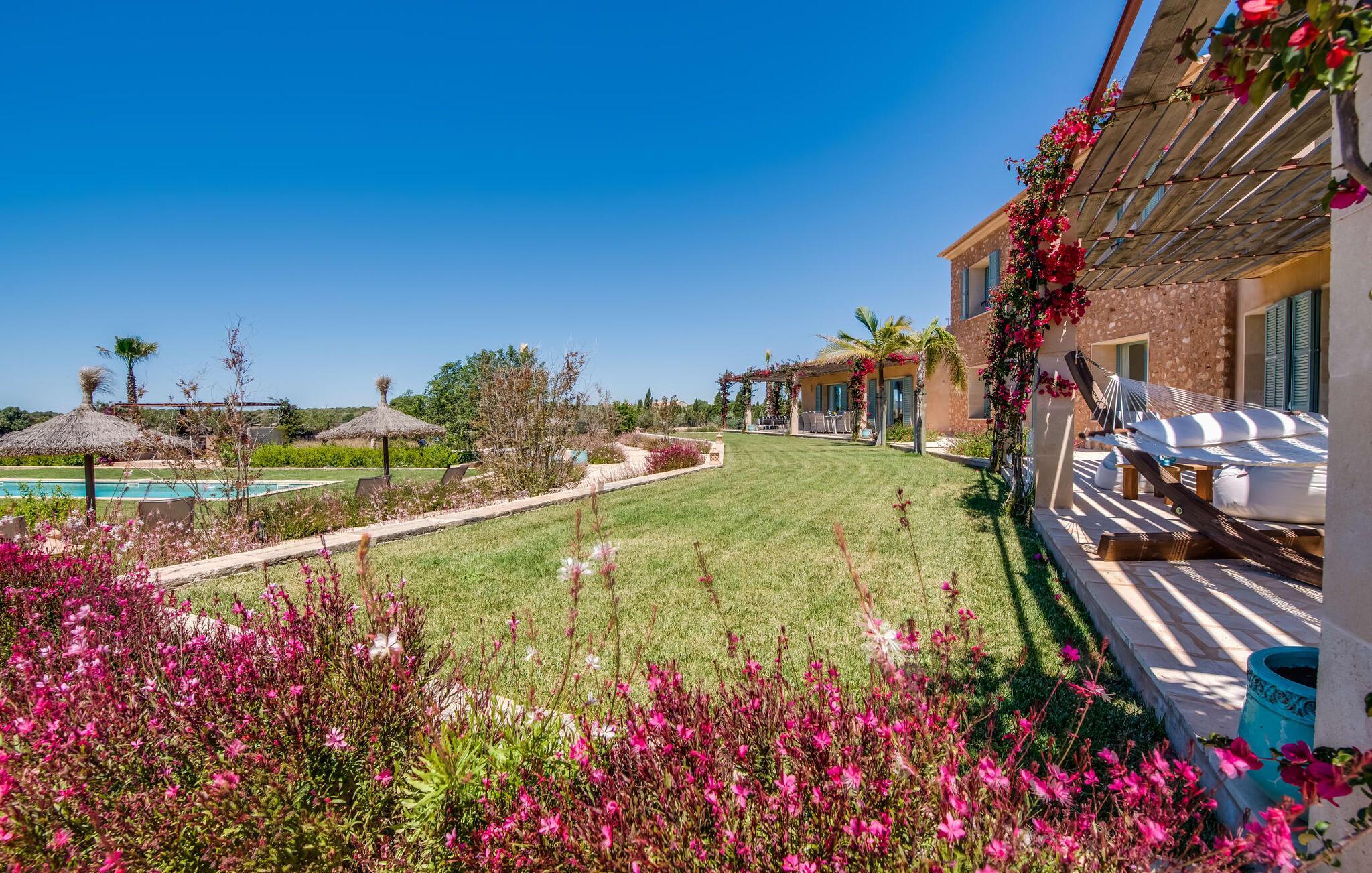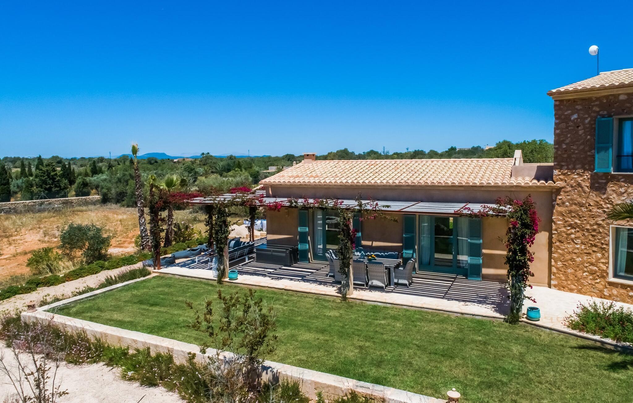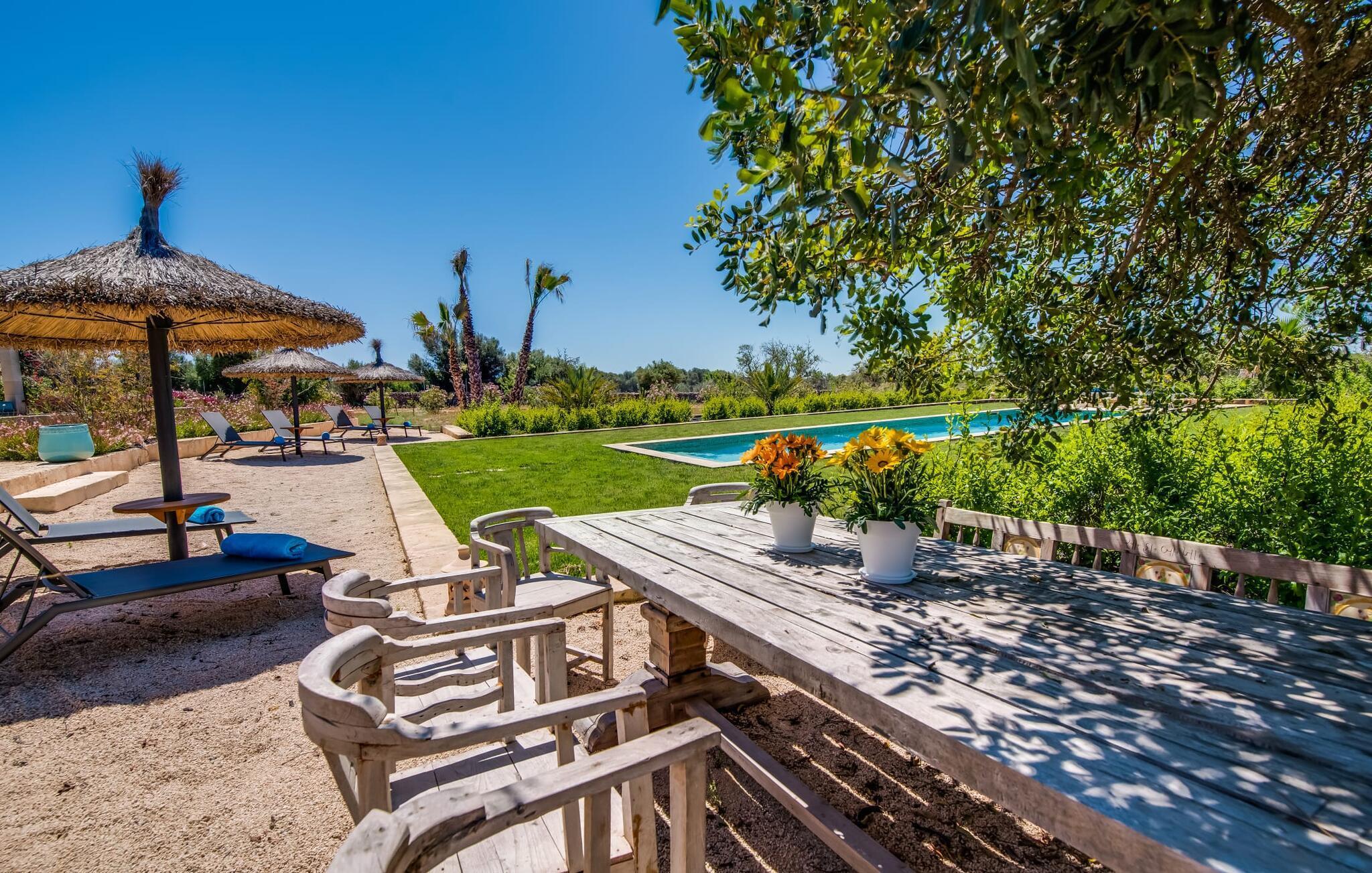 Malerisch und friedvoll gelegen ist dieses Finca-Schmuckstück mit dem idyllischen Namen, das sich in mediterraner Bauweise und mit viel Glas im Süden Mallorcas in die Sonne legt – so können Sie Ruhe und Privatsphäre so richtig genießen. Der langgestreckte Fitnesspool mit Sonnenliegen und Relaxbett verbindet sich mit dem zweistöckigen Hauptgebäude und seinen beiden Flügeln zu einem Pfeil und trifft zielsicher den Nerv von Gästen, die sich die Inselzeit mit luxuriösem Komfort versüßen wollen. Allein schon die umlaufende Bruchsteinterrasse mit ihrer luftigen Holzüberdachung, den hochwertigen Loungemöbeln und dem weiten Blick in die Landschaft macht "El Idilio" zu einem Vorzeigeobjekt, das Begeisterung weckt. Die Finca bietet viel Platz, um als Familie oder Gruppe, paarweise oder auch ganz für sich Zeit zu verbringen und Geselligkeit mit Rückzug und Tiefenentspannung zu verbinden. Auf Wunsch und gegen Gebühr werden außerdem Catering, Eventplanung, Fahrradverleih, Taxiservice, Beautybehandlungen und Restaurantreservierungen organisiert.