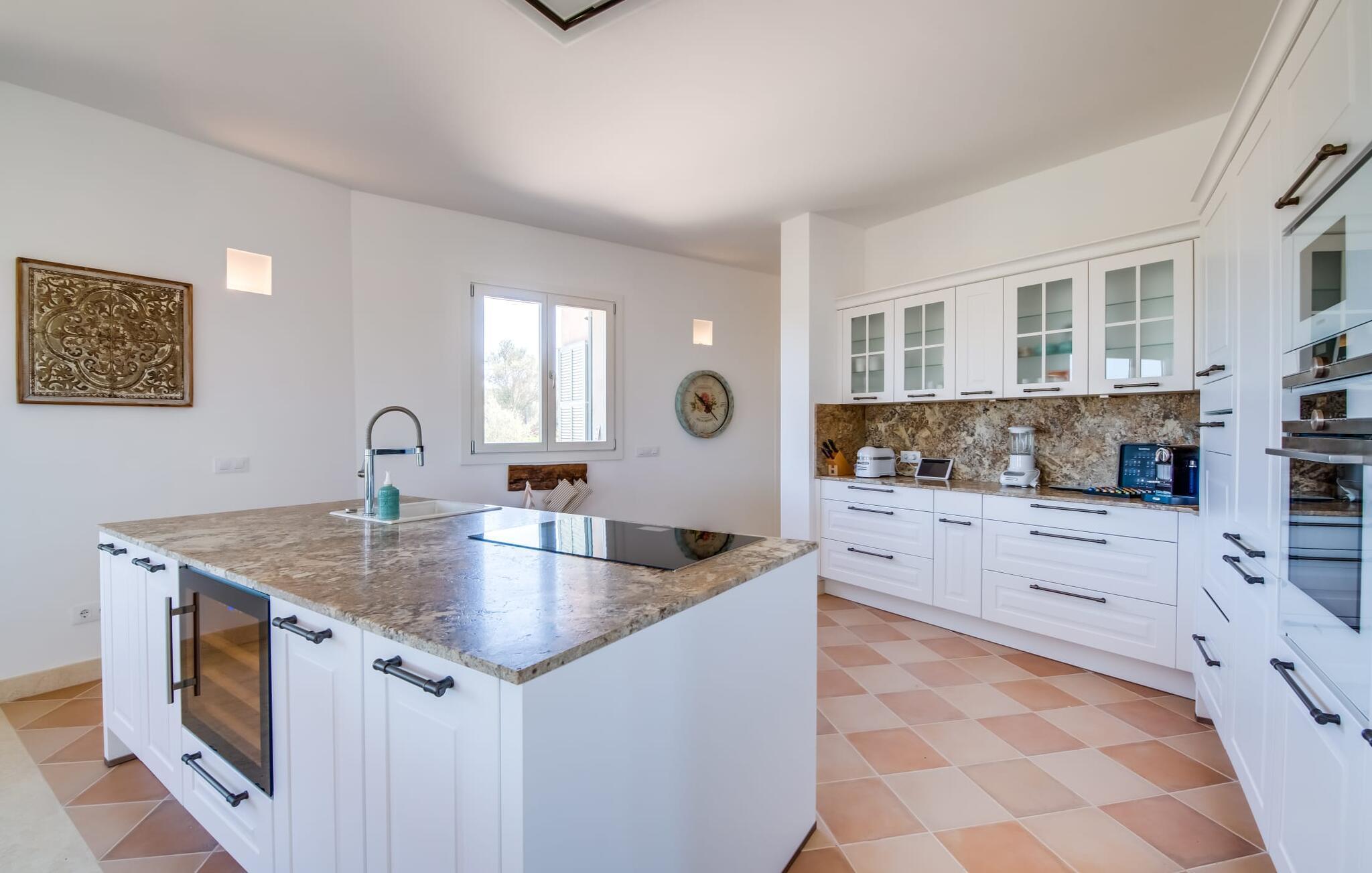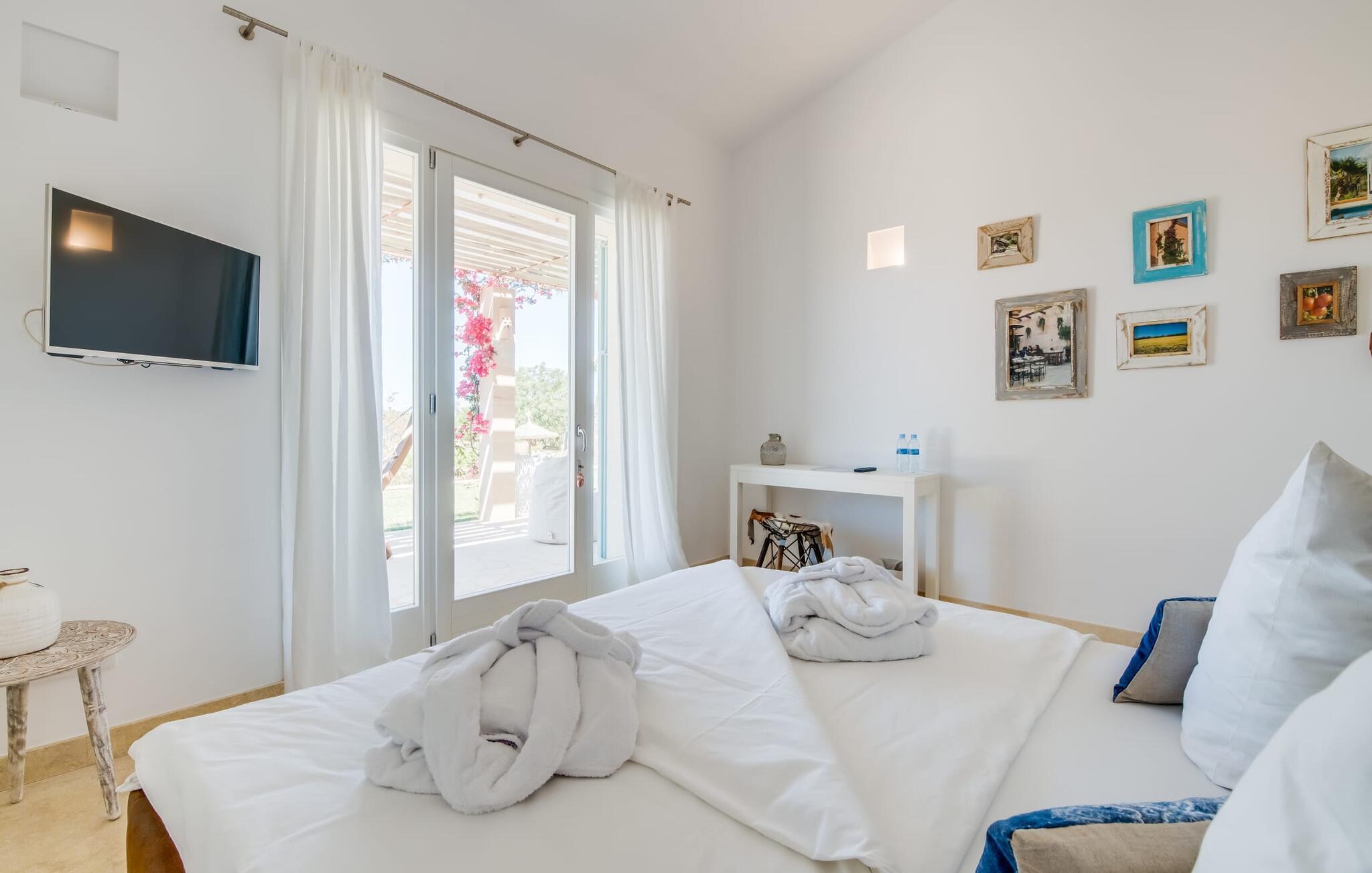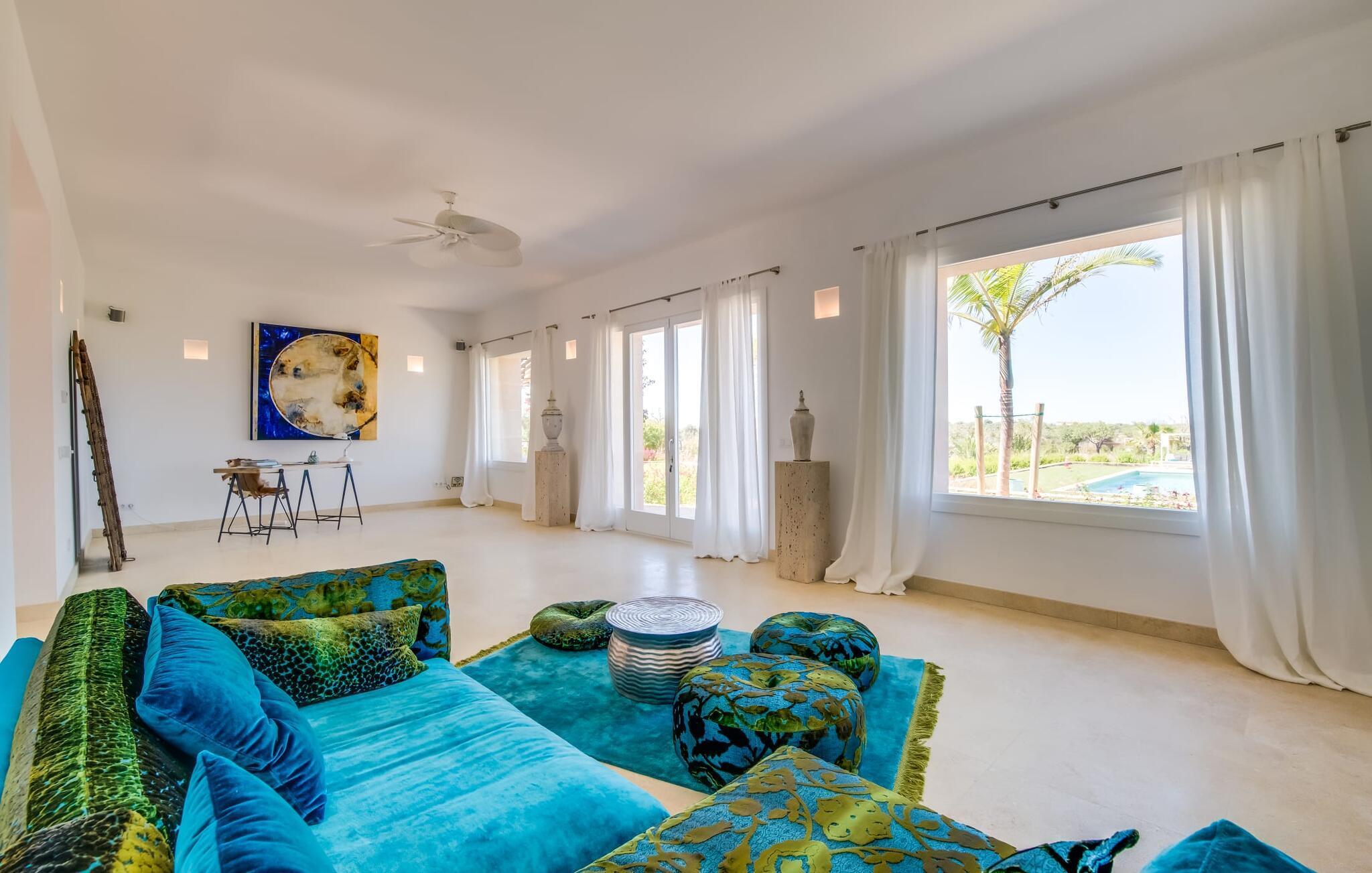 "El Idilio" setzt auch in seinen Innenräumen auf Licht, Luft und freien Raum! Puristisch und edel eingerichtet mit ausgefallenen Wohnobjekten und Accessoires bietet sich die Finca zum einen als stilvolle Urlaubsoase an, um Mallorcas Süden zu erkunden; zum anderen ist sie der ideale Ort, um Körper und Geist aufzutanken oder im Kreativteam Ideen zu entwickeln. Im Erdgeschoss gruppieren sich drei Doppelzimmer en Suite (Bettengröße 1,80 x 2 m) mit eigenem TV und Terrassenzugang. Fest an der Decke montierte Ventilatoren sorgen hier bei Bedarf ebenso für ein erfrischendes Lüftchen wie die im gesamten Haus und allen Schlafzimmern vorhandene Klimaanlage und Fußbodenheizung. Ein Gäste-WC und der Waschraum befinden sich ebenfalls im Erdgeschoss, dazu der zentrale, zweiteilige Wohnbereich: hier maritime Couchsurfing-Zone, dort Kaminlounge mit offener, professionell ausgestatteter Kochinsel. Unzählige Glasfronten lassen sich zu Garten und Pool hin öffnen und bringen das Outdoorfeeling ins Haus. Im Obergeschoss – der freundliche Diener in Livree zeigt Ihnen gern den Weg – wartet ein weiteres Doppelzimmer en Suite auf Sie (ebenfalls klimatisiert) und rückt von der Dachterrasse aus, das Meer und die Insel Cabrera ins Blickfeld. Für den richtigen Sound zum Sundowner sorgt eine Sonus Musikanlage, und auch ein Tablet steht zu Ihrer Verfügung, um den nächsten Ausflug zu planen …