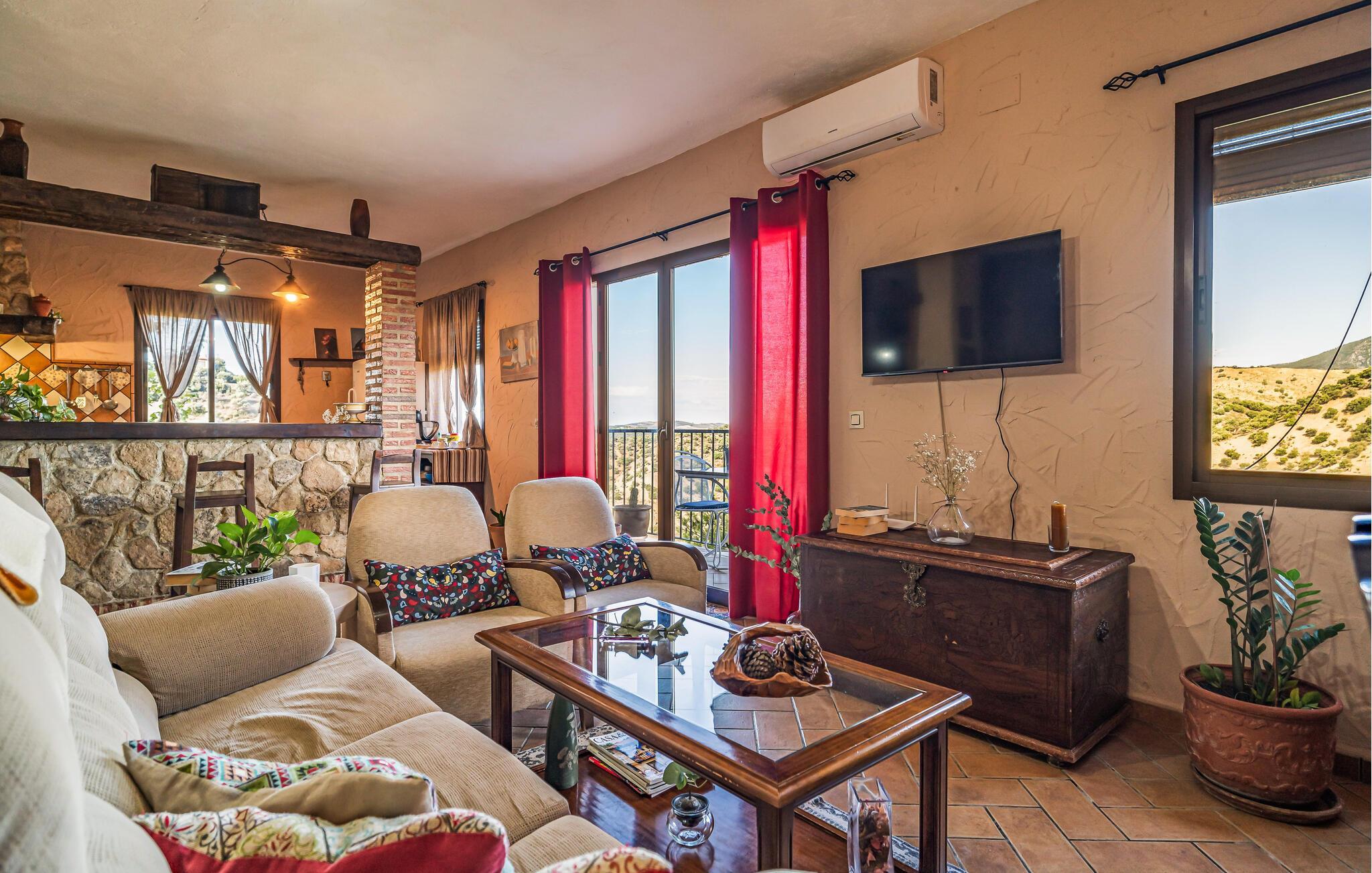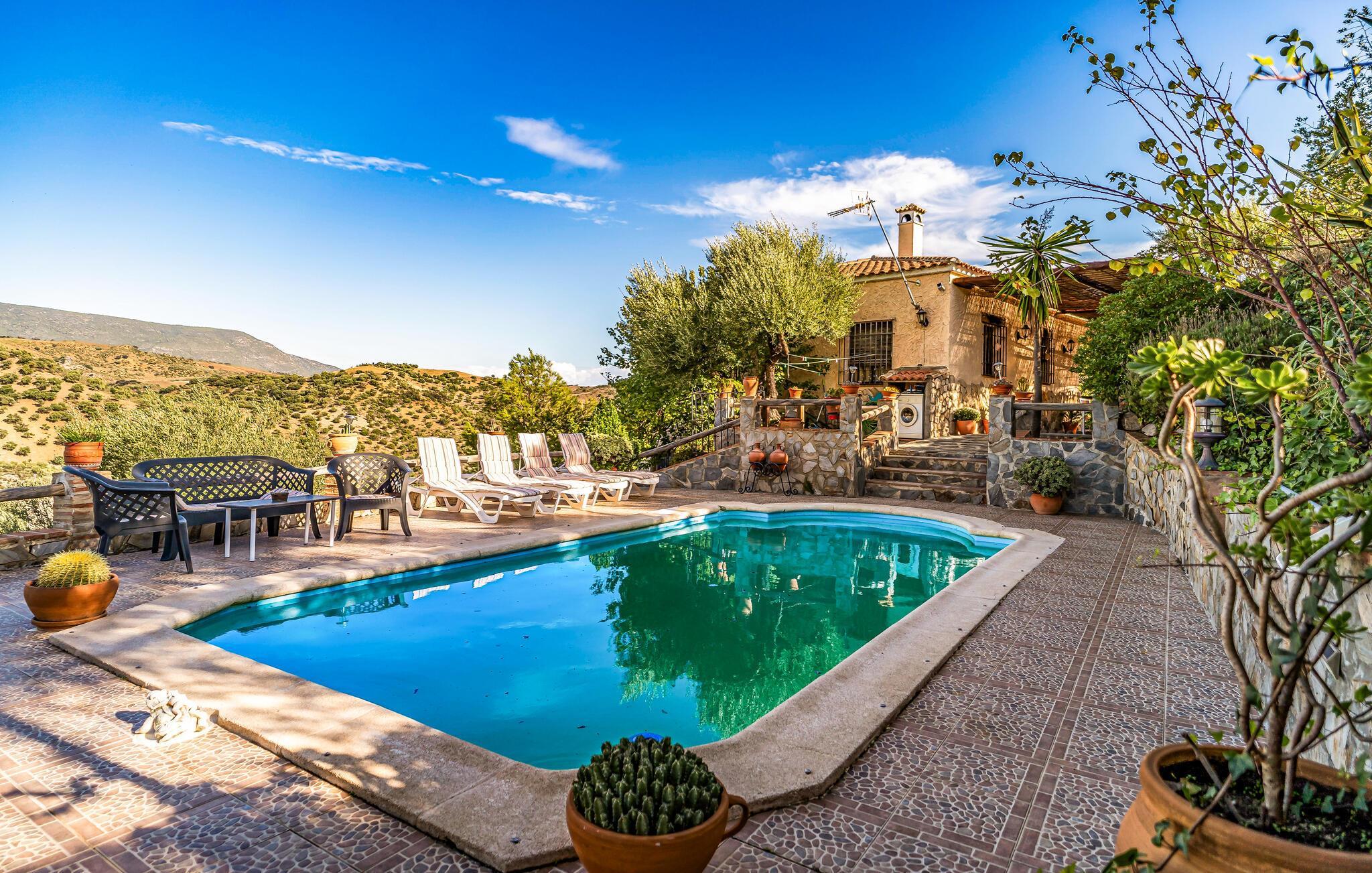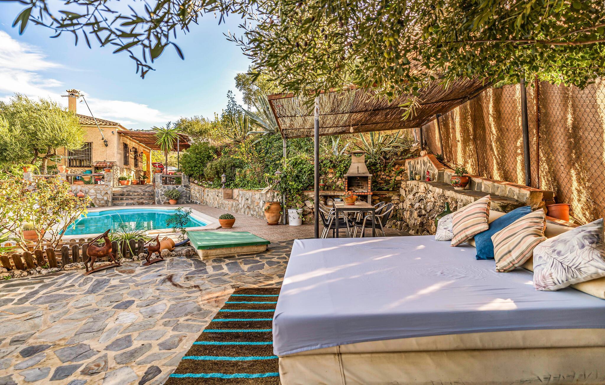 Dieses charmante und authentische Ferienhaus in El Jaral empfängt Sie mit einem gemütlichen, einladenden Ambiente und liebevollen Details. Der offene Wohnbereich und die traditionelle Einrichtung sorgen für eine heimelige Atmosphäre, die zur Entspannung einlädt. Lassen Sie Ihren Blick vom Balkon oder der Terrasse in die Ferne schweifen, während Sie sich im Tagesbett im Freien zurücklehnen oder im privaten Pool erfrischen. Abends bietet sich die Terrasse perfekt für gesellige Mahlzeiten unter freiem Himmel an.