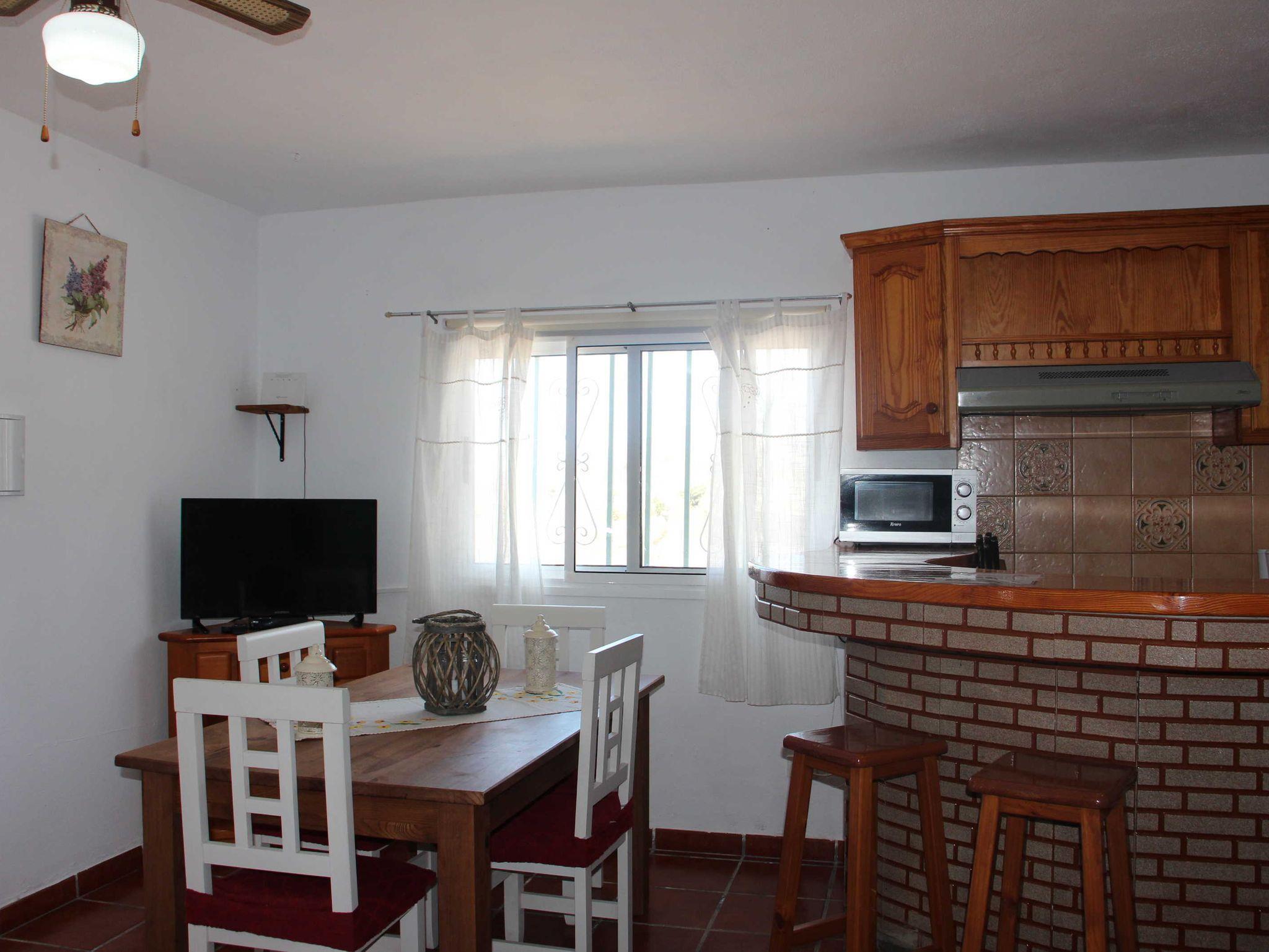 Man betritt das Haus über den kombinierten Wohn-/Essbereich mit integrierter Küchenzeile. Am Esstisch finden bequem 4 Personen Platz. Die Küchenzeile ist klein, aber gut ausgestattet. Eine Theke mit 4 Hockern trennt die Küche vom Essbereich. Eine kleine Fernsehecke mit Sofa und SAT-TV sind ebenfalls hier. Ein zweiter Wohnbereich mit Kamin liegt separat.